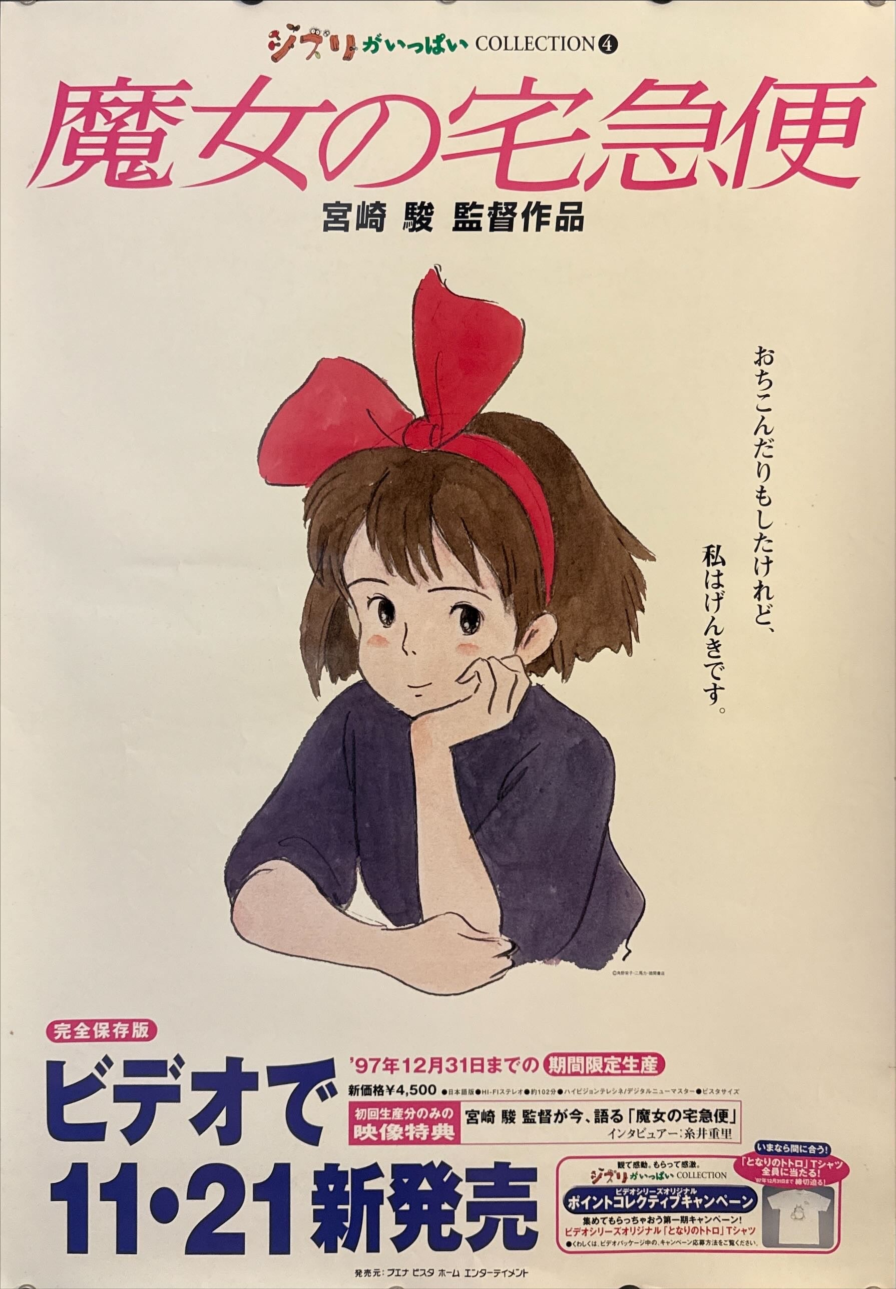 This is an original Japanese B2 promotional poster issued on 11/21/1997 for the limited “Ghibli ga Ippai COLLECTION ④” VHS release of Hayao Miyazaki’s Kiki’s Delivery Service (魔女の宅急便). Produced by Studio Ghibli and distributed by Buena Vista Home Entertainment Japan, this campaign edition advertised the time-limited manufacturing run (through Dec 31, 1997) and first-press bonus video content with the director discussing Kiki.