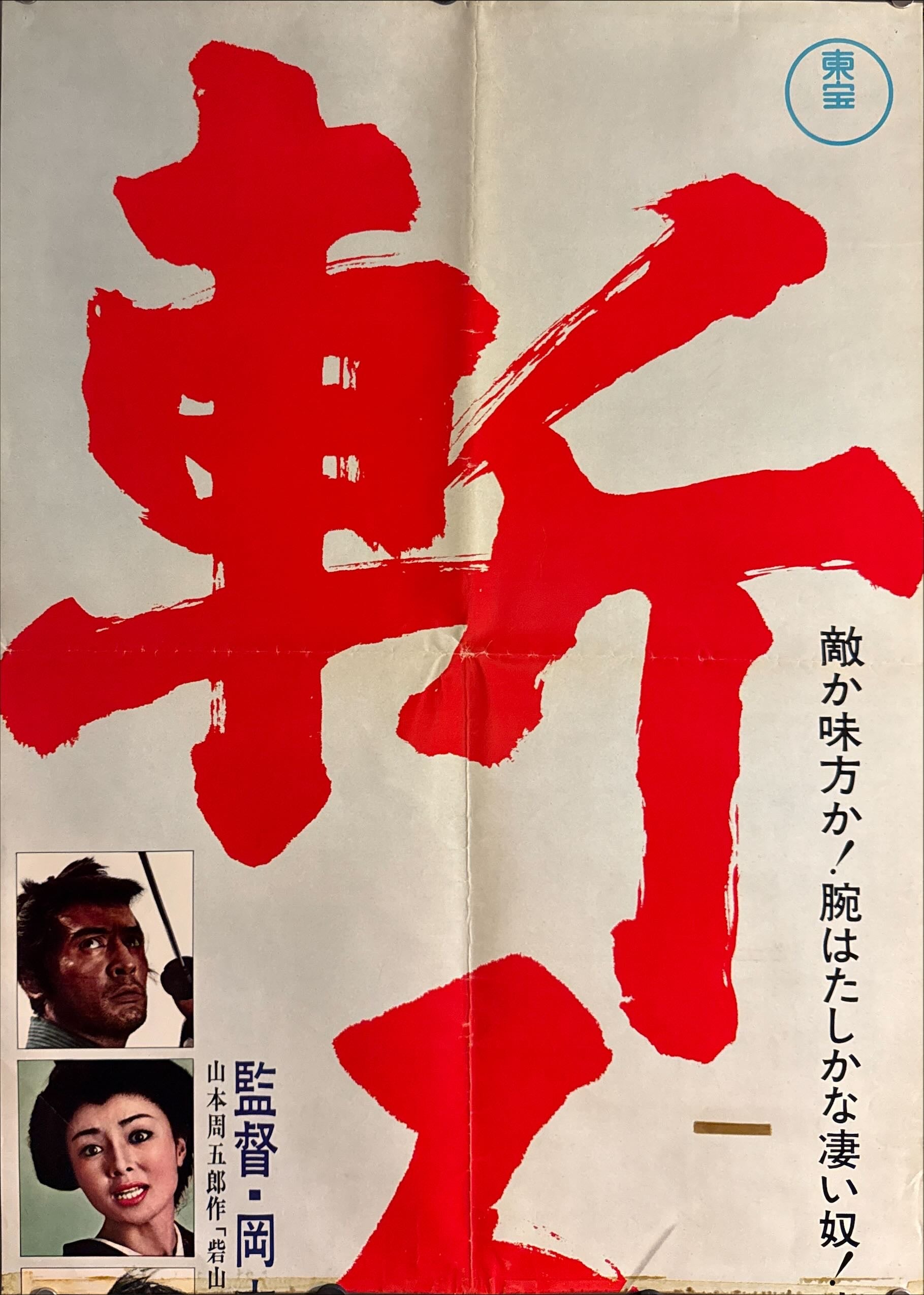 This striking STB Tatekan format (approximately 51 × 145 cm) was traditionally displayed outside Japanese cinemas and is composed of two B2‑sized sheets joined vertically. Dominating the design is a huge, brush‑stroked red kanji 斬 (“to cut/slash”) that runs almost the full length of the poster, visually echoing the film’s title and swordplay. Smaller photo panels down the left side showcase Tatsuya Nakadai and his co‑stars, while the lower section explodes into an action scene with Nakadai’s Genta mid‑swing as bandits and samurai clash in a dusty valley. Toho’s blue circular logo sits discreetly at the top, and the vertical Japanese copy along the right edge teases whether this deadly swordsman is friend or foe. The tall, calligraphic layout epitomises late‑1960s Japanese design and makes a dramatic display piece.