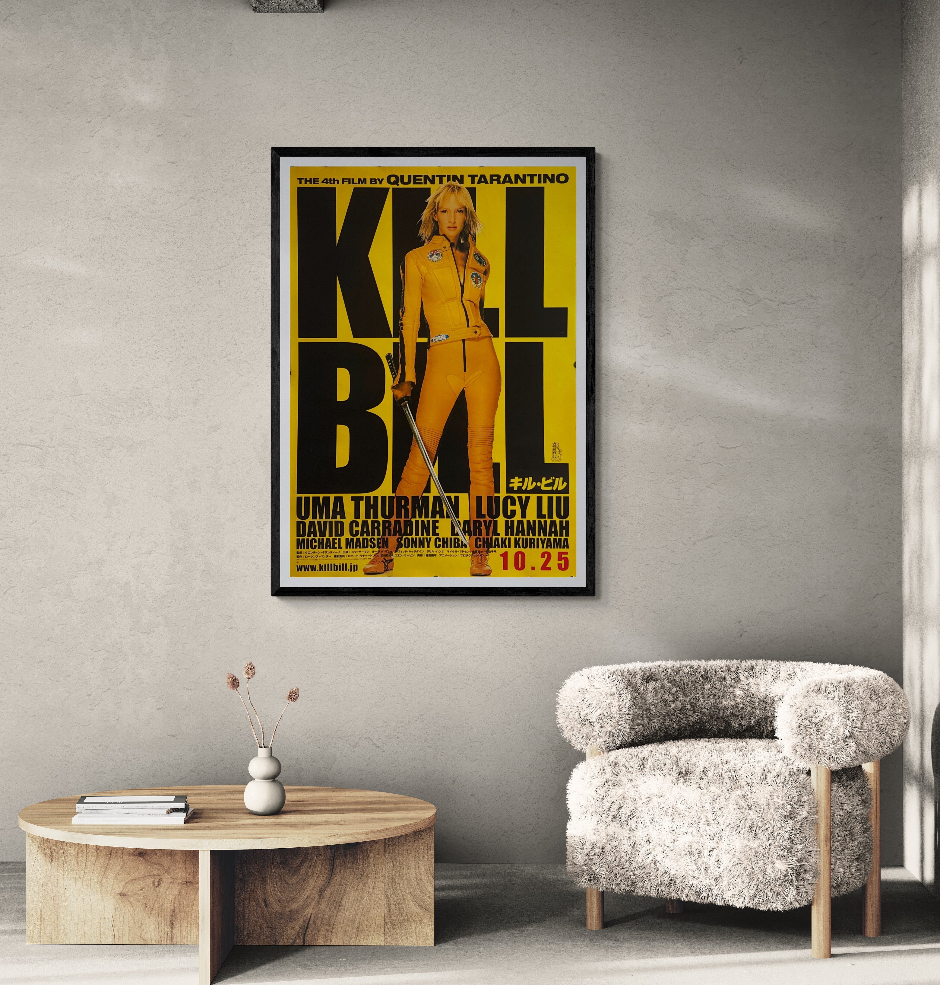 This Japanese B1 is the definitive “yellow suit” key art: Uma Thurman stands full-length in the Bruce Lee–inspired tracksuit, katana in hand, against a high-impact field of saturated yellow with colossal black typography spelling KILL BILL. The layout is pure graphic confidence—minimal, confrontational, and built for instant recognition from across a room. Japanese release details (including the bold date block) and the cast line (Thurman, Liu, Carradine, Hannah, Madsen, Sonny Chiba, Chiaki Kuriyama) ground it firmly as original Japanese first-release campaign material.
