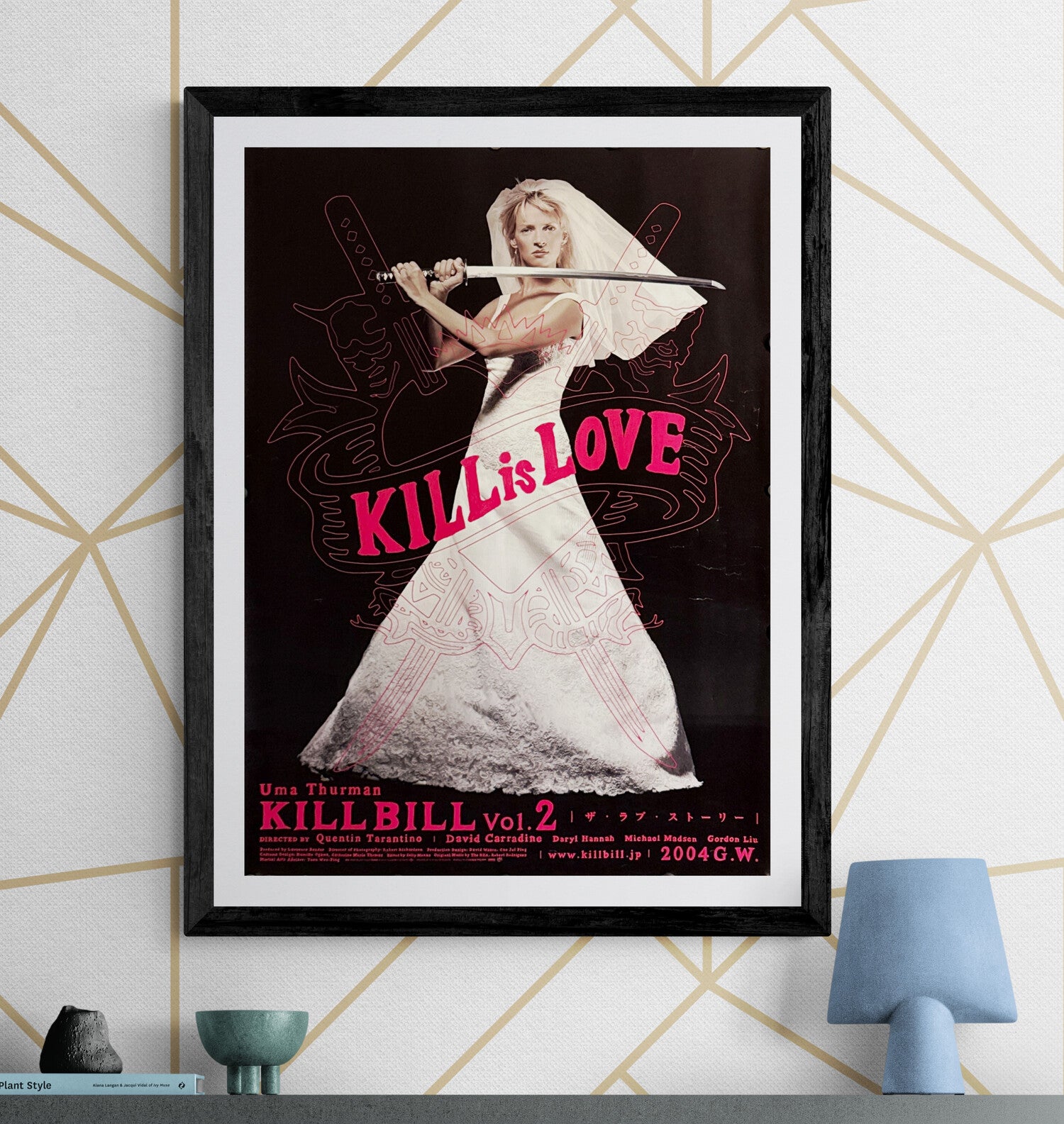 This is the iconic Kill Bill image—arguably the most recognisable poster of the entire campaign. Against a deep black field, The Bride stands in stark bridal white, katana held ready, her veil lifting like a warning flag. Across her body, the bold hot-pink “KILL is LOVE” slogan lands with graphic certainty, while the faint pink line-art of crossed swords and tribal flourishes forms a ghostly emblem behind her—like a crest for Tarantino’s pulp mythology. The bottom typography is crisp and minimal: KILLBILL Vol.2 in hot pink, cast and director credit line, the Japanese subtitle 「ザ・ラブ・ストーリー」, and the original-era web and “2004” release notation. Clean, ruthless, and instantly frame-worthy—this is the design collectors mean when they say “the Kill Bill poster.”