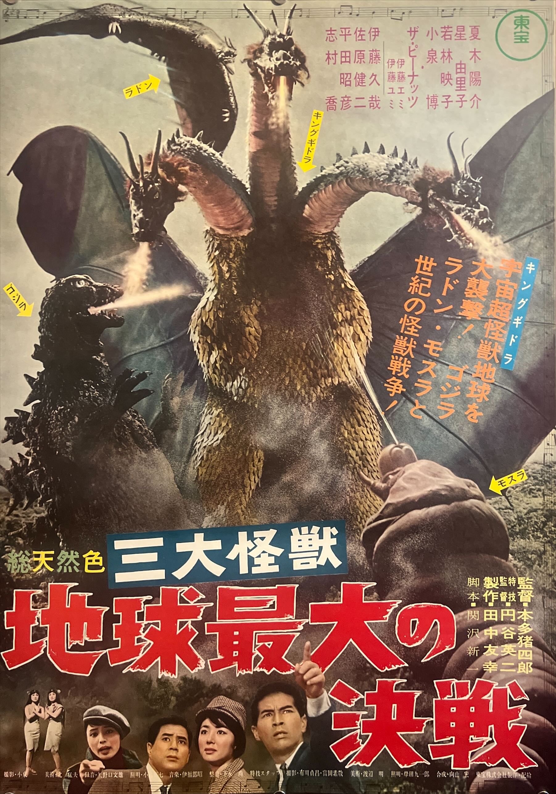 The wonderful Japanese theatre-poster touch: yellow arrow labels naming each monster on the artwork (ゴジラ / ラドン / キングギドラ / モスラ), giving the sheet a lively “guide map” feel.