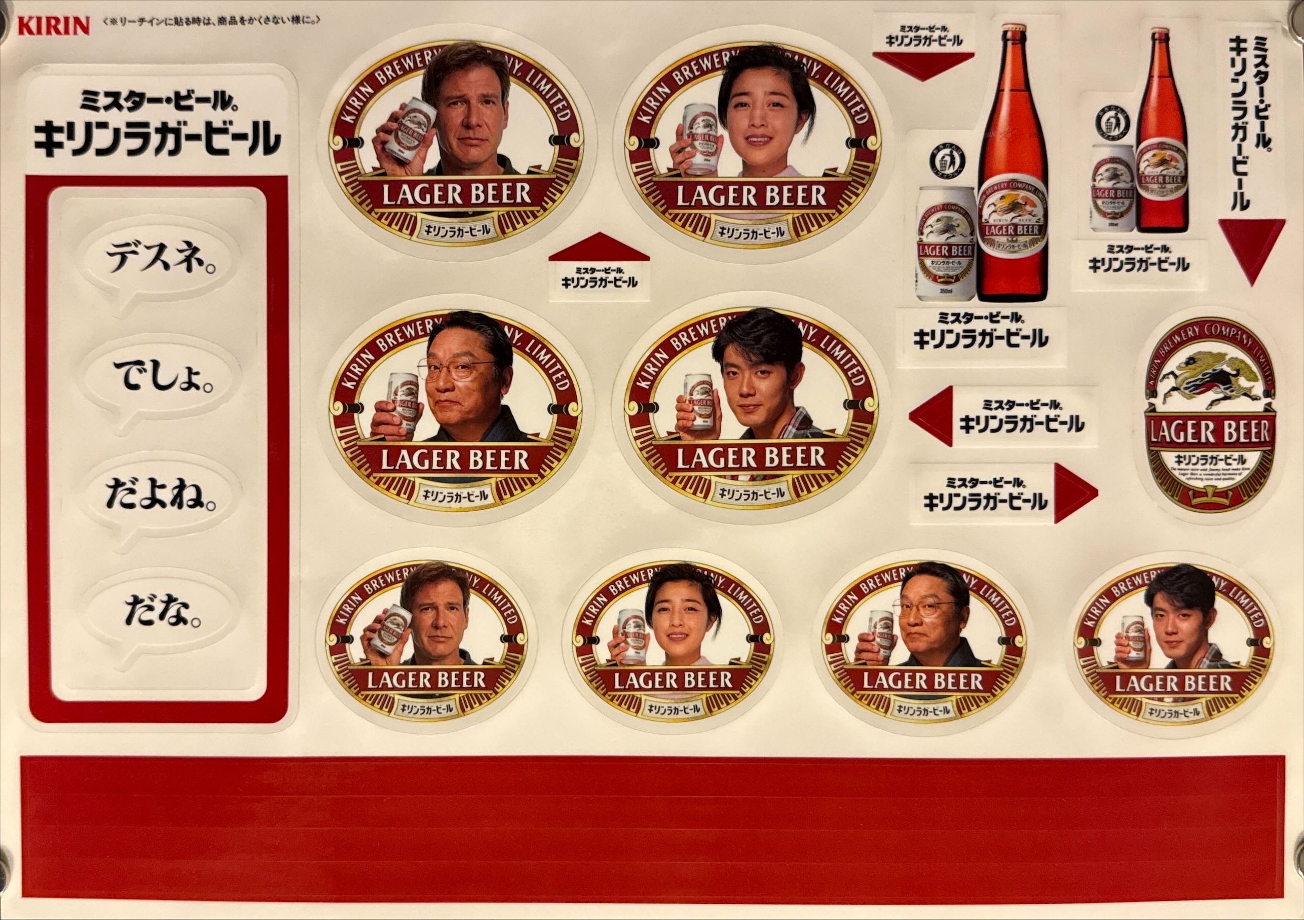 Unused, die‑cut store stickers from the same campaign: large “LAGER BEER” crests with the campaign talent portraits, bottle/can pack‑shots, directional arrows, vertical tagline slugs 「ミスター・ビール。キリンラガービール」, bold shelf stripes, and four speech‑bubble decals reading 「だな。」「だよね。」「でしょ。」「デスネ。」 (casual affirmations like “Right.” / “Exactly.”). The original release liner/protective sheet is present—shapes are intact and unpeeled.