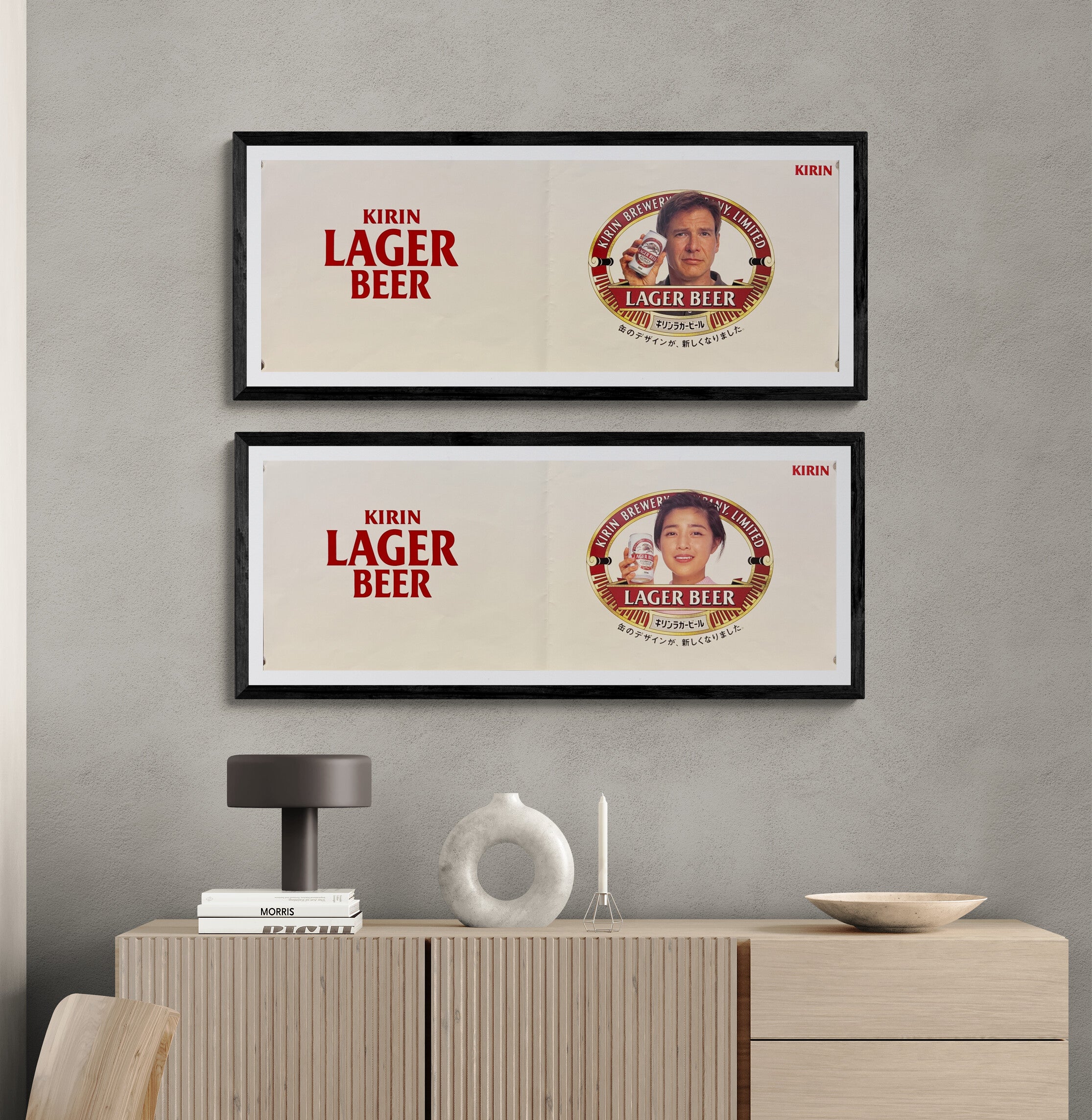 A rare, nostalgia‑rich 1994 Kirin Lager Beer POP set—two striking banner posters with their original promotional stickers—preserved from Japan’s golden age of beer advertising.