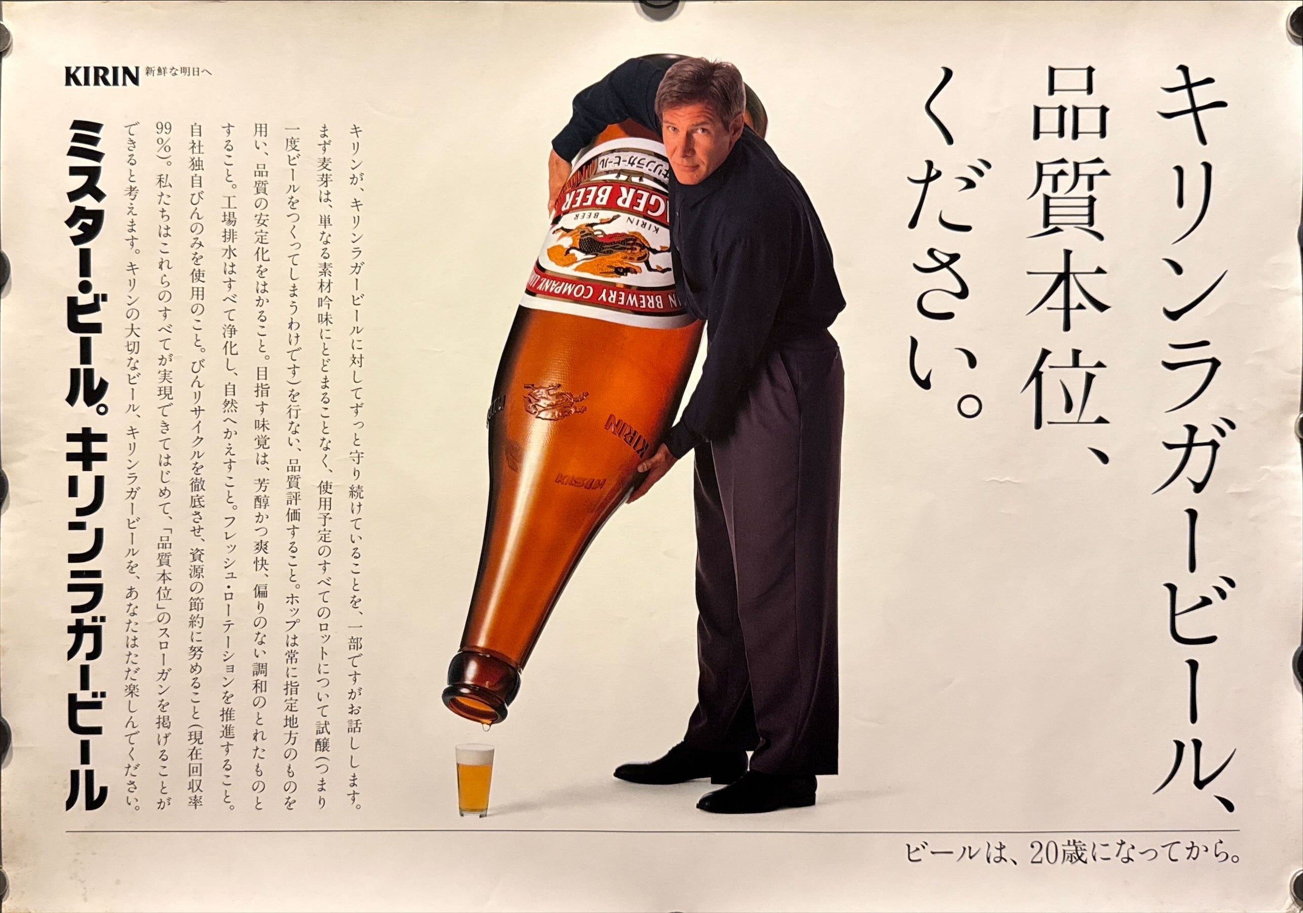 A rare, nostalgia‑rich 1993 Kirin Lager nakazuri starring Harrison Ford—a pristine rail‑display (非売品) survivor from Japan’s golden age of beer advertising.