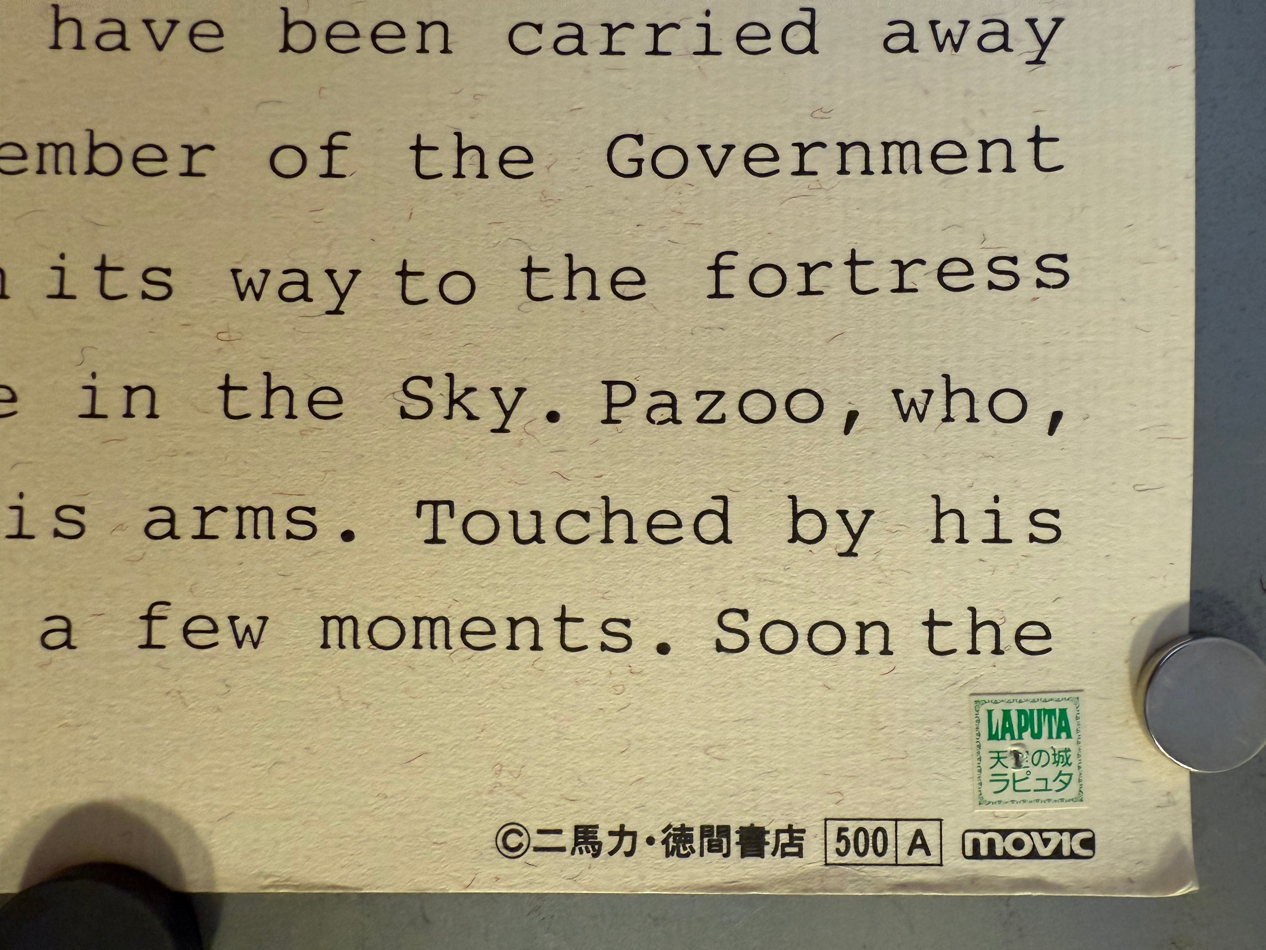 This is an original Japanese promotional B2 poster printed in 1986 for the first theatrical release of Hayao Miyazaki’s Laputa: Castle in the Sky (天空の城ラピュタ). Issued by Nibariki / Tokuma Shoten for domestic publicity and distributed as a promotional piece (not an in-cinema movie poster), it’s scarcer than the standard theatrical sheets and highly collectible among early Ghibli materials.