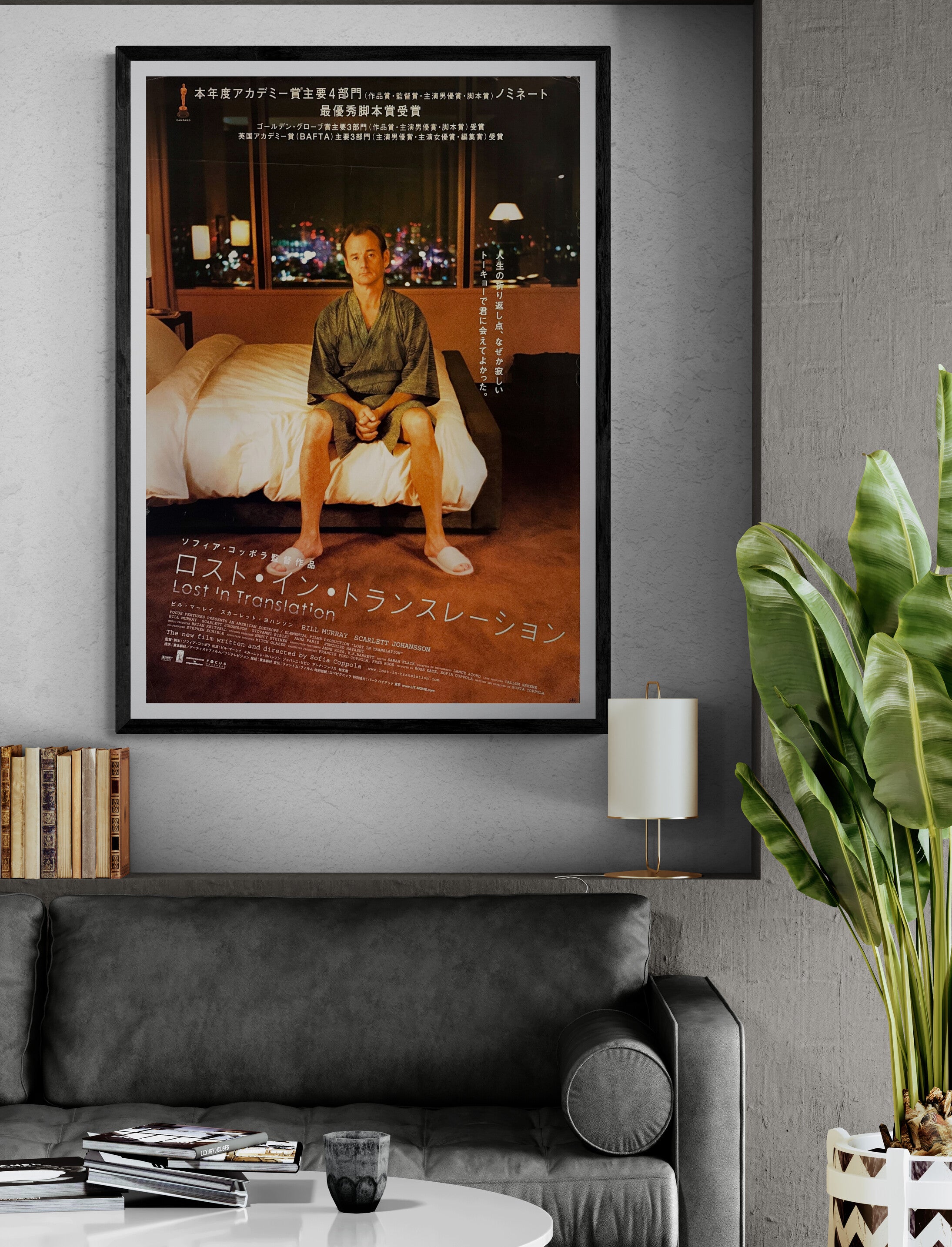 This B1 design uses one of the film’s most iconic images: Bob Harris sitting in a yukata on the edge of his hotel bed, framed by the glowing night skyline of Shinjuku through the window behind him. The warm amber tones of the room contrast with the blurred, electric city lights outside, perfectly capturing the film’s mood of jet‑lagged isolation and quiet longing. Japanese text across the top highlights the film’s major award nominations and wins, while the title ロスト・イン・トランスレーション and English logo run elegantly along the bottom. The large B1 format gives the image real impact on the wall, immersing you in the stillness of that hotel room.