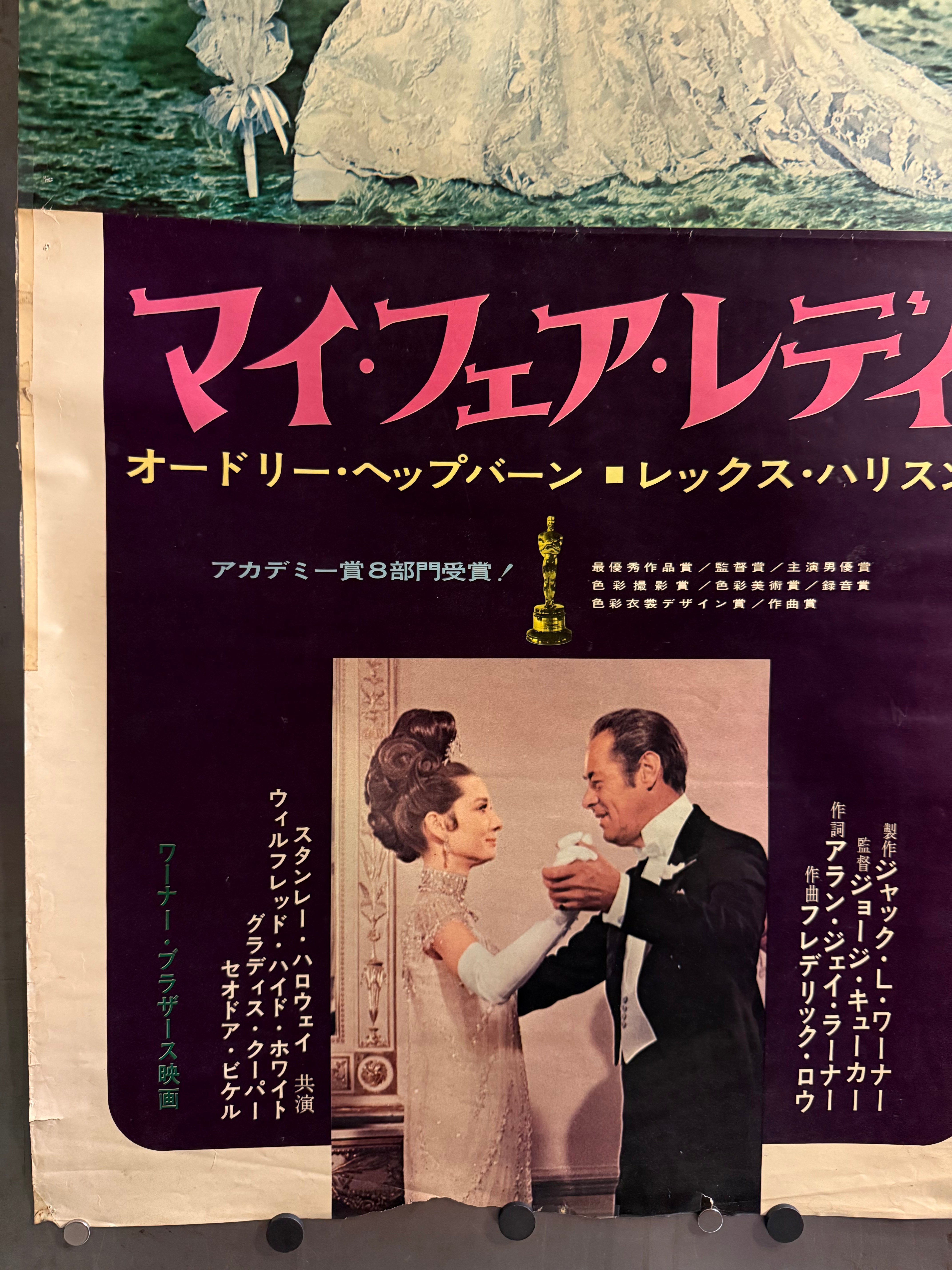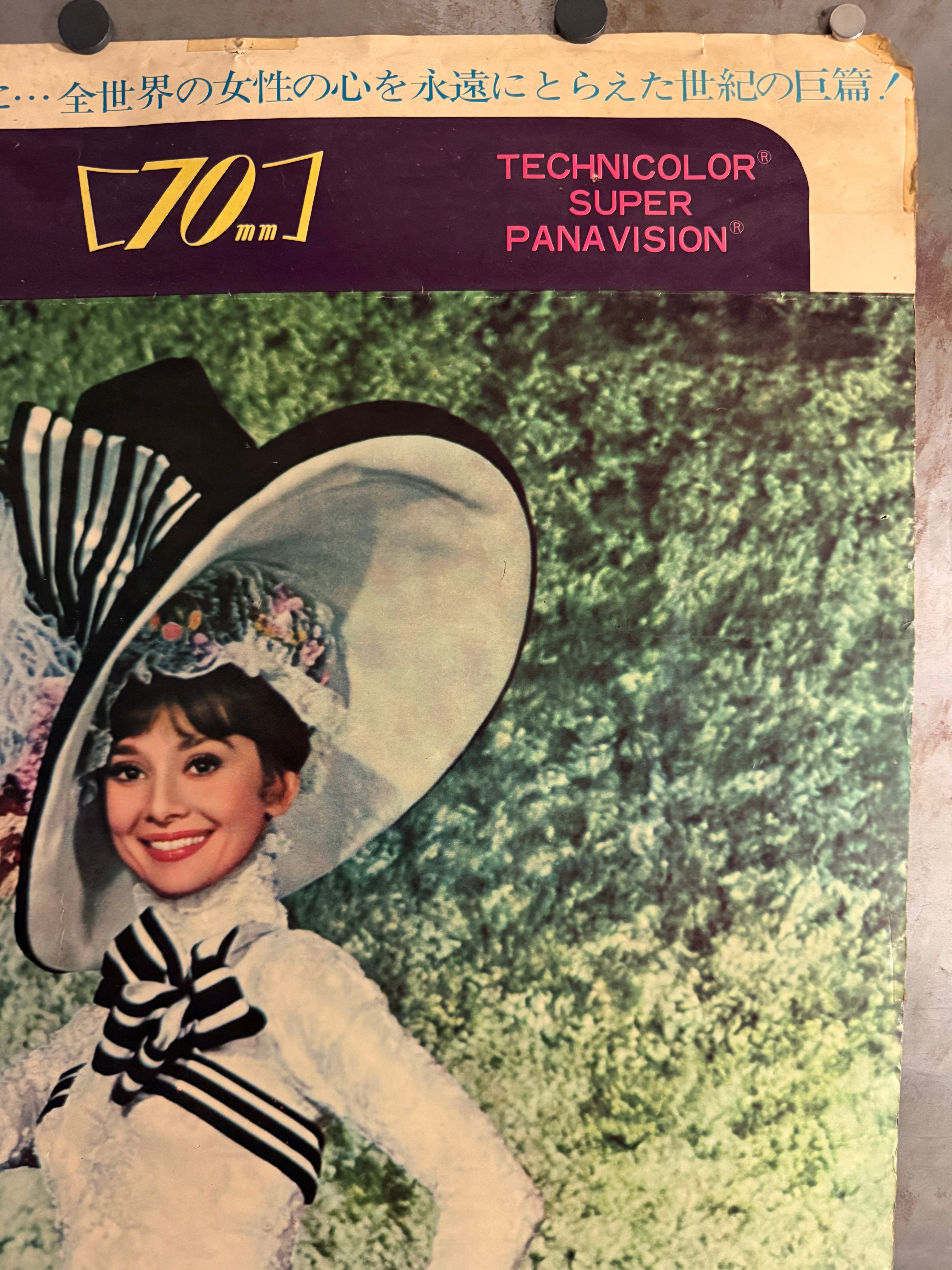 This is an original Japanese STB tatekan (two-panel standing) poster issued in Japan for a 1969 theatrical re-release of My Fair Lady (1964), George Cukor’s lavish screen adaptation of the Lerner & Loewe musical—starring Audrey Hepburn as Eliza Doolittle and Rex Harrison as Professor Higgins (with Stanley Holloway and Wilfrid Hyde-White).