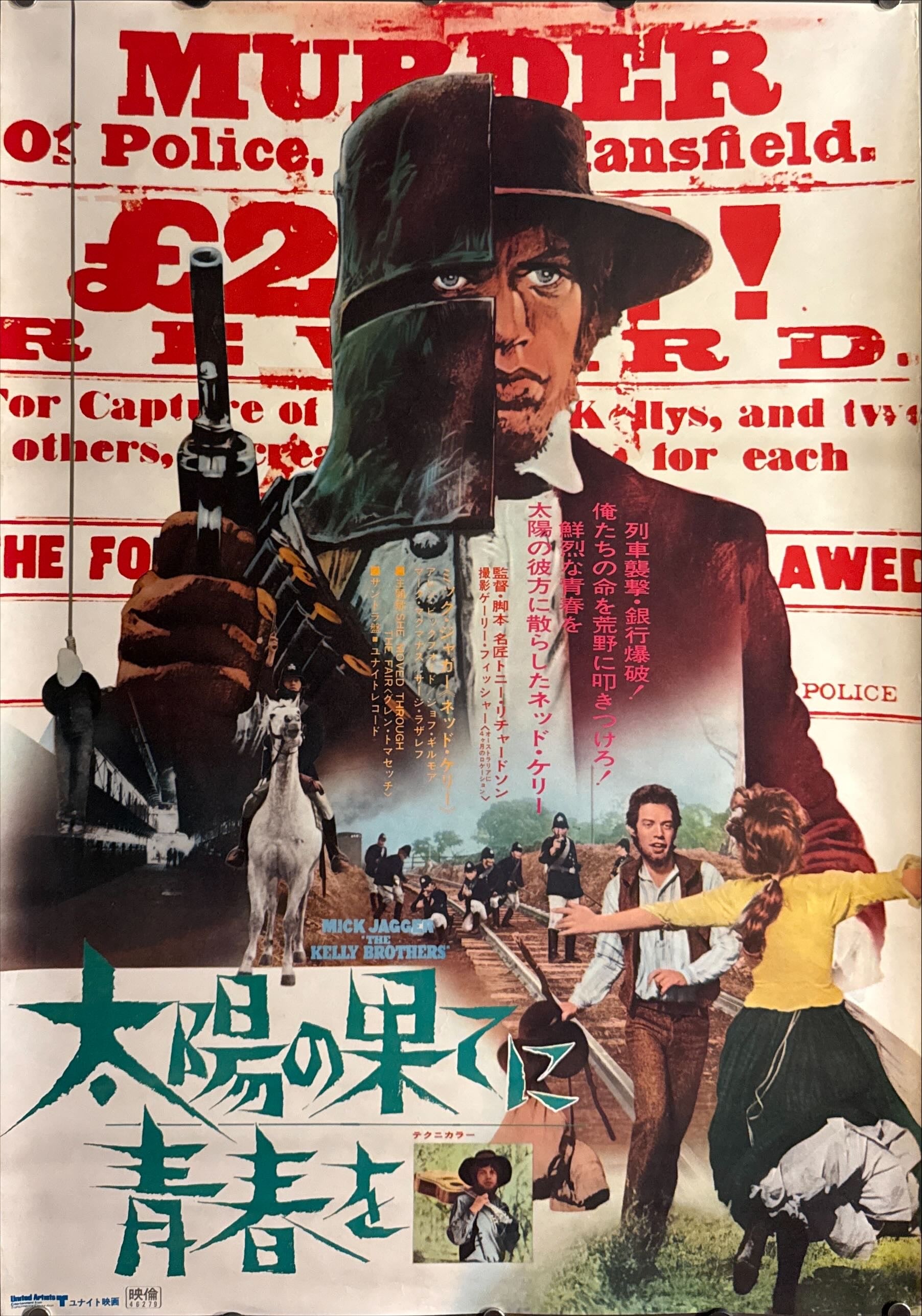The Japanese B2 features a striking collage. A wanted‑poster style backdrop blares “MURDER” and “REWARD” in distressed red lettering, while down the centre runs a split portrait: on one side a metal‑masked outlaw, on the other Jagger’s face, merging mythic bandit and pop star. Below, images of train raids, horseback chases and fleeing lovers evoke frontier adventure. The Japanese title “太陽の果てに青春を” (“Youth at the Ends of the Sun”) is rendered in jagged turquoise brushstrokes at the bottom, with a small credit block highlighting Jagger and the Kelly brothers.