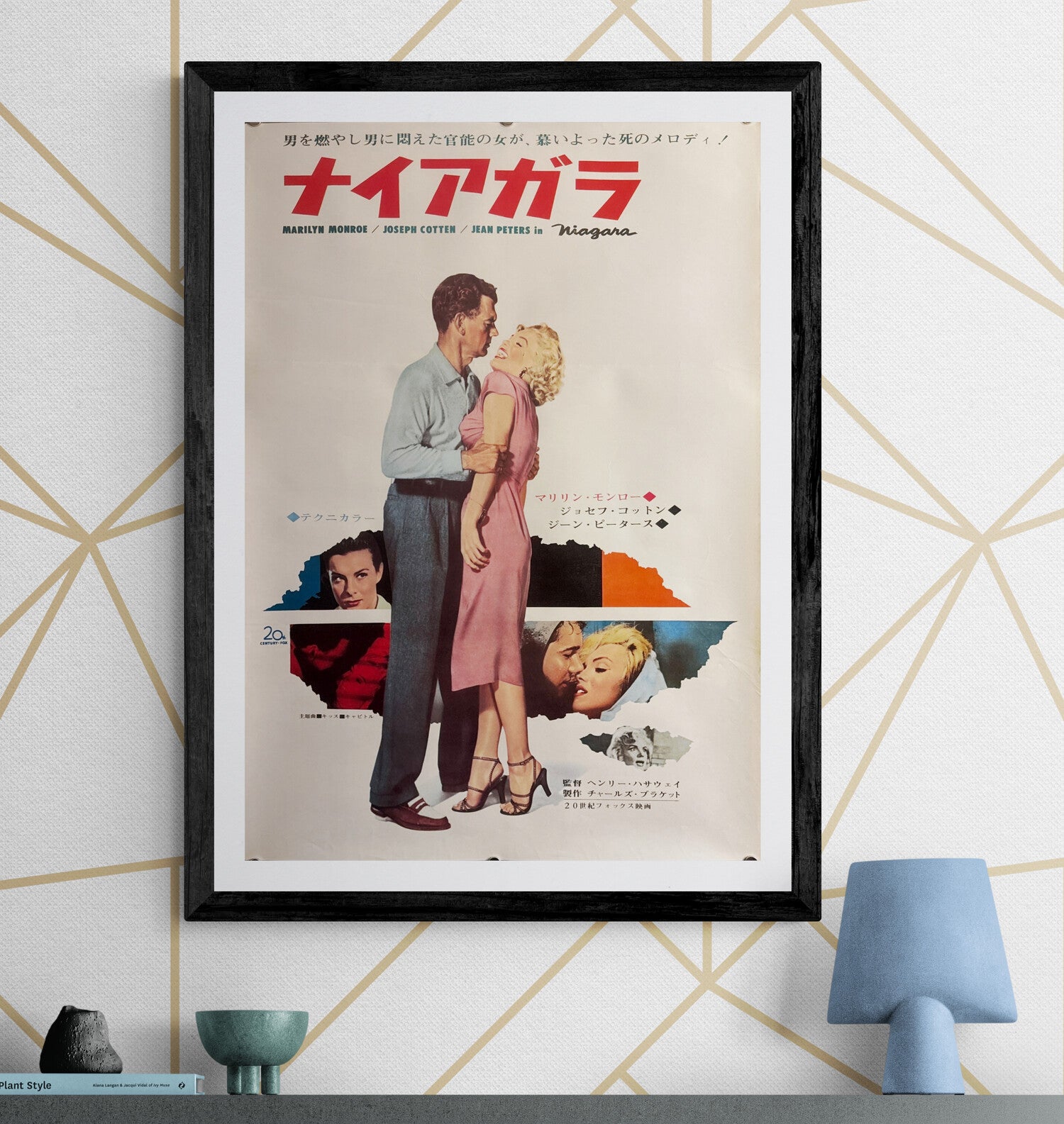 This is an original Japanese B2 poster issued in Japan for a 1962 theatrical re-release of Niagara—the 1953 Technicolor noir-thriller directed by Henry Hathaway, starring Marilyn Monroe, Joseph Cotten, and Jean Peters. One of Monroe’s most iconic early dramatic performances, Niagara blends glossy, postcard-bright location spectacle with simmering jealousy, violence, and fatalism.