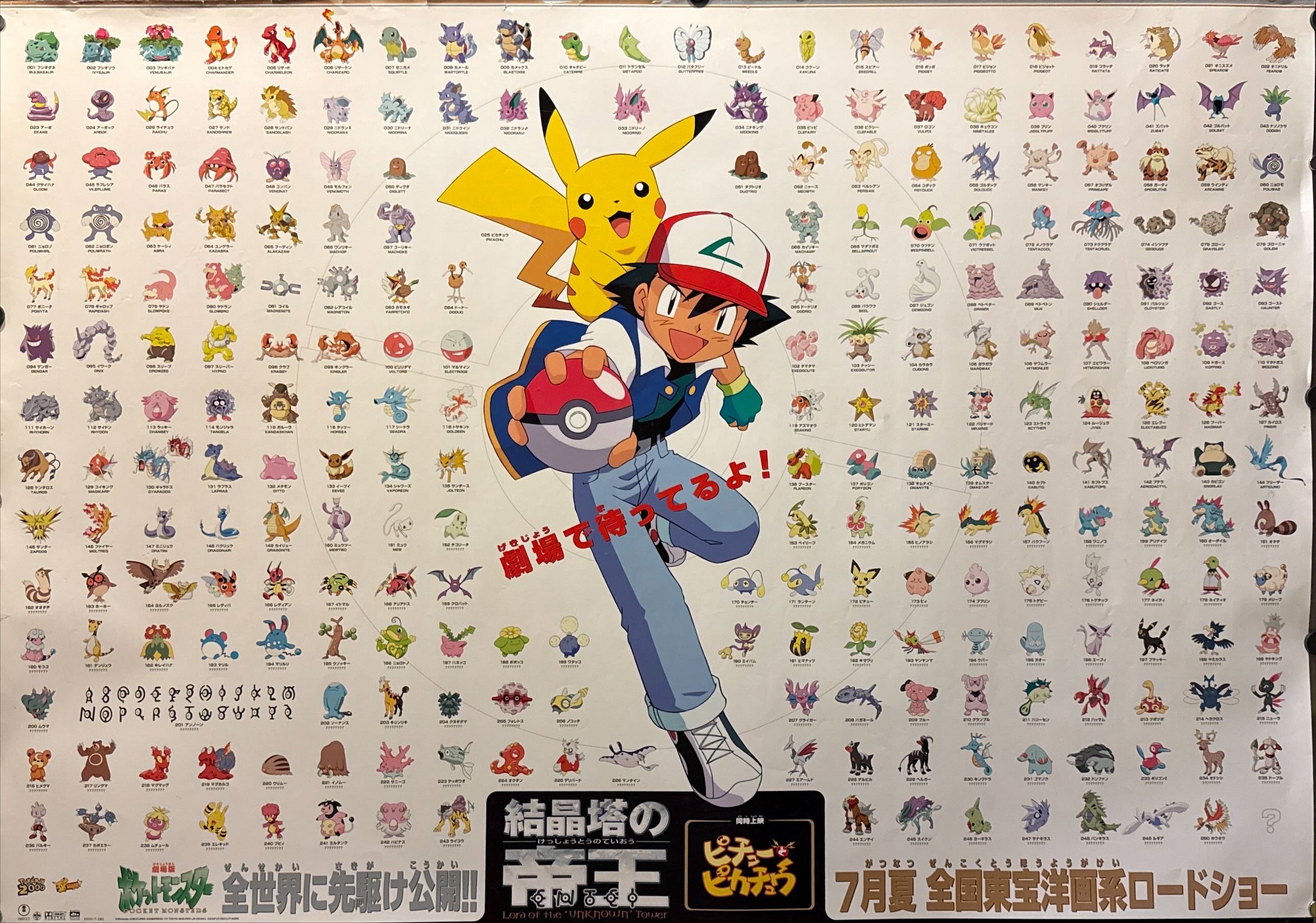 The oversized B1 artwork is dominated by a dynamic image of Ash and Pikachu charging forward with a Poké Ball, overlaid with bold red Japanese text inviting viewers to “come to the cinema”. Surrounding them, the border is packed with all then‑known 251 Pokémon from Bulbasaur onward, each shown with number and name, including Johto favourites, baby forms like Pichu, Elekid and Smoochum, the Unown forms, and legendaries such as Entei, Suicune, Raikou, Lugia and Ho‑Oh. At the bottom centre, a black title block carries the silver Japanese logo “結晶塔の帝王” with Unown lettering and the English subtitle “Lord of the ‘UNKNOWN’ Tower”, while a matching panel promotes the companion short “ピチューとピカチュウ”. Additional copy along the lower edge announces a summer nationwide Toho roadshow and trumpets Japan’s world‑first release, flanked by the Pokémon 2000 and Pikachu the Movie 2000 logos. The dense Pokédex‑style layout and large B1 size make this one of the most striking and displayable theatrical Pokémon posters from the era.