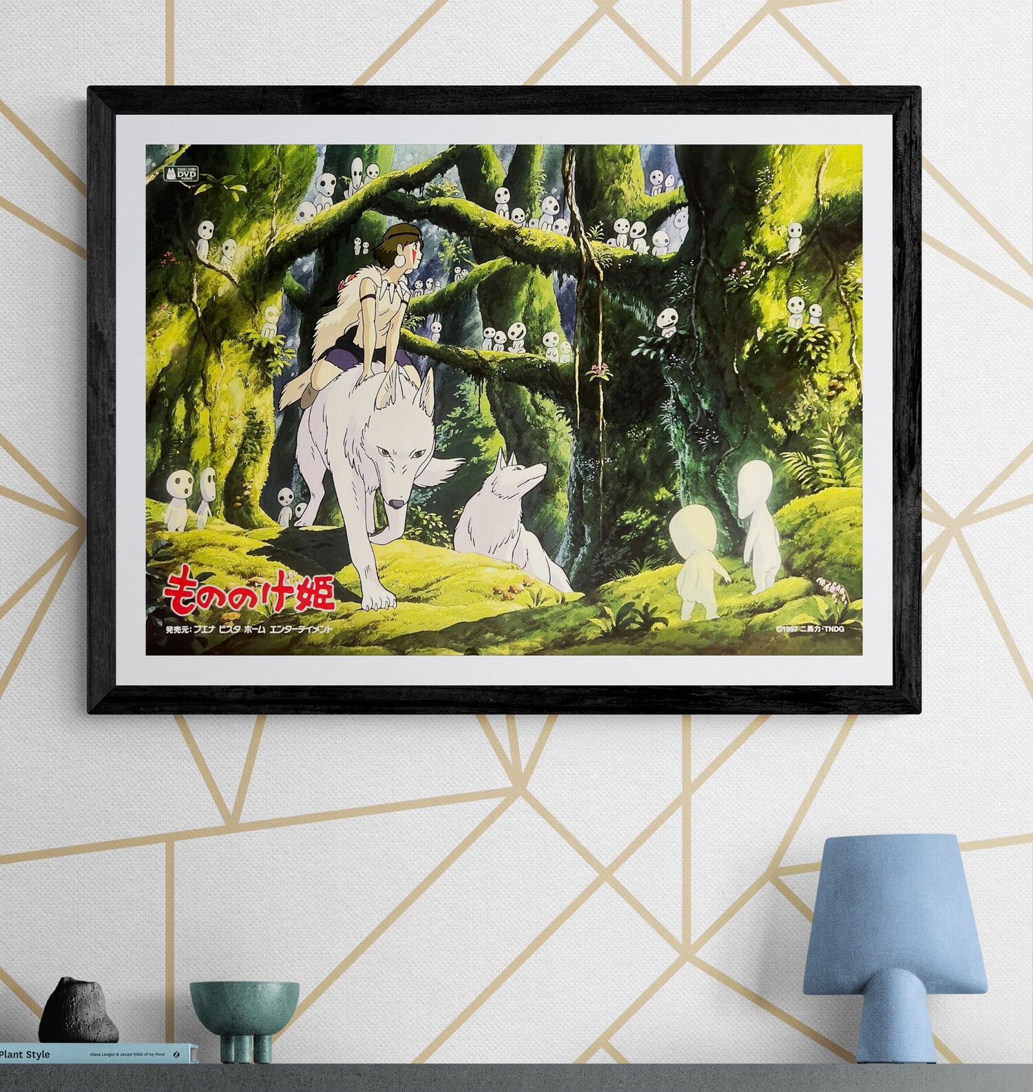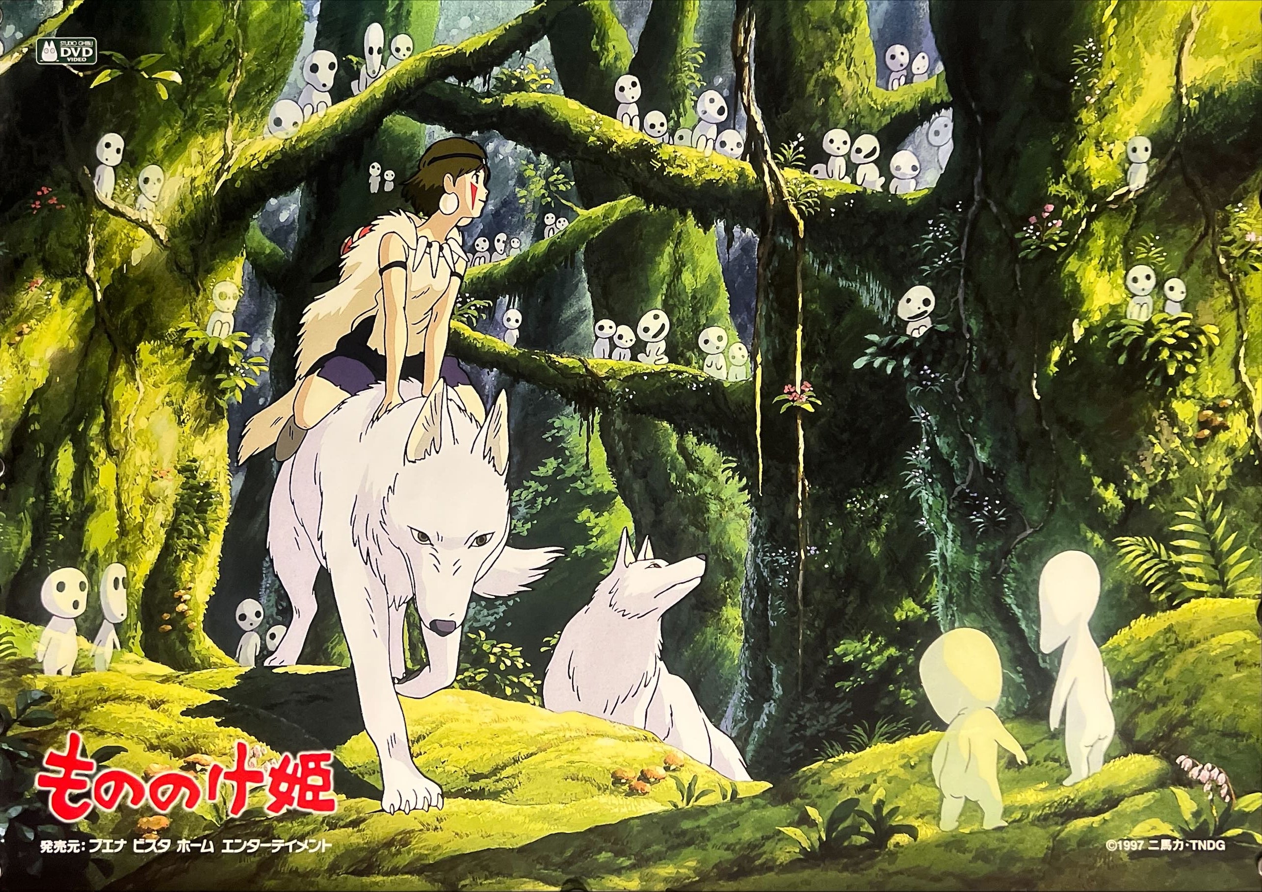 This DVD promotional poster features San astride her white wolf companion, surrounded by the eerie yet enchanting kodama spirits in a lush, painterly forest backdrop. The design captures Miyazaki’s ecological themes and the mystical atmosphere of the film. The bold red Japanese title 「もののけ姫」 is placed at the lower left, with DVD distributor details below, while the ©1997 Studio Ghibli credit appears in the lower corner. The imagery is instantly recognizable to fans of both Ghibli and global animation.