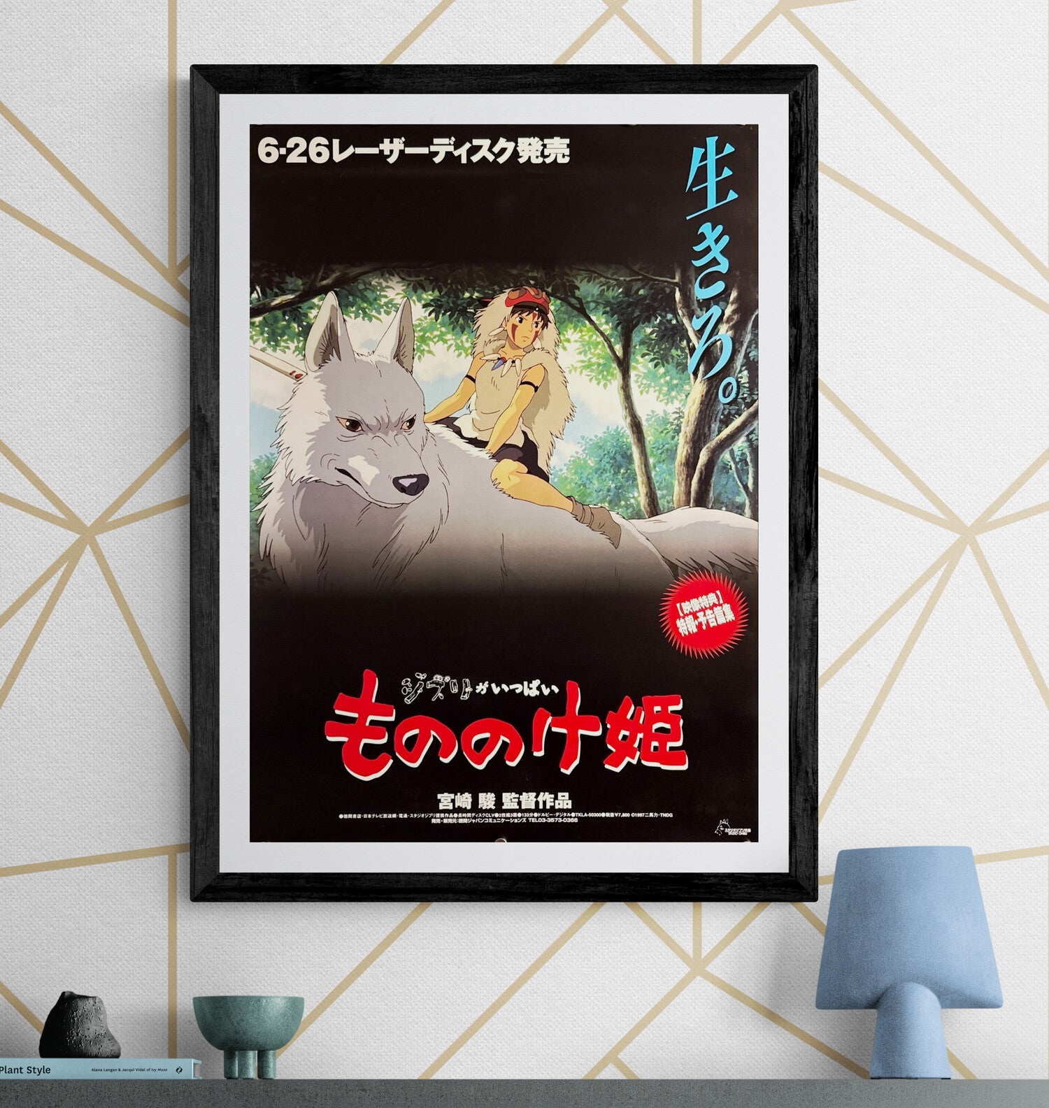 The iconic 「生きろ。」(Live.) tagline drops down the right margin while San, fur-cloaked and goggled, rides a white wolf through lush forest light. The lower half fades to black with the bold red title 「もののけ姫」 and the Ghibli home-video credits—clean, dramatic, and unmistakably late-’90s Ghibli.