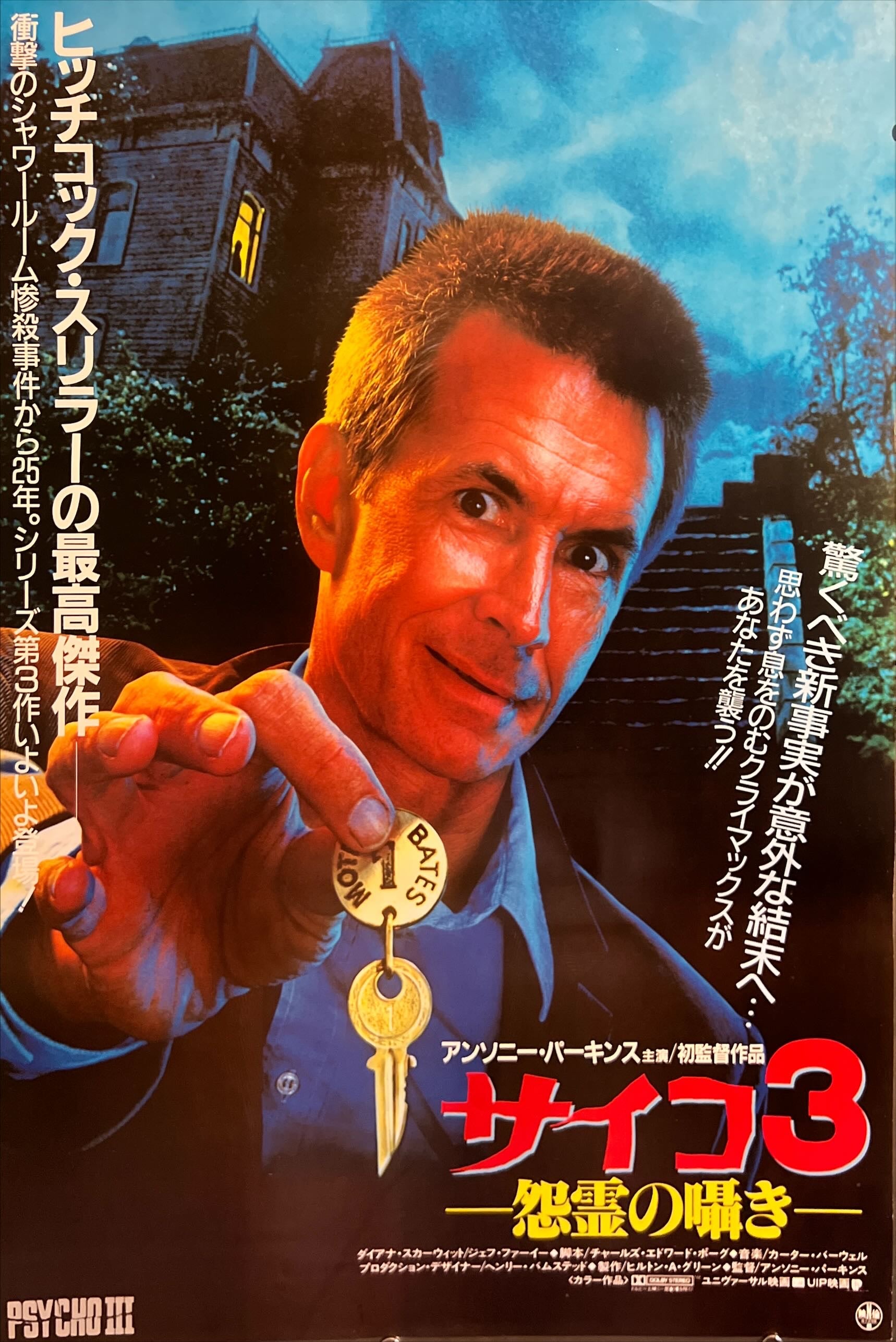 This is an original Japanese B2 poster printed in 1986 for the release of Psycho III, the third entry in the Bates Motel series. Directed by Anthony Perkins (who also stars again as Norman Bates), the film leans into stylised, darkly comic horror and has a strong cult reputation among franchise collectors. Co‑starring Diana Scarwid and Jeff Fahey, it’s a quintessential mid‑’80s slasher‑era sequel. The Japanese B2 is built around photographic key art with domestic typography; a specific poster artist credit is not printed on the sheet.
