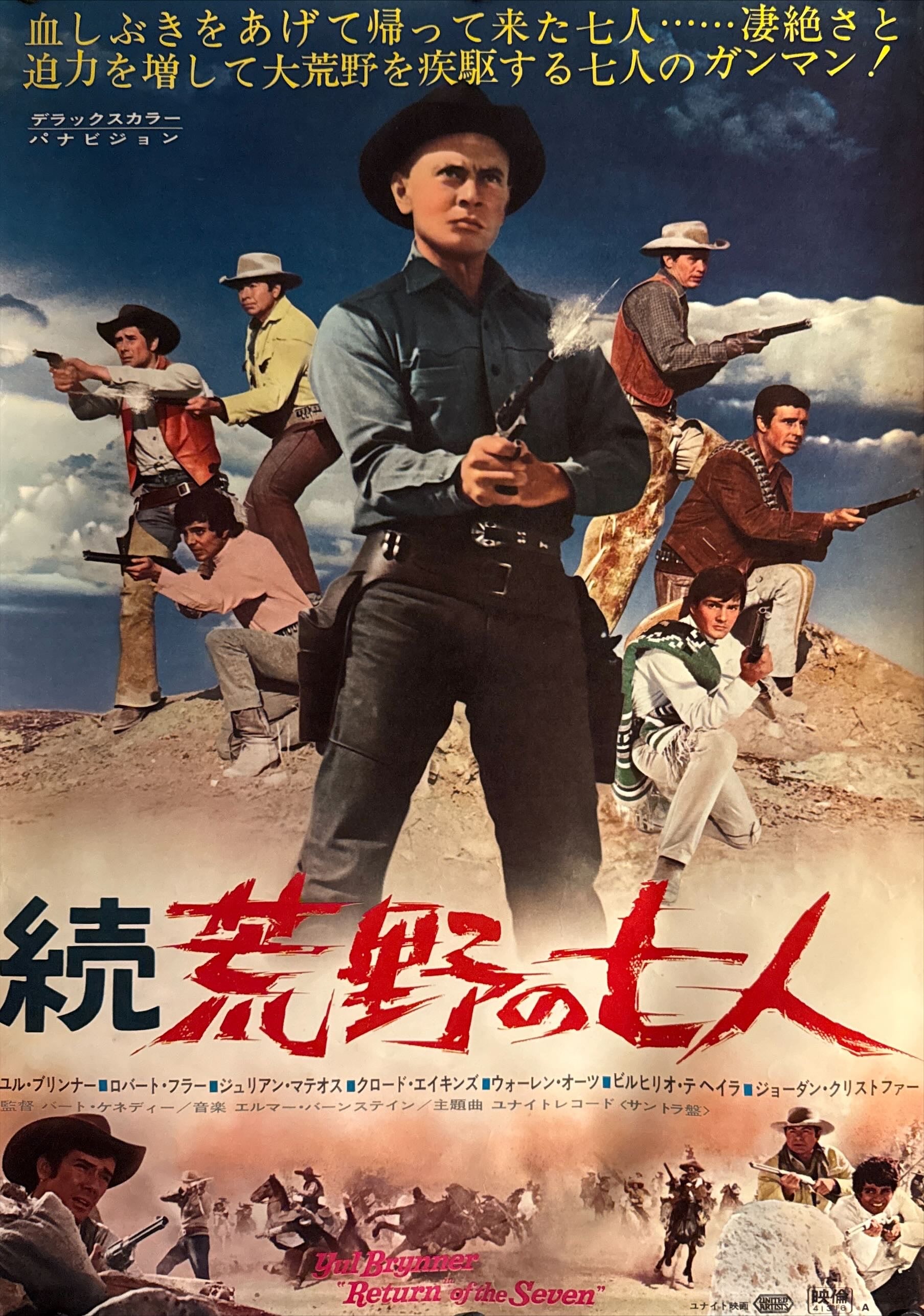This is an original Japanese B2 poster printed in 1966 for the first theatrical release of Return of the Seven (a.k.a. Return of the Magnificent Seven), starring Yul Brynner with Robert Fuller, Julián Mateos, Claude Akins, Warren Oates, Emilio Fernández, and directed by Burt Kennedy. United Artists distributed the sequel in Japan following the smash success of the 1960 original.
