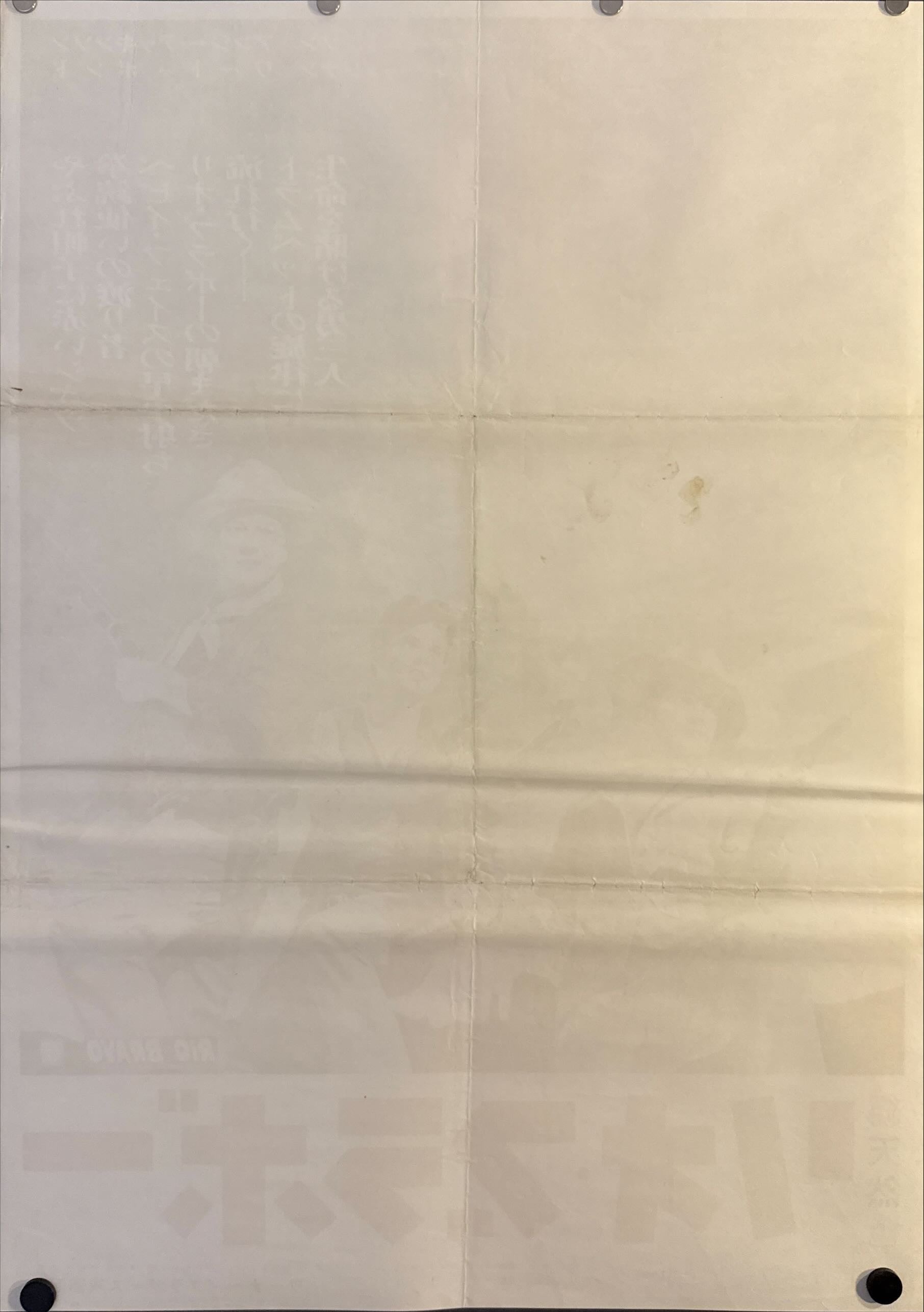 This is an original Japanese B2 poster printed in 1959 for Howard Hawks’s classic western Rio Bravo, starring John Wayne, Dean Martin, Ricky Nelson, Angie Dickinson, and Walter Brennan—with a rousing score by Dimitri Tiomkin. Released in Japan by Warner Bros., the film follows Sheriff John T. Chance and his mismatched posse holding the line against a rancher’s hired guns.