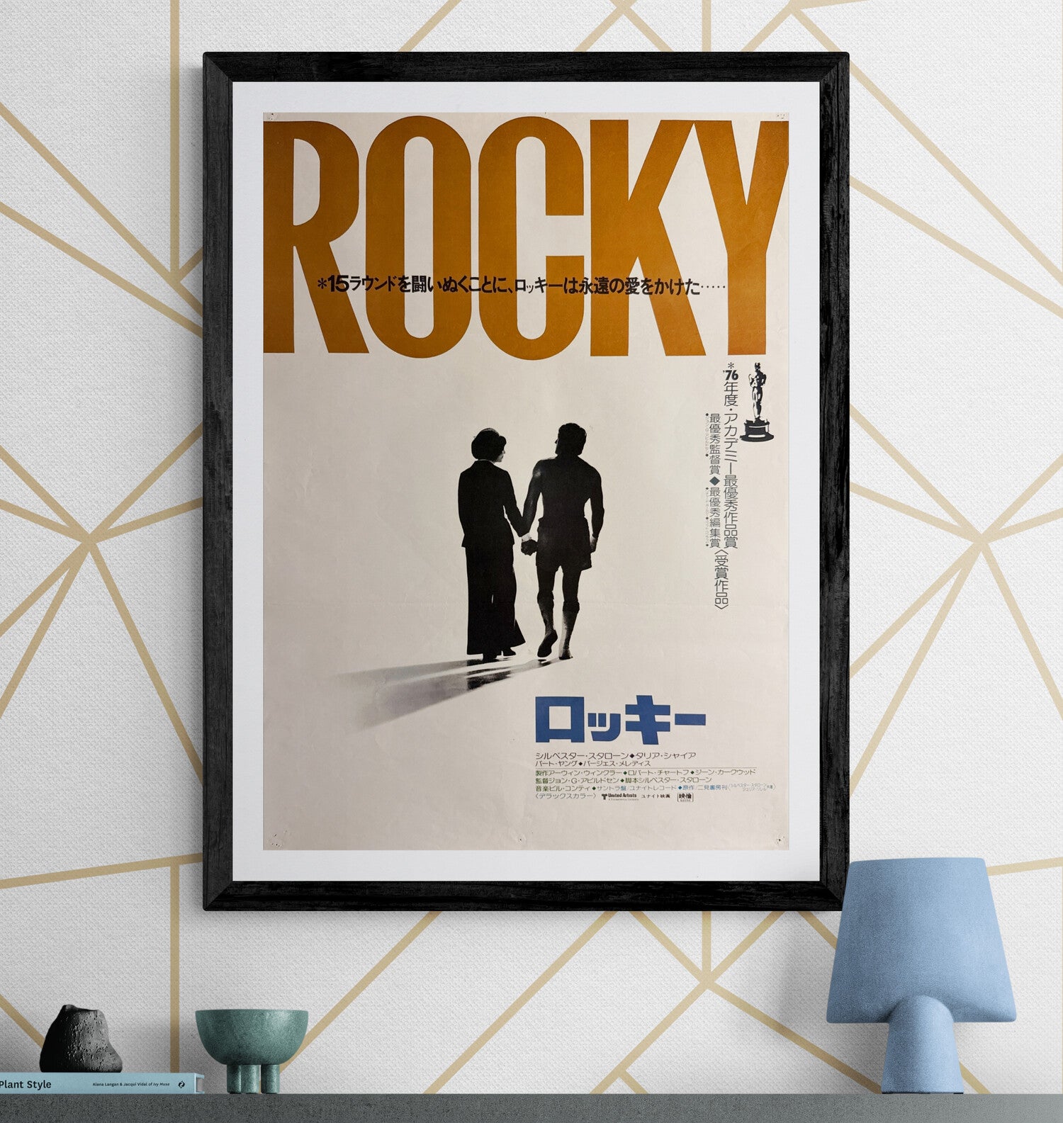 This is an original Japanese B2 movie poster printed in 1976 for the first Japanese theatrical release of Rocky (ロッキー), a United States sports drama directed by John G. Avildsen, written by and starring Sylvester Stallone, with Talia Shire, Burt Young, Carl Weathers, and Burgess Meredith.