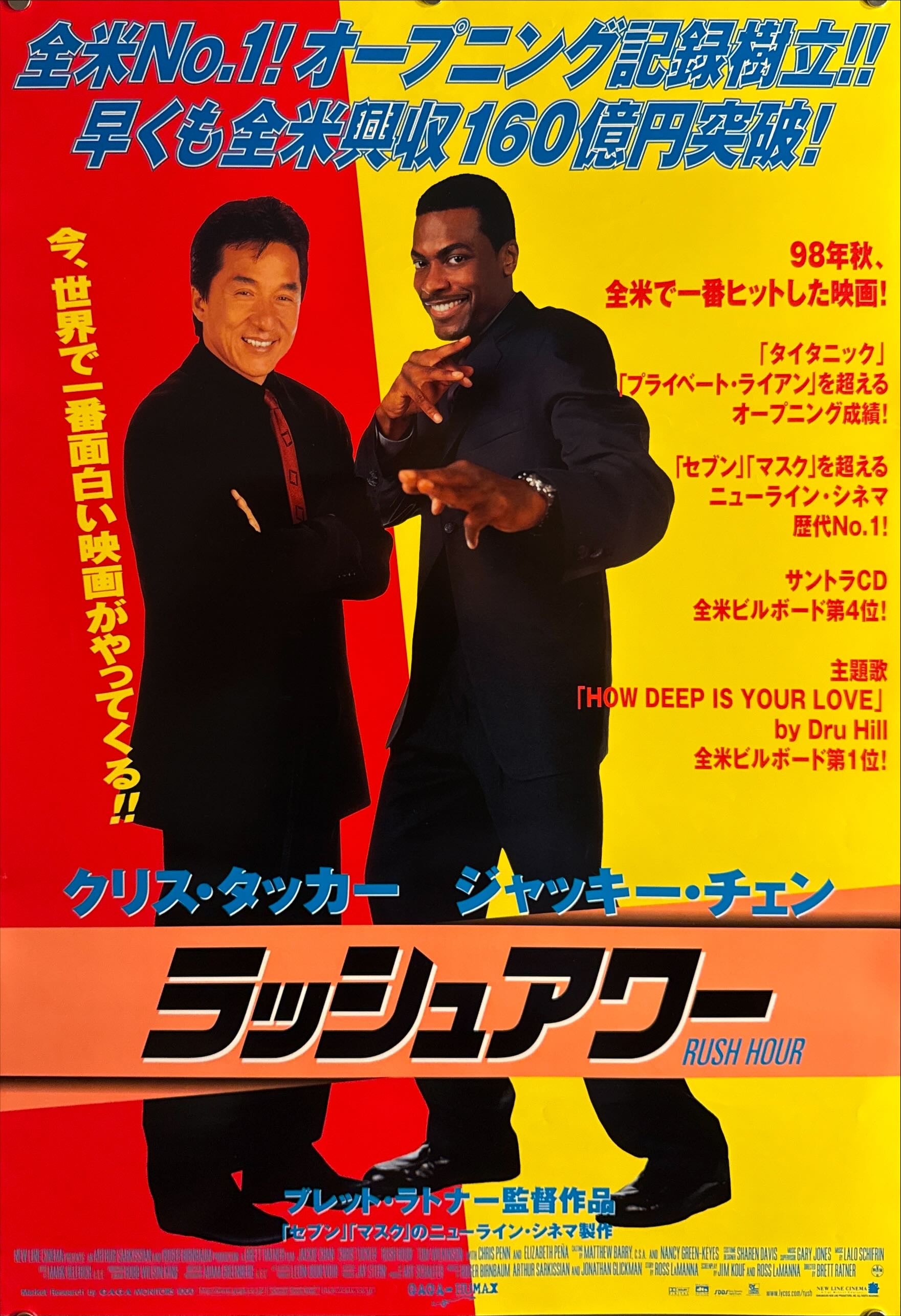 A bold, high-energy country sheet split in red and yellow with full-length portraits of Chan (arms folded) and Tucker (kung-fu pose) over a city skyline. Large metallic logotype 「ラッシュアワー」 anchors the base, with copy lines touting U.S. box-office records and star billing in white banners. Credits along the footer include New Line Cinema with GAGA/HUMAX release—classic hallmarks of an authentic first-release Japanese theatrical sheet with strong wall presence.