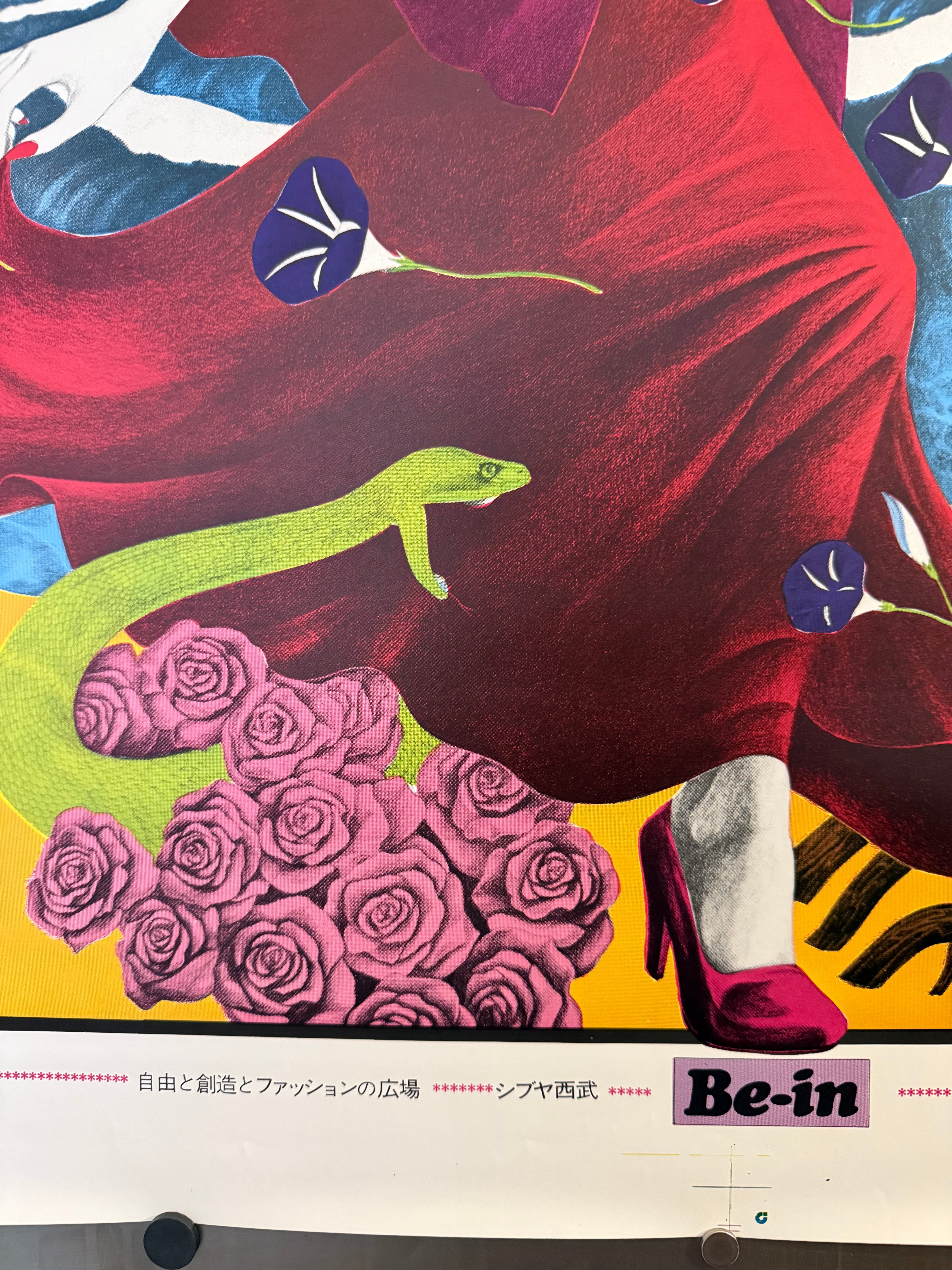 Copy & colophons. Micro‑copy in the blue field reads as a first‑person reverie; the lower margin bears “Be‑in” and Seibu Shibuya (西武 渋谷) shop marks, pointing to department‑store design outlets that retailed avant‑garde graphics in the 1970s.