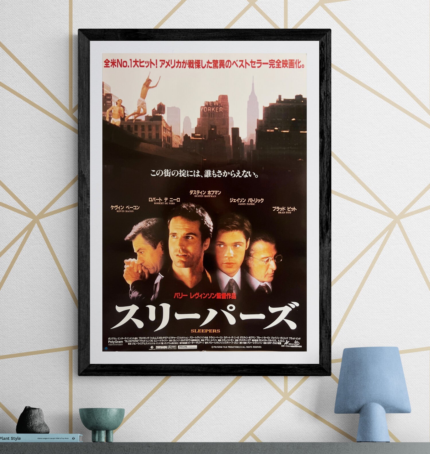 This is an original Japanese B2 theatrical poster printed for the release of Sleepers, Barry Levinson’s 1996 legal crime drama based on Lorenzo Carcaterra’s controversial best‑seller. The ensemble cast includes Kevin Bacon, Robert De Niro, Dustin Hoffman, Jason Patric and Brad Pitt, spanning the story’s jump from 1960s Hell’s Kitchen to the 1980s courtroom reckoning.