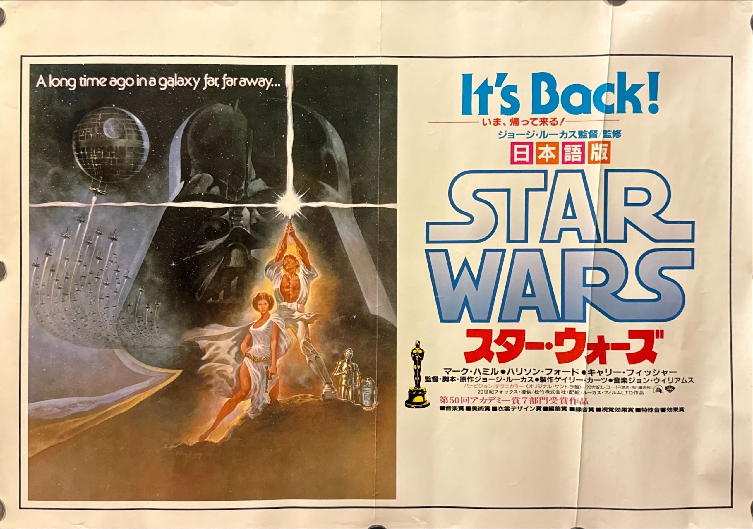 This B3 features Tom Jung’s iconic “Style A” artwork, with Luke brandishing his lightsaber above his head, Leia posed at his side, the Death Star and a formation of X‑wings sweeping toward Darth Vader’s looming mask in the background. The right side of the design is given over to bold English and Japanese titling, with the large blue STAR WARS logo and vivid red 「スター・ウォーズ」, plus the Oscar statuette celebrating the film’s Academy Award wins. At the top, the English slogan “It’s Back!” announces the return of Star Wars to Japanese cinemas, while the Japanese text highlights that this is the Japanese‑language version supervised by George Lucas.