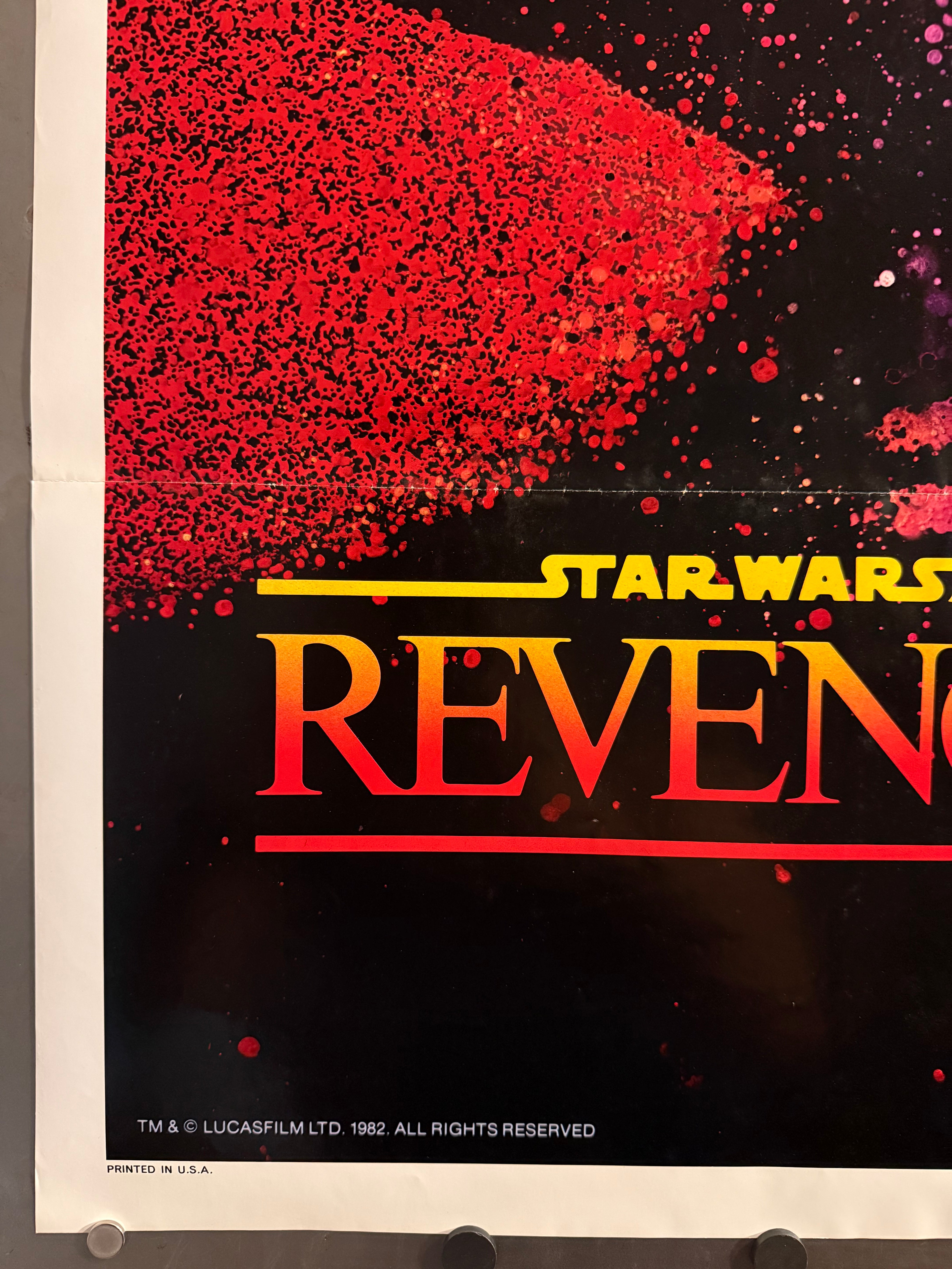 The ultra‑scarce undated teaser for Revenge of the Jedi—the early title of Return of the Jedi. This first‑issue advance was sent to theaters before Fox announced the release date, so it does not carry the later “Coming May 25, 1983” line along the bottom. Printed in far smaller numbers than the later dated style and immediately superseded when the title changed, this is among the most coveted Star Wars one‑sheets.