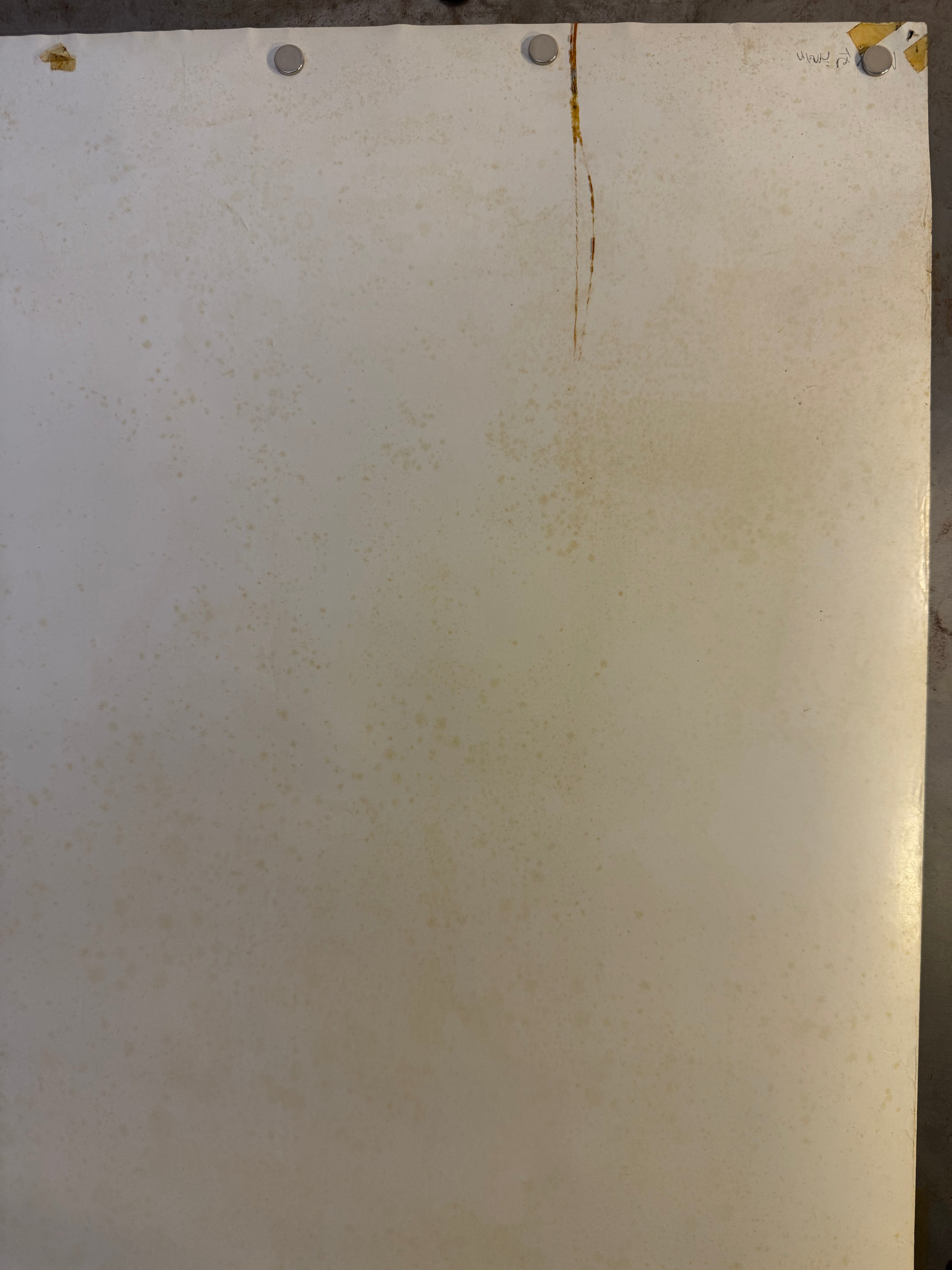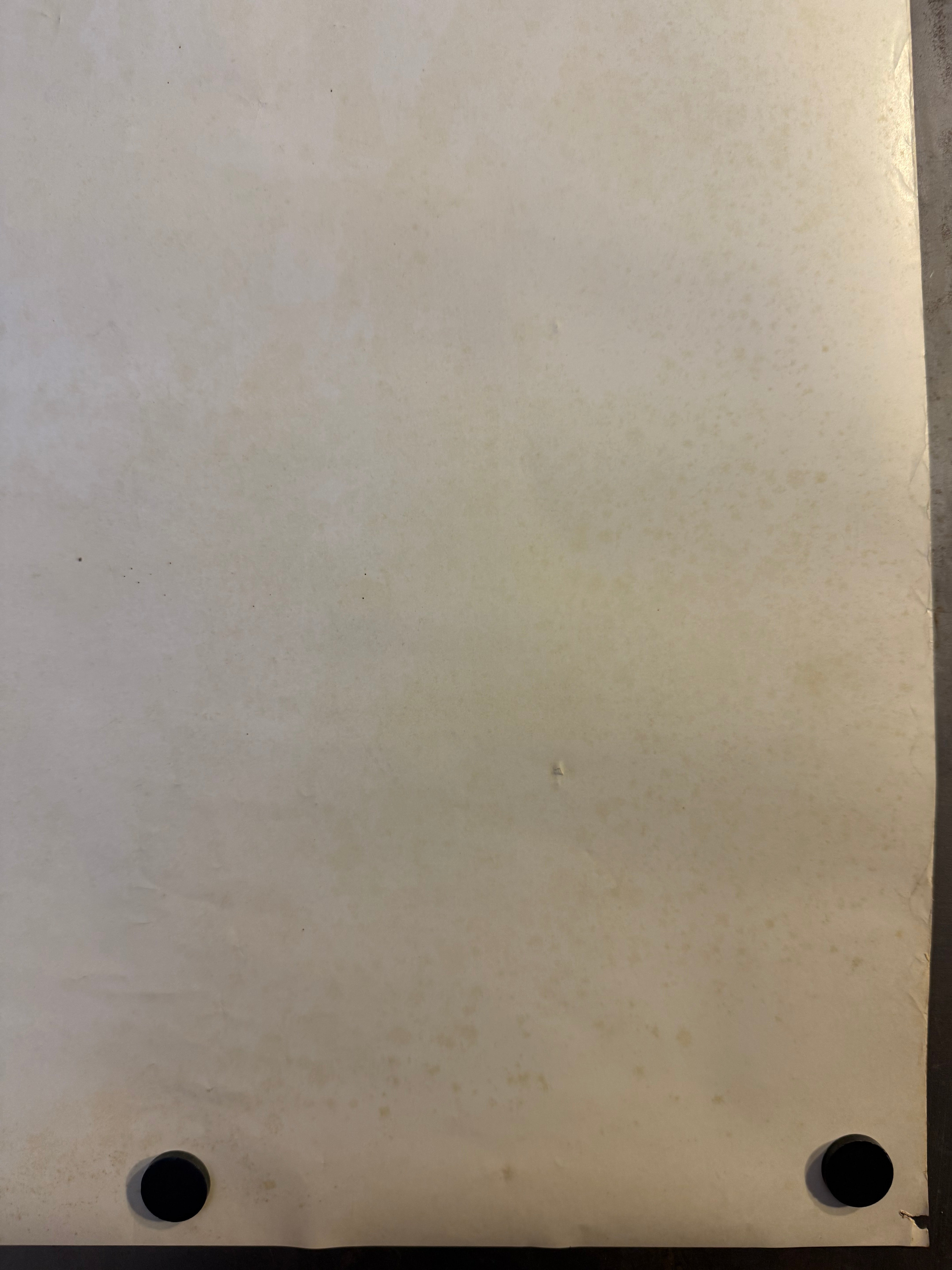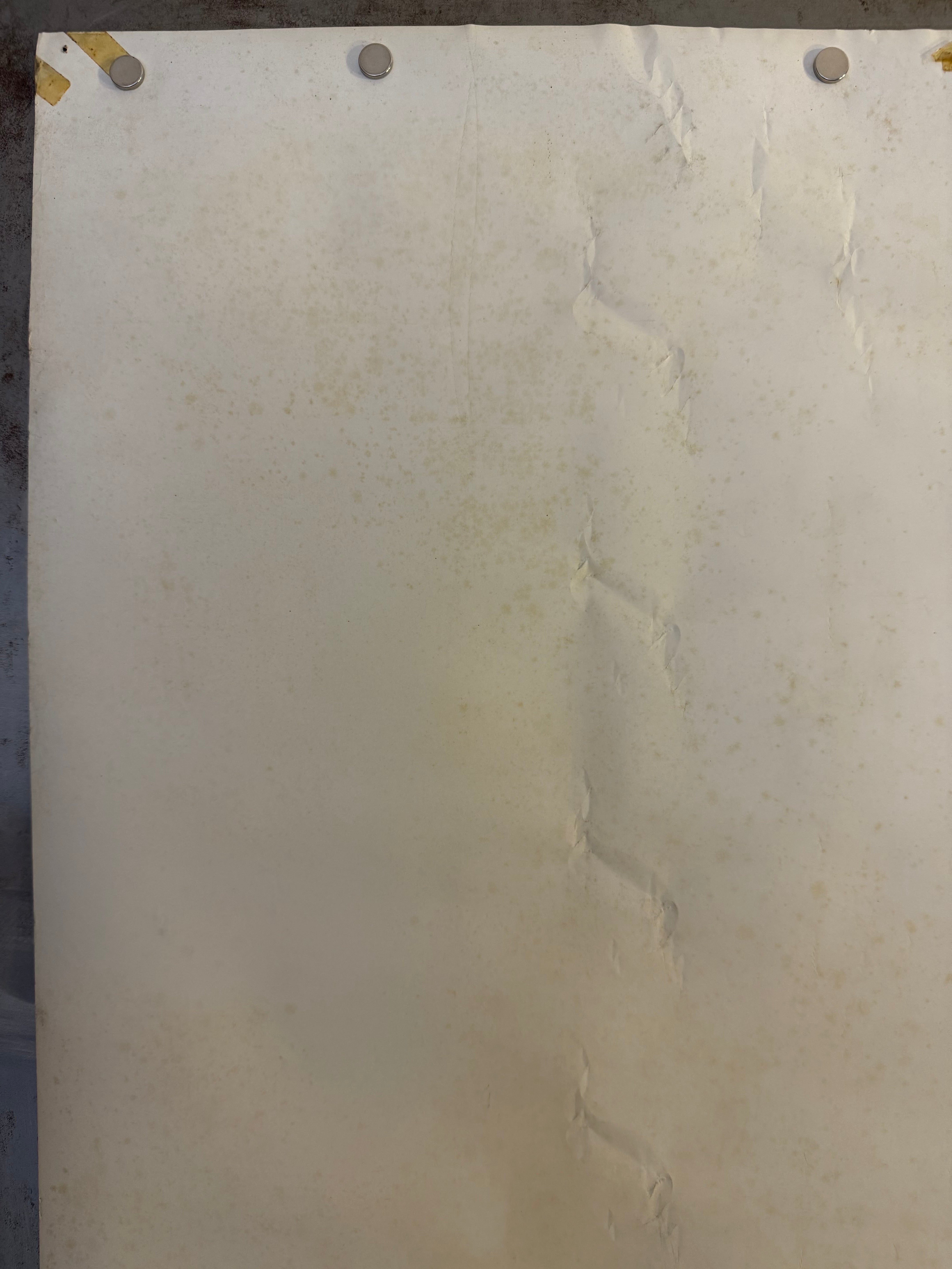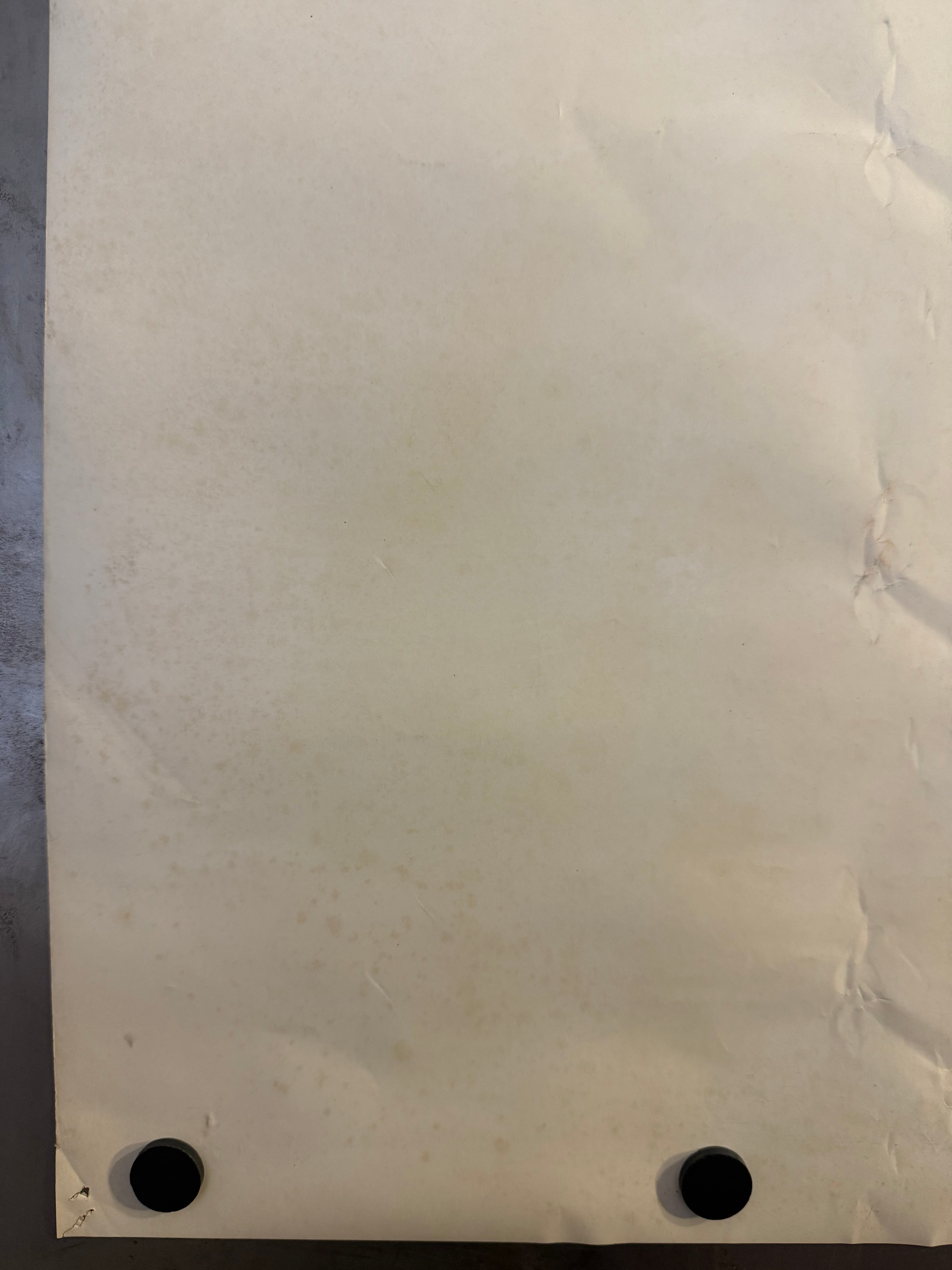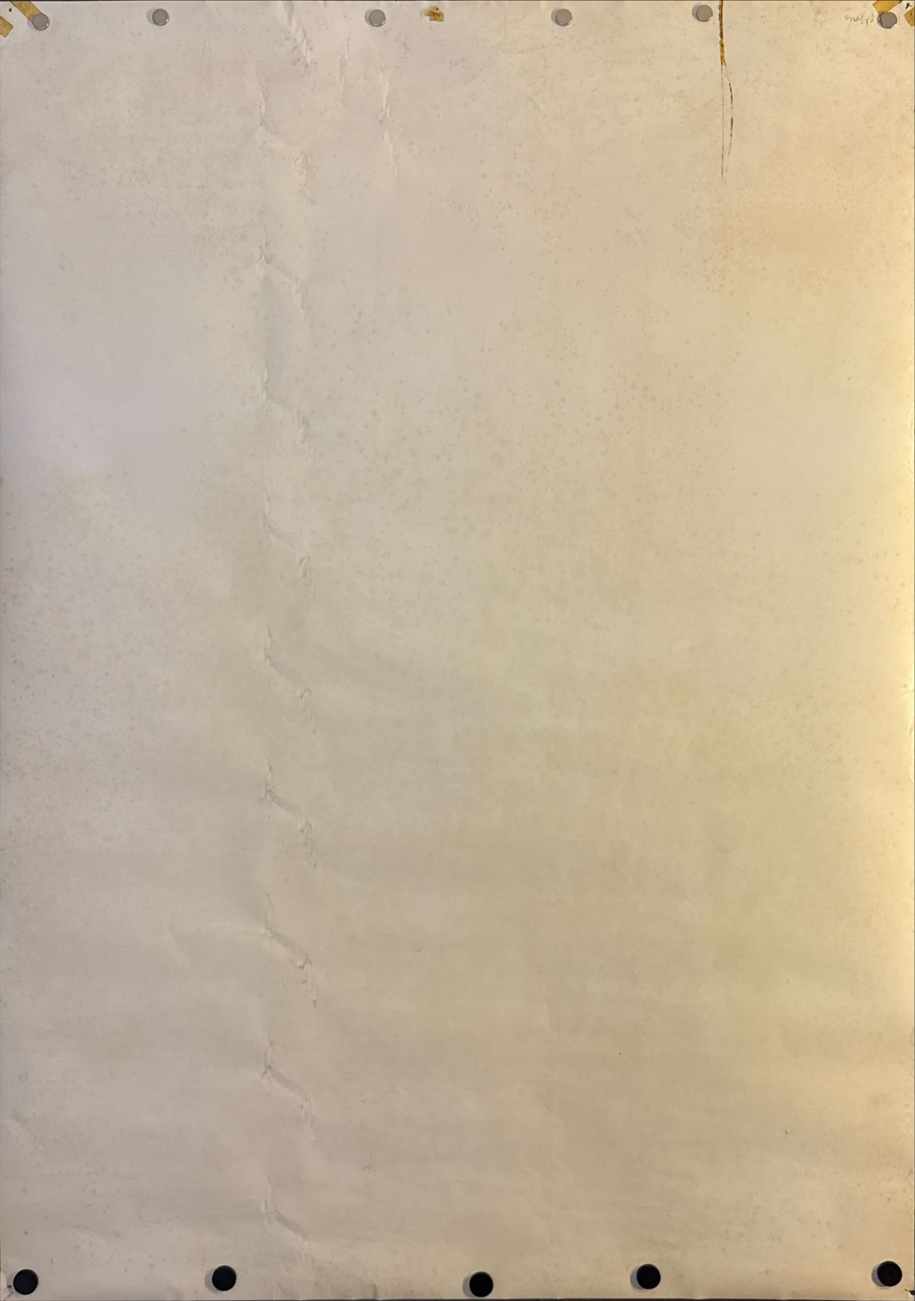 Very good to excellent display‑used condition for a nearly 50‑year‑old poster, but not near‑mint like the previous example we sold—this has clearly done its job on a wall and survived. There are multiple old hanging/punch holes and some tape residue in the upper margin (and related marks at the corners), minor edge nicks and soft corner bends, and a small tear/crease around the CBS/SONY logo at lower right. A vertical line of handling creases and small pressure wrinkles runs down the central area, visible under raking light. The verso shows overall age‑related toning and scattered foxing spots, plus an old stain near the upper right and some pencil/pen notation—typical patina for a 1970s Japanese poster that was actually displayed. Colours on the front remain rich and saturated, with the blues, oranges and flesh tones still very strong.