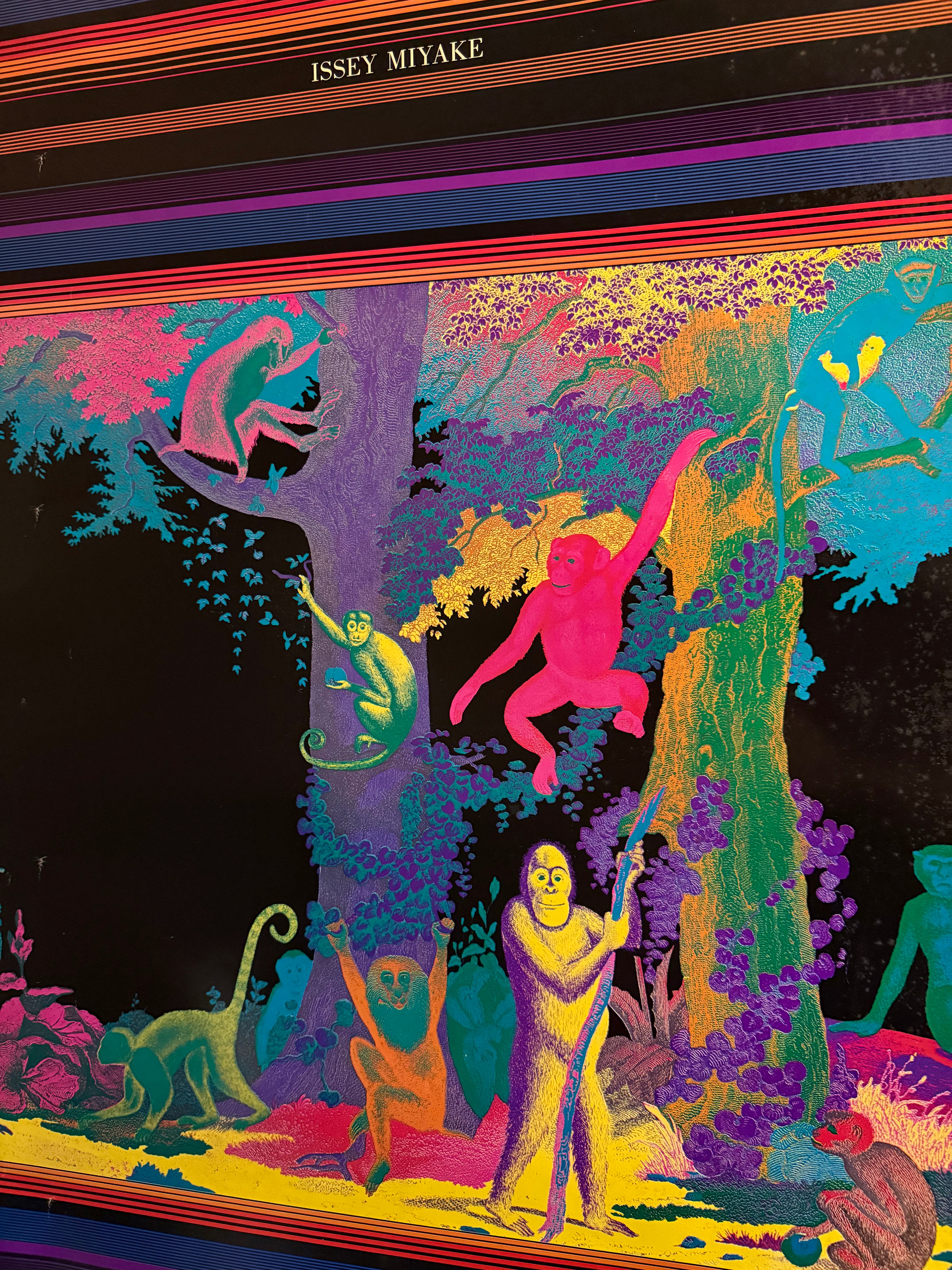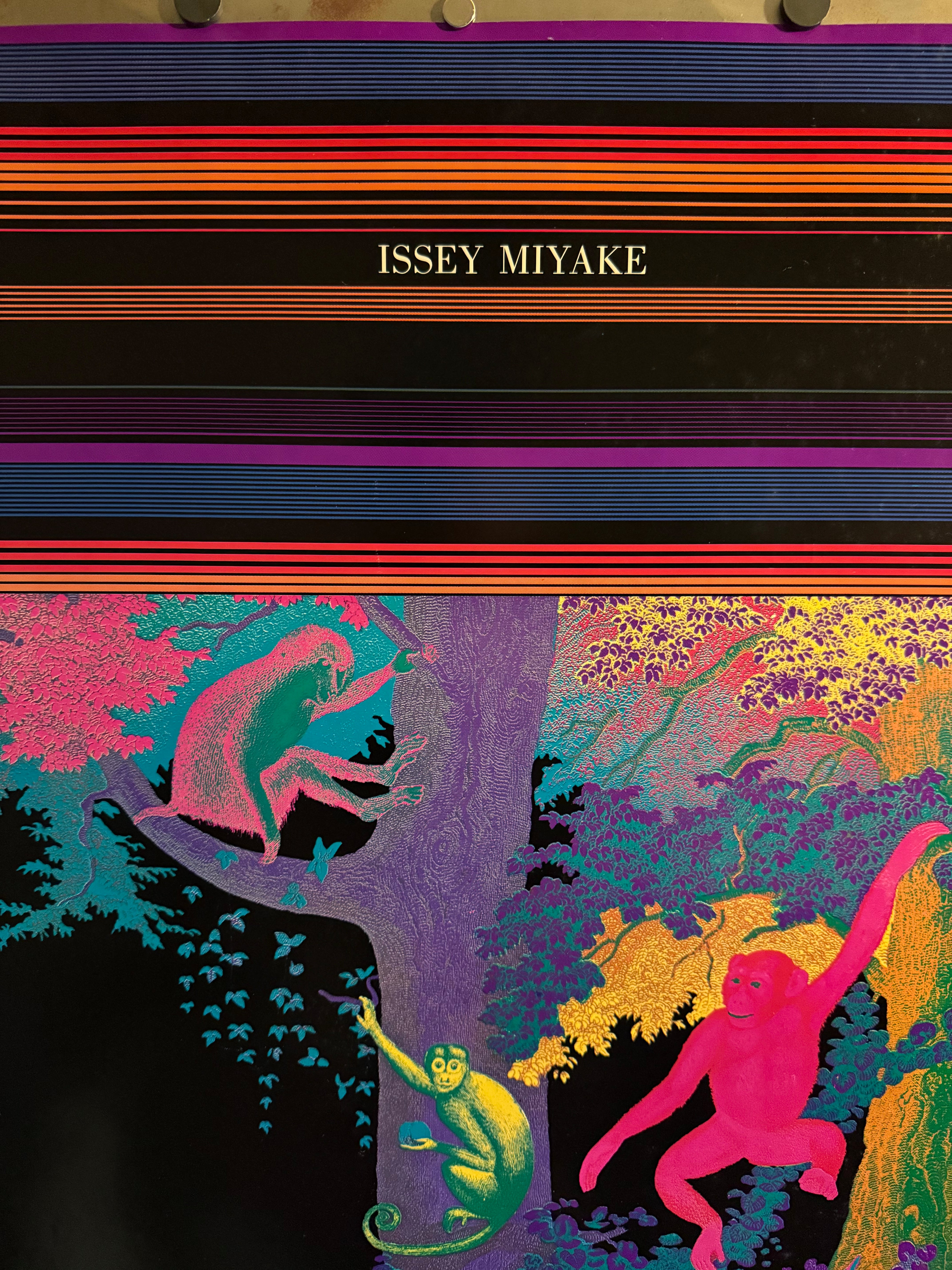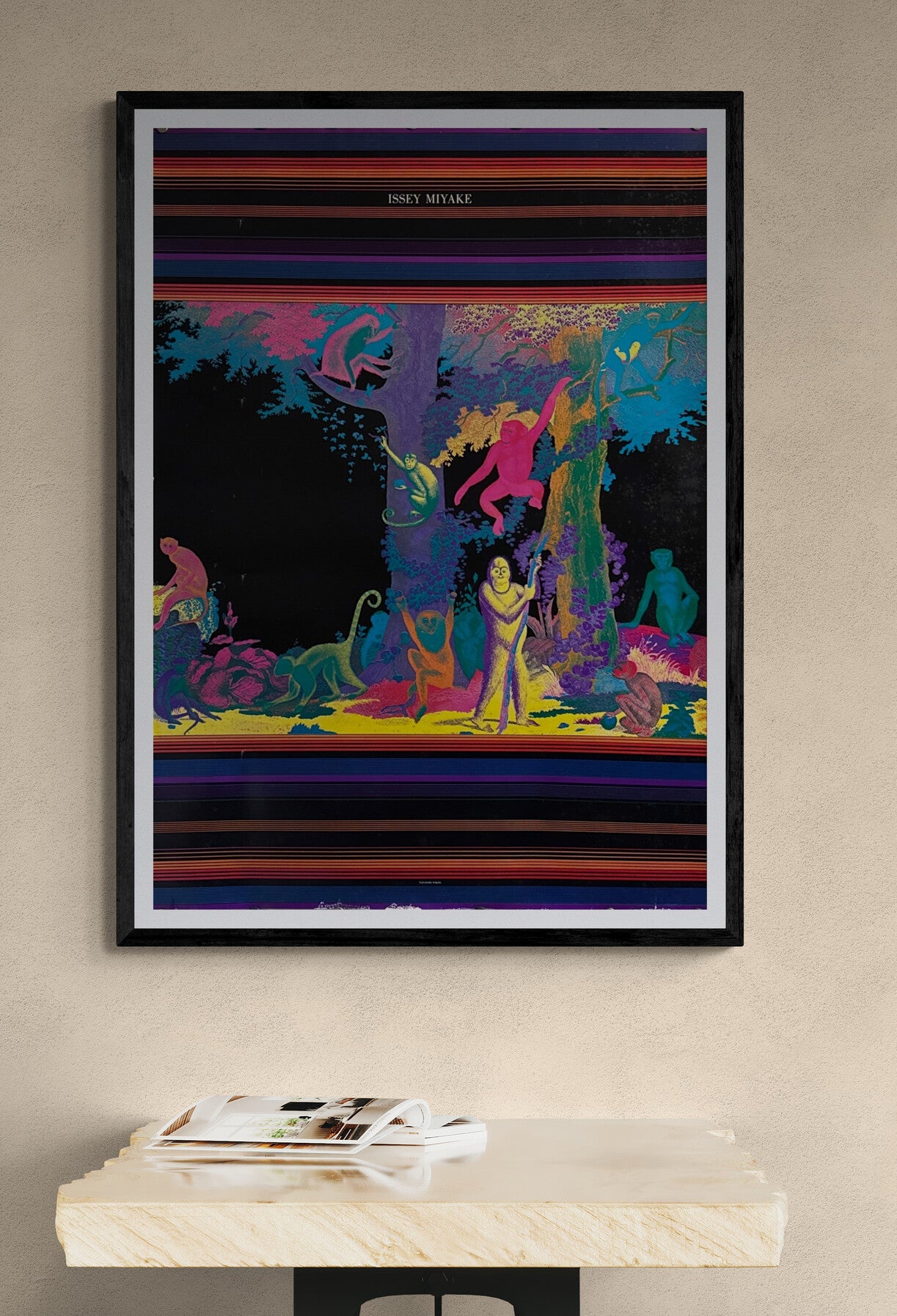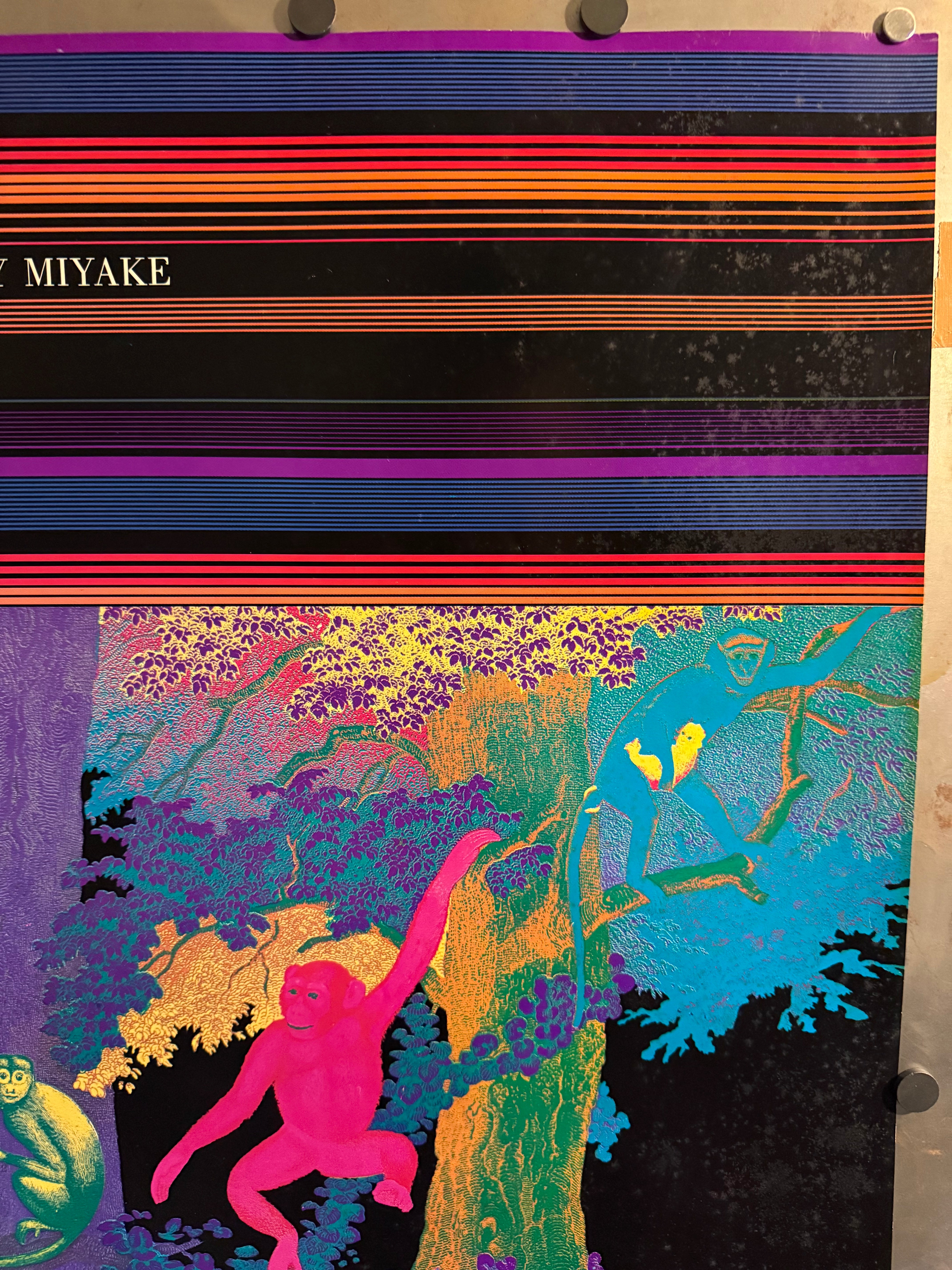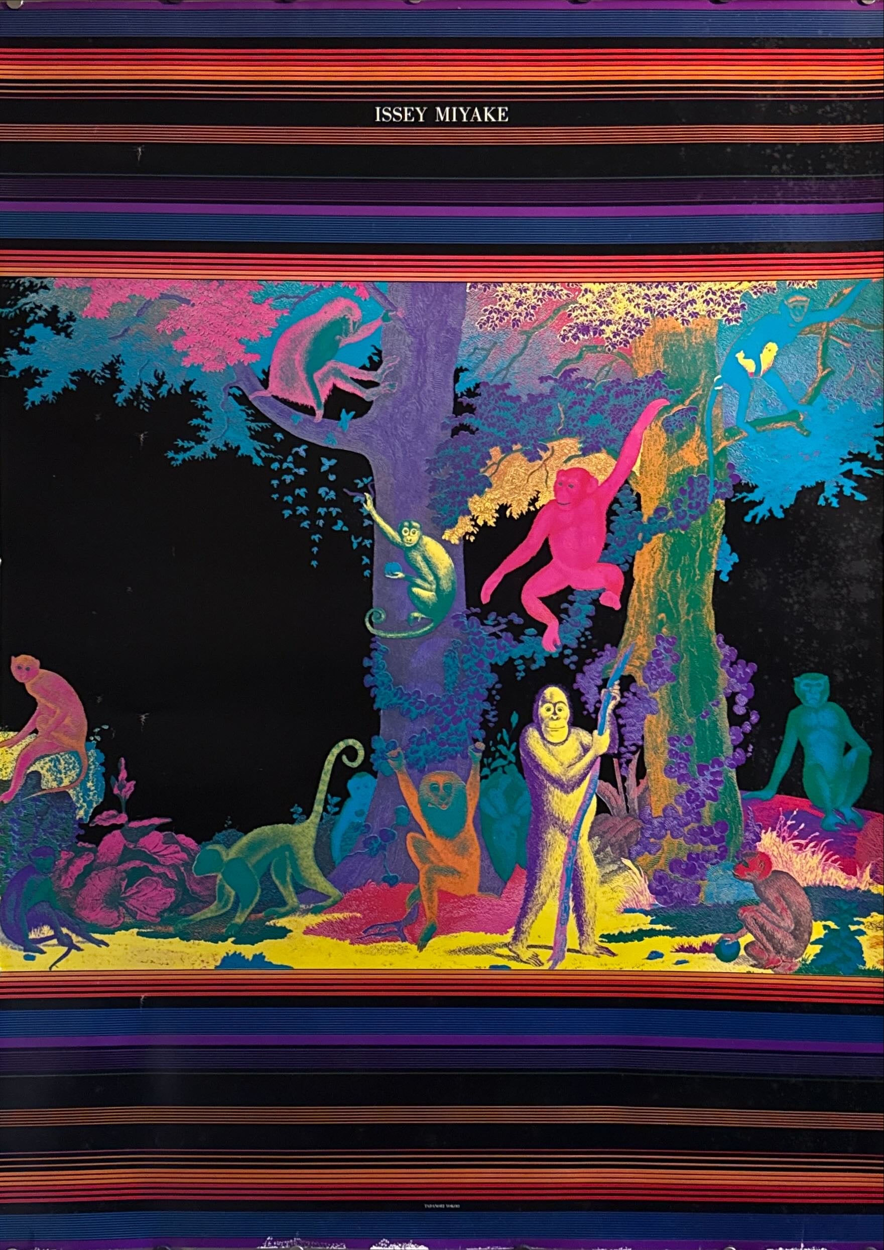 Yokoo’s composition plunges the viewer into a fantastical, nocturnal forest. Against a deep black ground, a troop of vividly coloured monkeys climbs, lounges and poses among dense foliage: a central yellow figure stands upright with staff in hand, flanked by electric pink, turquoise, orange and green companions that animate the trees and undergrowth. The leaves and trunks are rendered in rich, layered fluorescent and metallic‑like inks that catch the light and give the surface a subtle, almost embossed texture. At the top and bottom, wide bands of razor‑thin horizontal stripes in purples, reds, oranges and blues frame the scene like a woven textile, with a restrained “ISSEY MIYAKE” wordmark floating in white capitals above the tableau. The tension between the “primitive” jungle and the refined, fabric‑like borders perfectly expresses Miyake’s interest in clothing as both ancient ritual and cutting‑edge design – and, out of strong competition, this poster is often singled out as one of Yokoo’s very best Miyake collaborations of the decade.
