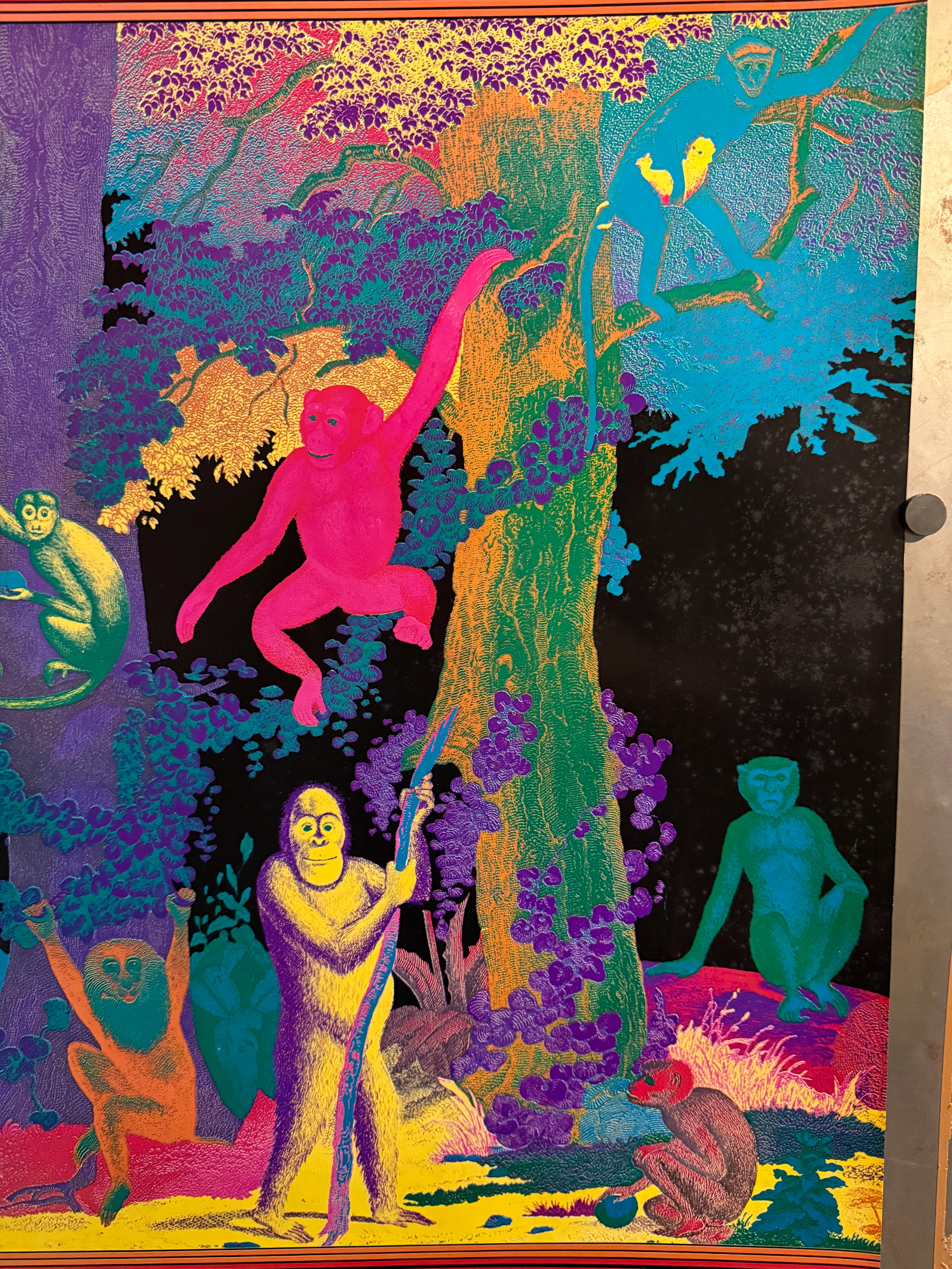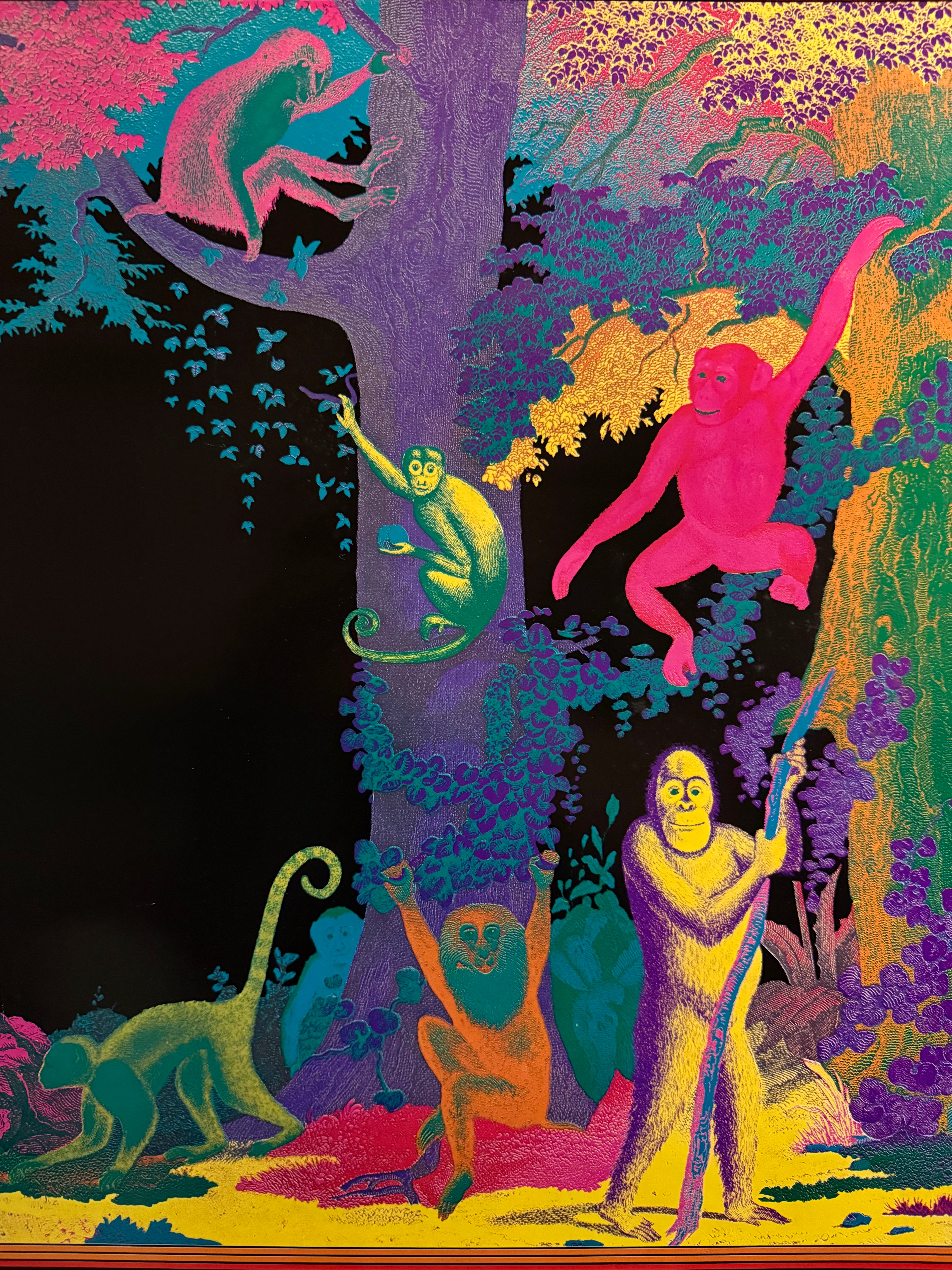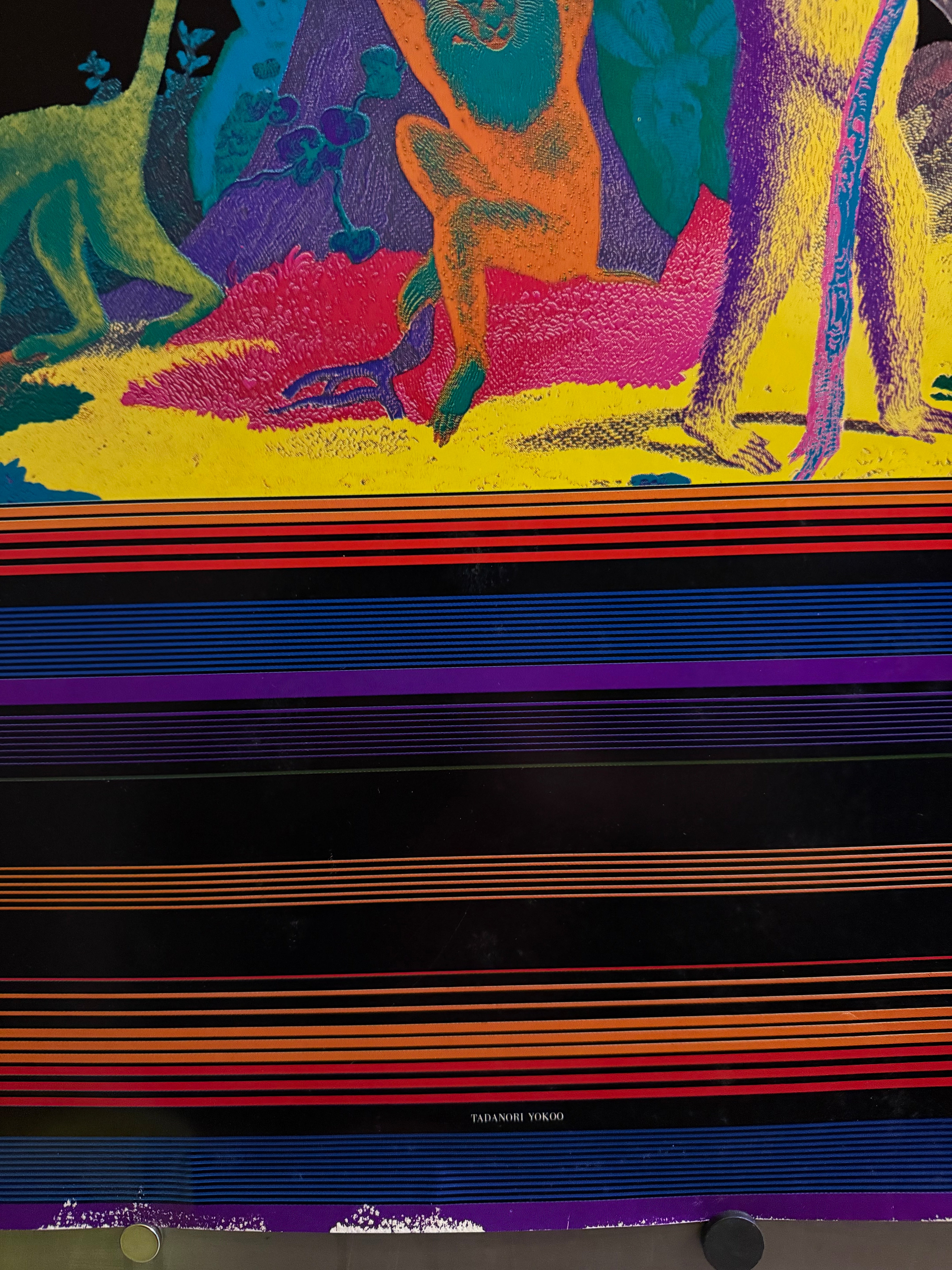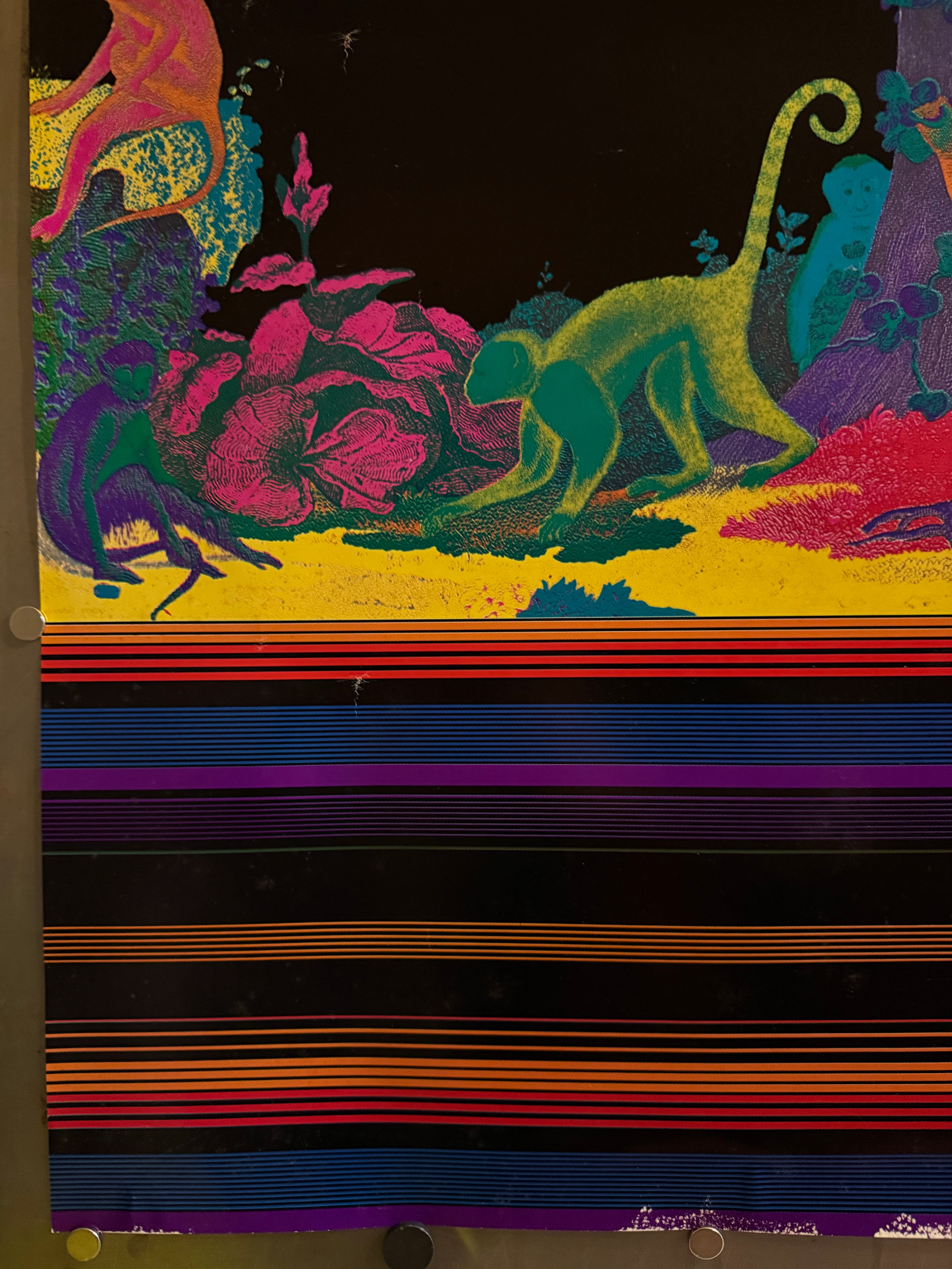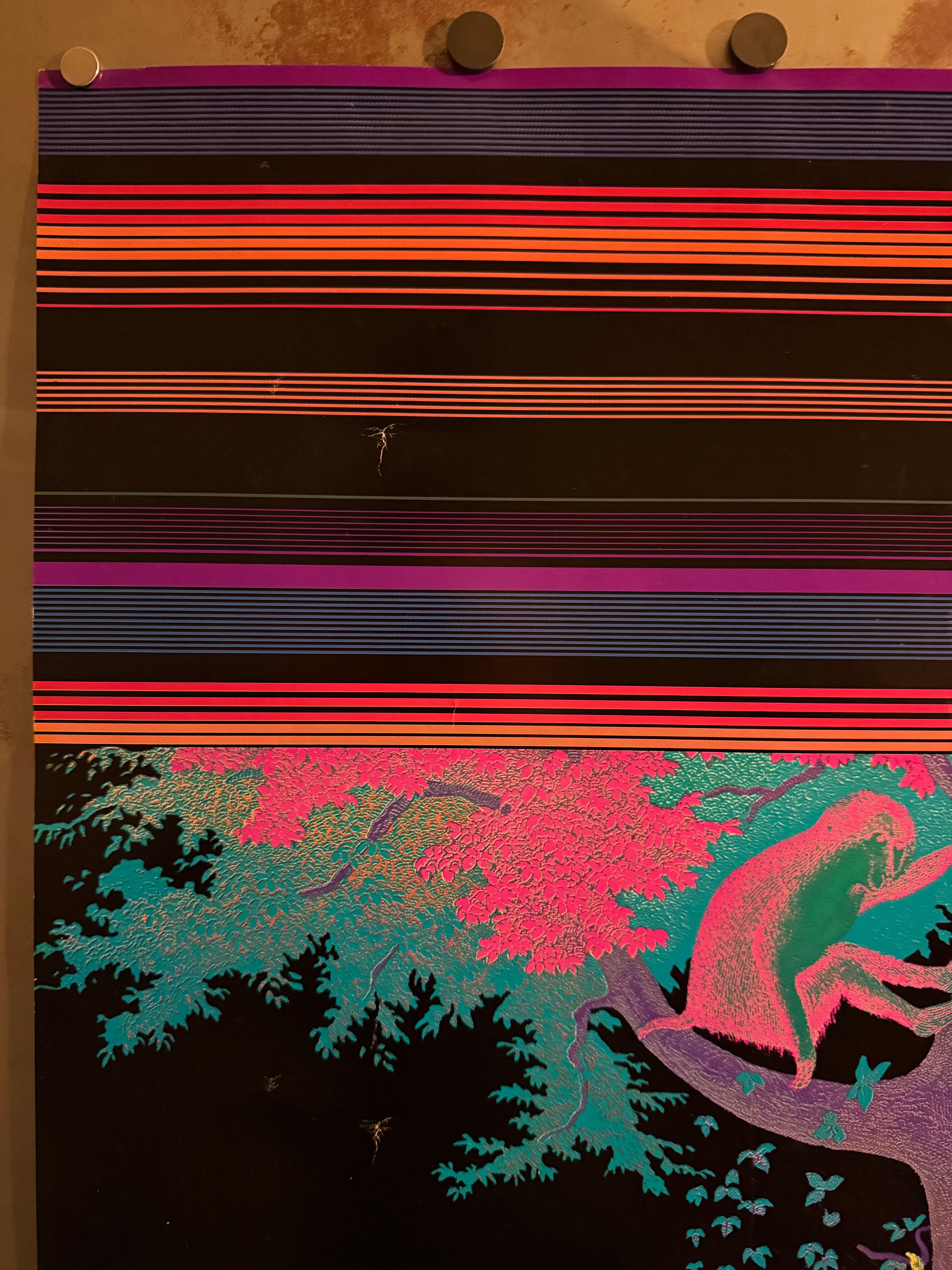 This particular poster is in excellent condition for its age. Colours are exceptionally vivid, with the fluorescent inks still strong and the black background deep. The paper is clean and lies flat. There are some minor signs of age and handling – a few tiny surface marks in the black areas, light edge wear along the lower margin, and slight toning and speckling on the reverse – but no tears, pinholes or writing. Overall it presents beautifully and retains the luxurious, tactile quality of the original 1970s printing. Please refer closely to the photos, as they show the exact poster for sale.