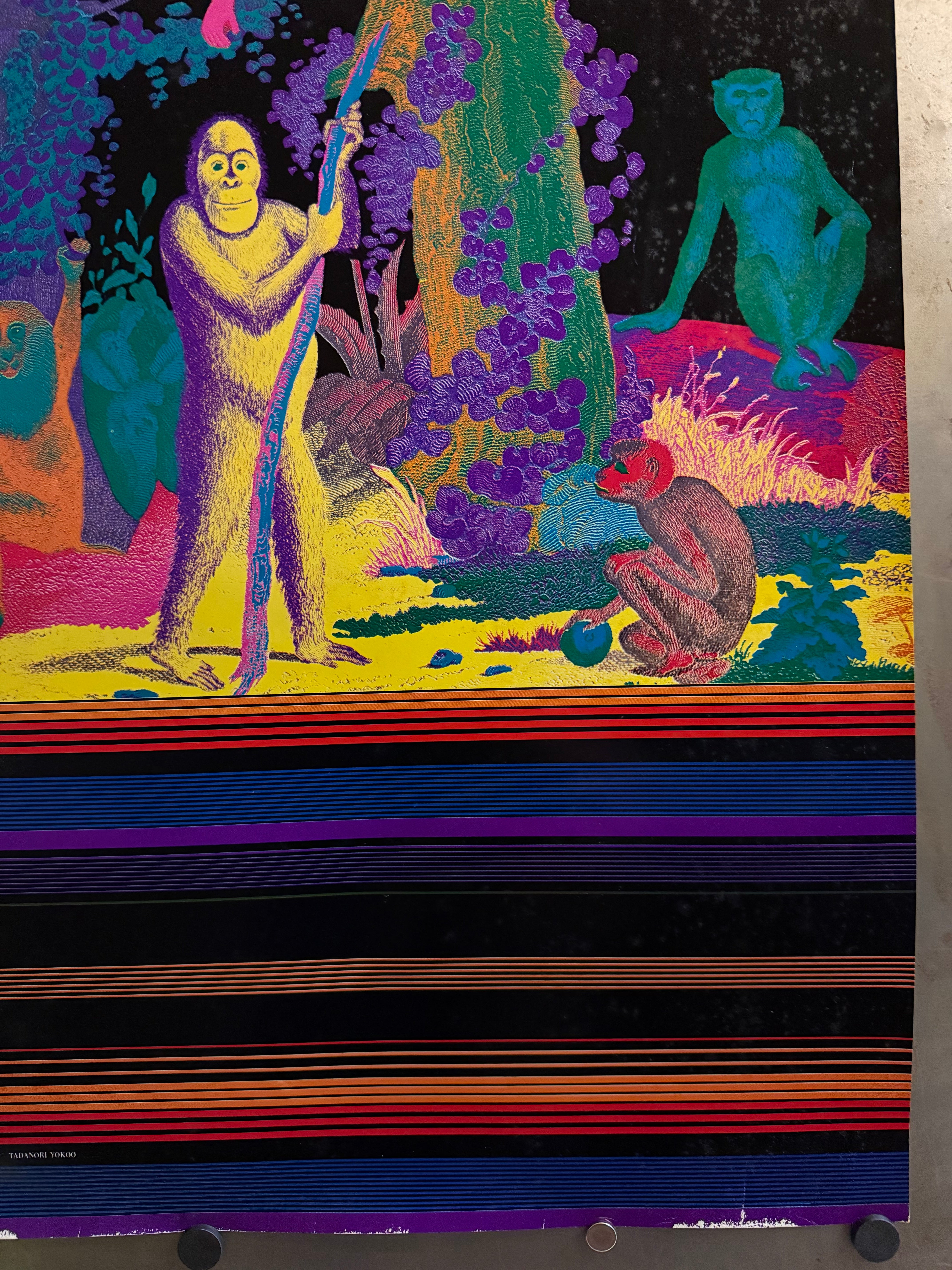 This is an original Japanese offset poster printed in 1976 for an early collaboration between legendary graphic artist Tadanori Yokoo and fashion designer Issey Miyake. Created as Miyake was establishing his independent studio and international reputation, the design promotes his avant‑garde clothing with a visual language as daring as the garments themselves. This lush jungle‑monkey image is catalogued in The Complete Posters of Tadanori Yokoo (no. 76‑27) and is widely regarded as one of the strongest posters Yokoo created for Miyake in the 1970s. Posters from this campaign were produced in small numbers for fashion and design promotion and are rarely seen today, especially in the large B1 format.