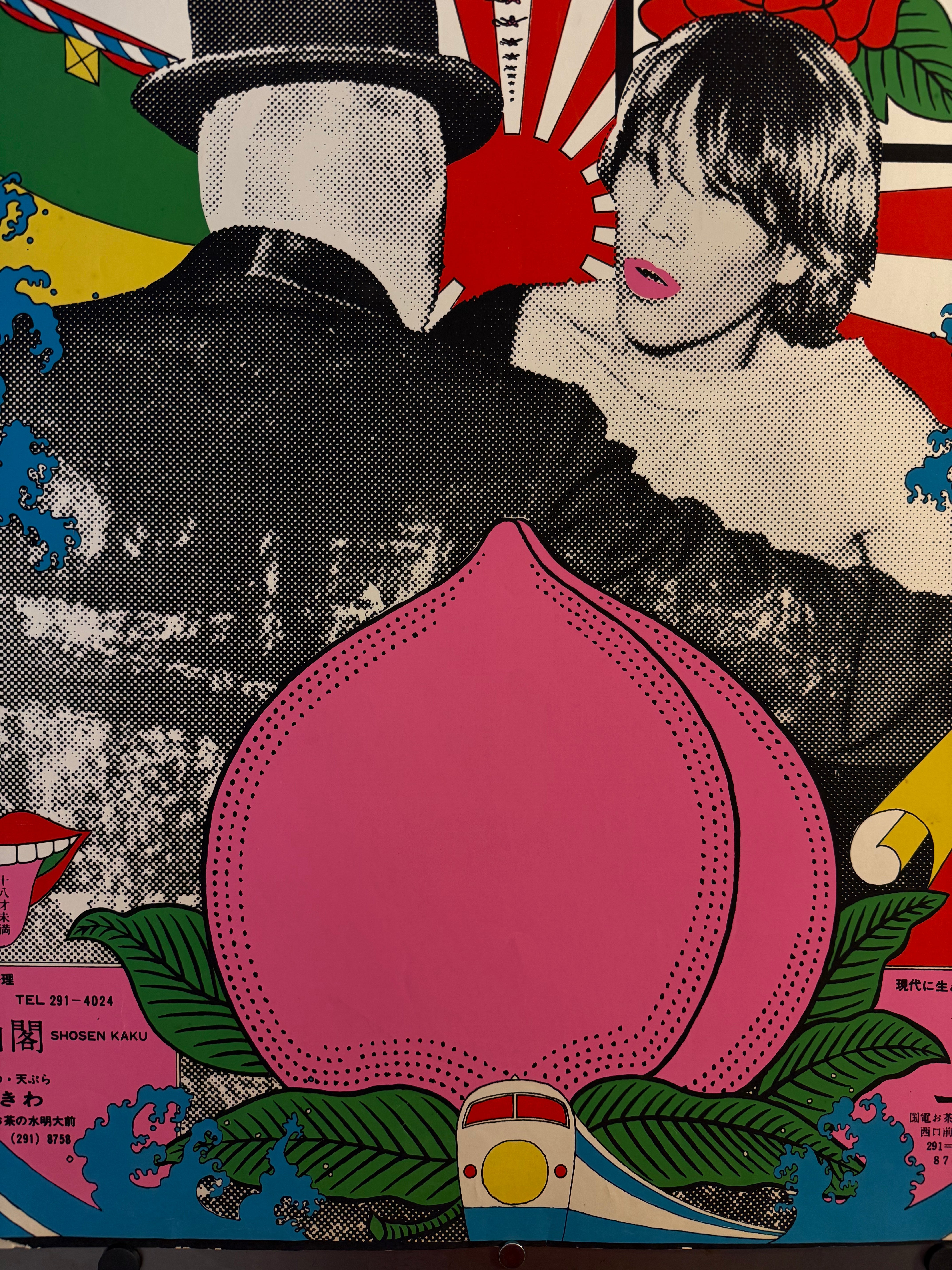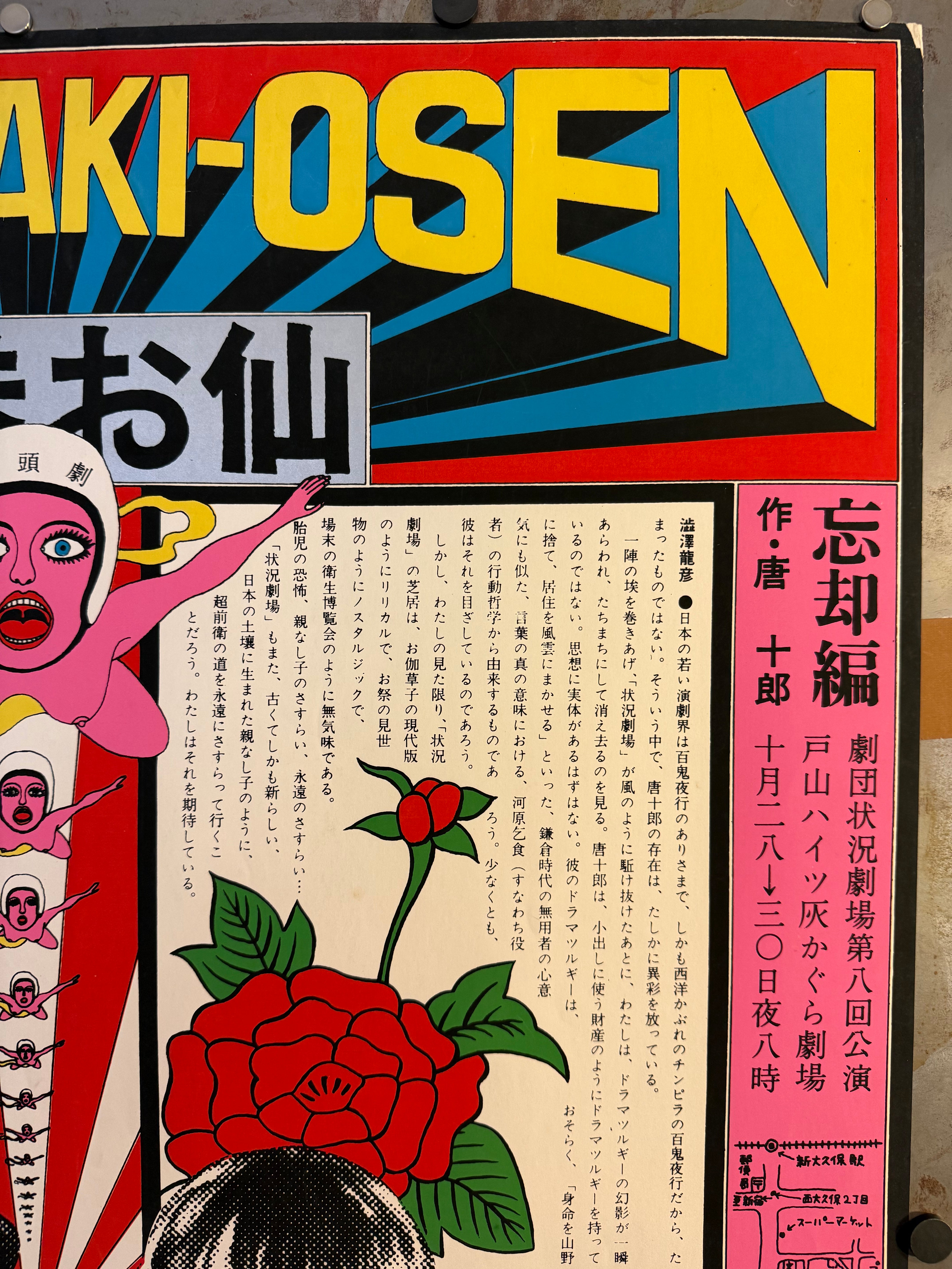 This is an original Japanese silk screen poster printed in 1966 for the legendary avant‑garde theatre troupe Jokyo Gekijo’s inaugural production Koshimaki‑Osen: Bokyaku‑hen (“Osen in Petticoats – Oblivion Chapter”). Only around one hundred impressions are believed to have been produced, and to encounter an original example in such vibrant condition is exceptionally rare. With its explosive rays of colour, collaged photographic halftones and erotic peach motif, this is one of Yokoo’s most famous and instantly recognisable images – regularly reproduced in books, exhibitions and press features on post‑war Japanese design.