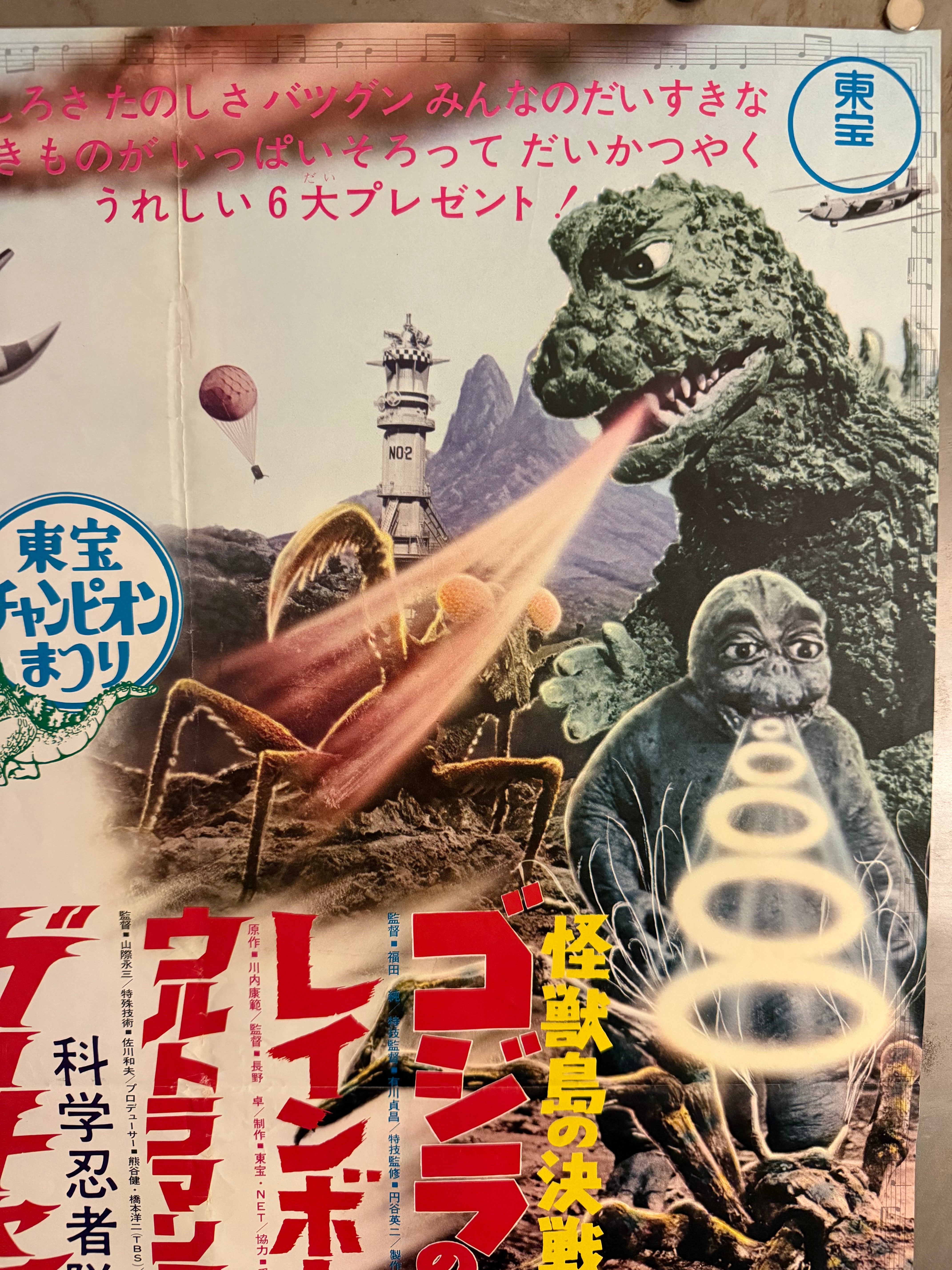 This is an original Japanese B2 poster printed in 1973 for Toho’s Champion Festival kids’ program, headlined by a re-issue of Son of Godzilla and co-billed with Rainbowman, Ultraman Taro, and Science Ninja Team Gatchaman—a dream lineup of early-’70s tokusatsu and anime heroes.