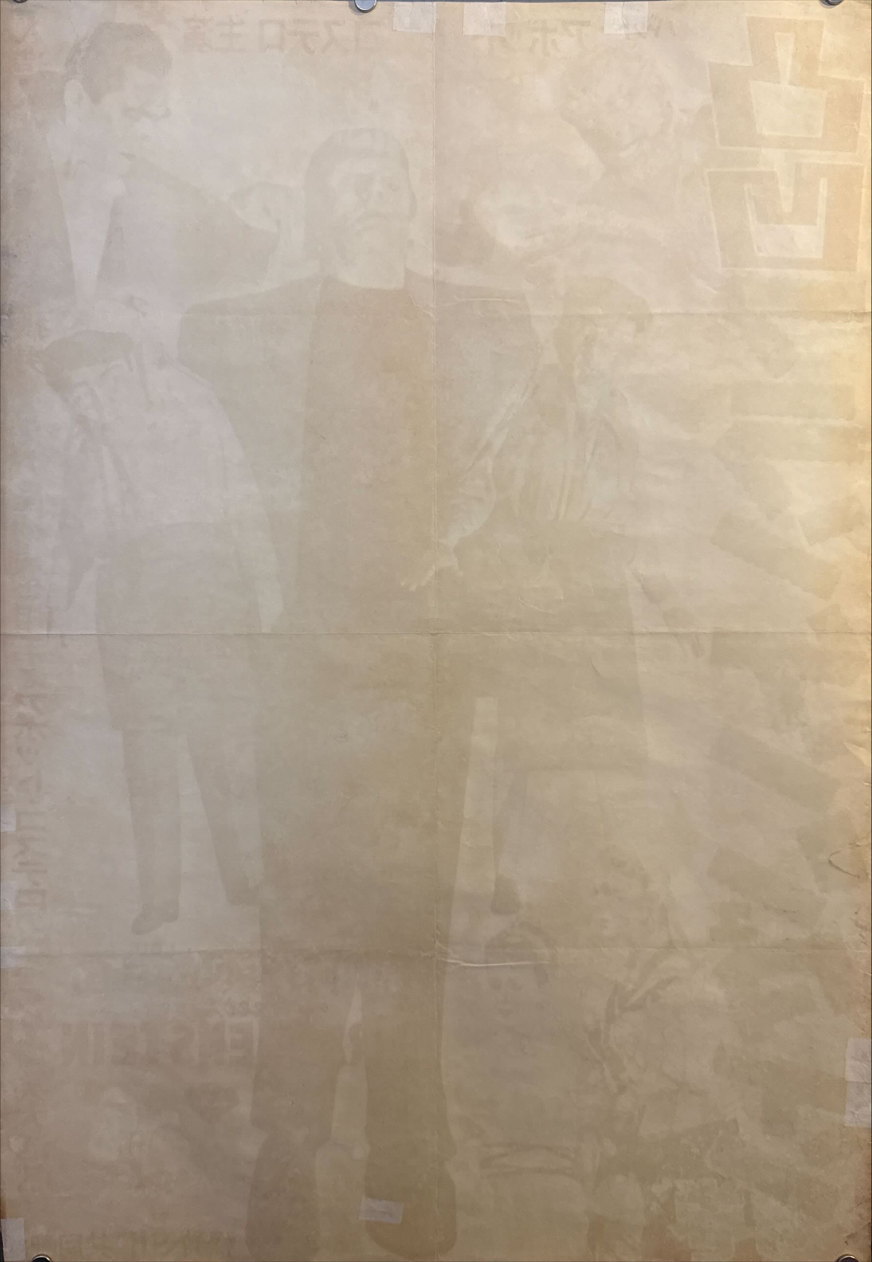 Folds: As typical for 1950s Japanese B2 posters, this poster was folded and subsequently stored flat for decades; a vertical and a horizontal fold create a cross pattern. Fold lines are lightly toned and softly creased but remain stable, with only the faintest stress at intersections and no significant separations.