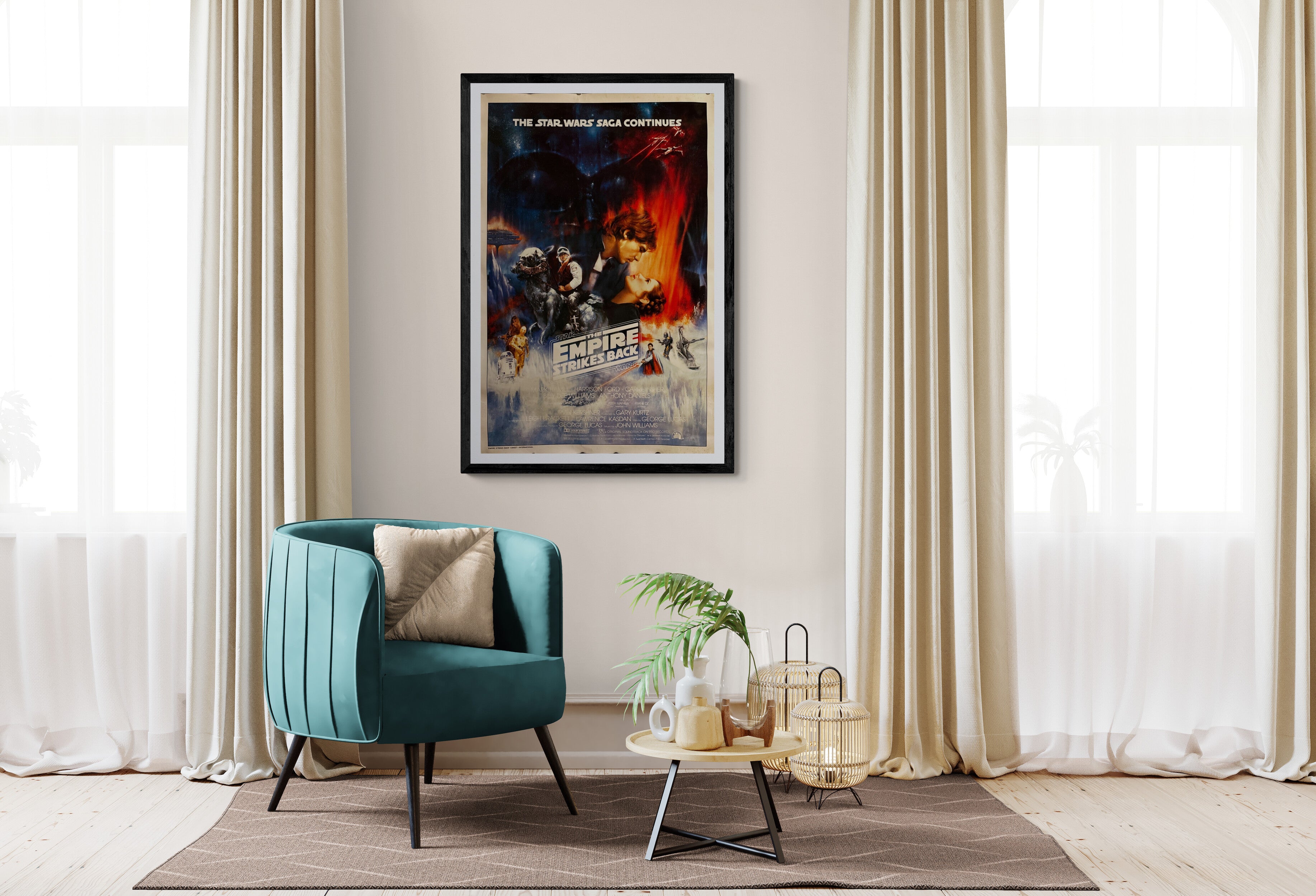 The film itself needs little introduction. Released by Twentieth Century‑Fox in 1980 and directed by Irvin Kershner from a story by George Lucas, The Empire Strikes Back was the second film issued in the Star Wars series and is now frequently cited as both the finest entry in the saga and one of the greatest sequels in cinema history. Its darker tone, groundbreaking visual effects and unforgettable narrative turns—culminating in Darth Vader’s revelation of his true relationship to Luke—have ensured the film’s enduring cultural resonance, making top‑tier original advertising material such as this poster exceptionally desirable.