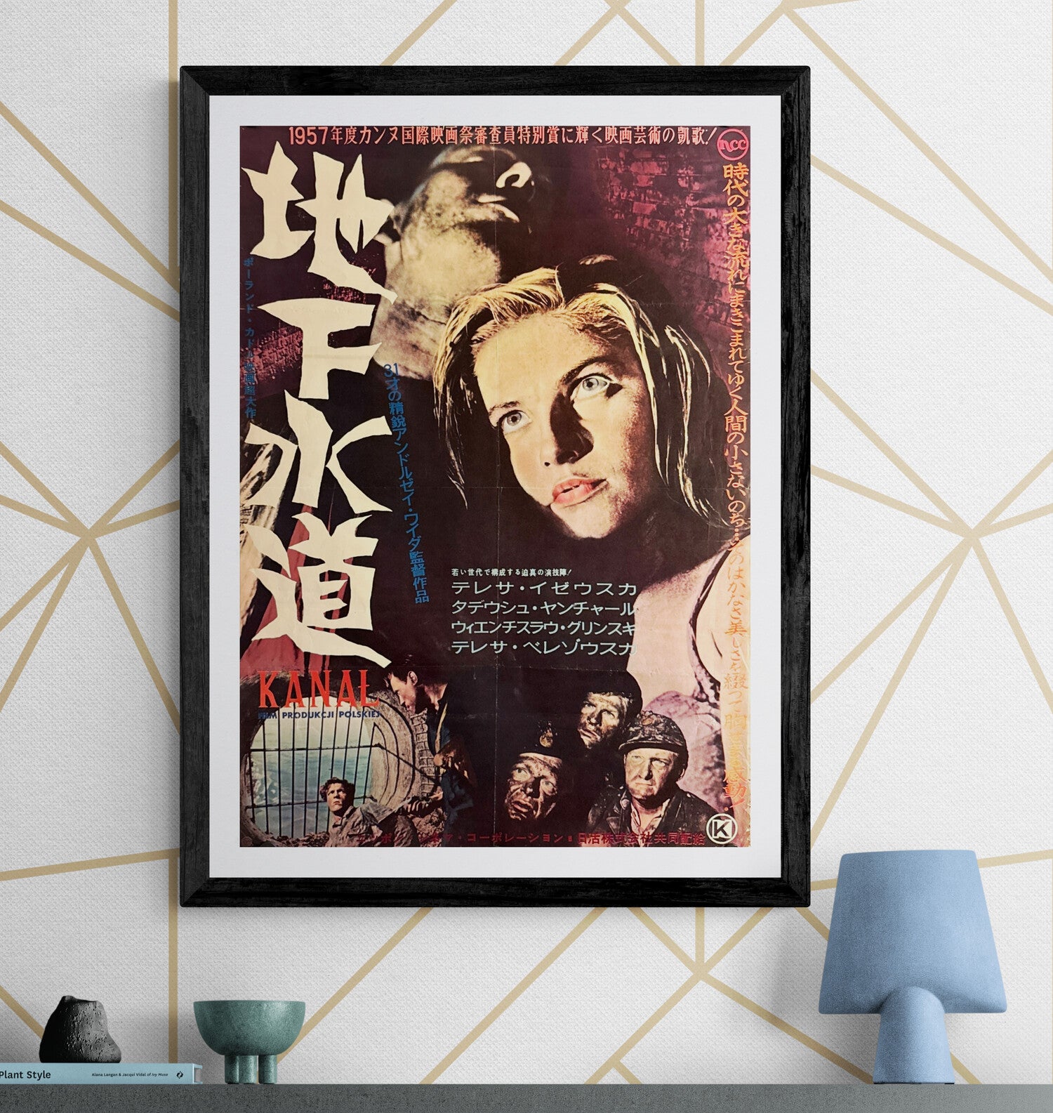 A powerful late-’50s photo-montage: a stark white brush-stroke title 「地下水道」 slices down the left while a luminous close-up of Teresa Izewska dominates the right, her face caught between hope and shadow. Below, mud-streaked fighters crouch beside a sewer grate vignette; bilingual “KANAL” titling and studio marks anchor the base. The palette of bruised magentas, petrol blues, and soot-black textures amplifies the film’s claustrophobic tragedy.