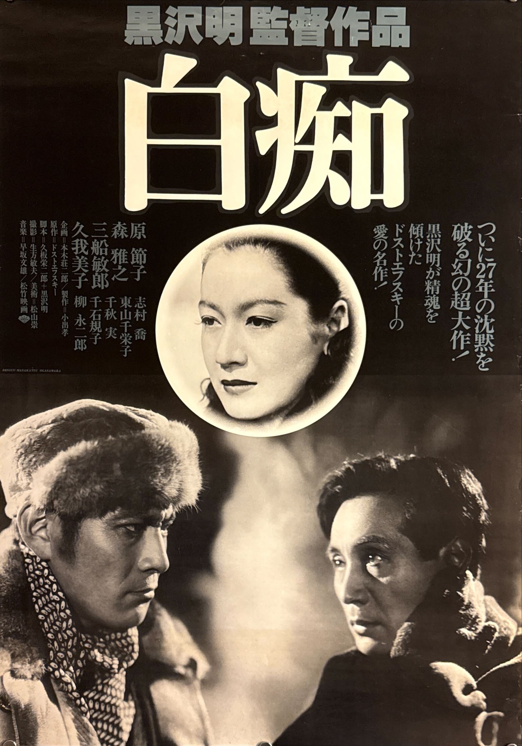 This is an original Japanese B2 theatrical poster printed for a 1978 re-release of Akira Kurosawa’s The Idiot (白痴)—Kurosawa’s ambitious, large-scale adaptation of Fyodor Dostoevsky’s novel. Notably, the copy on the poster references the film’s long absence from circulation (“27 years of silence”), aligning with a late-1970s revival campaign for this title.