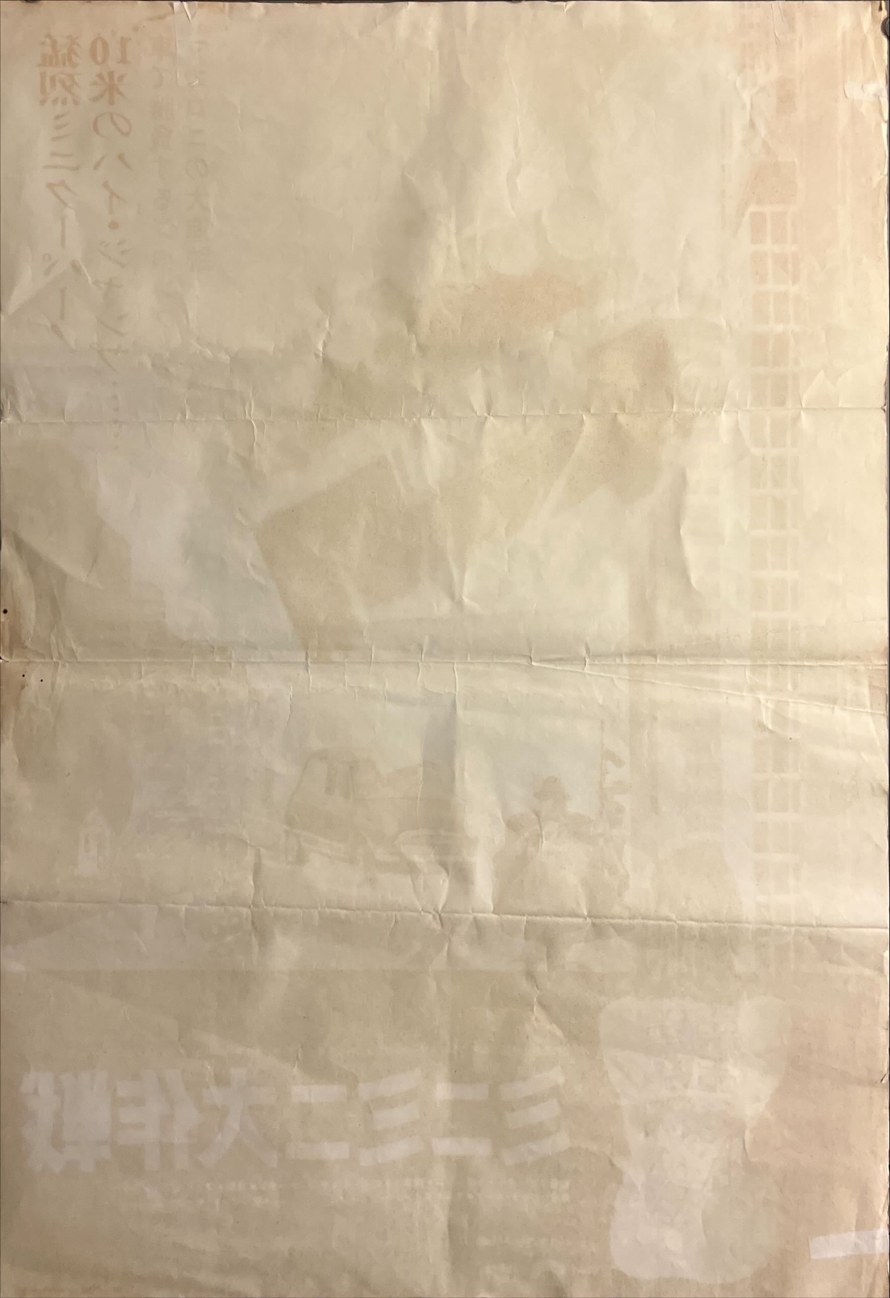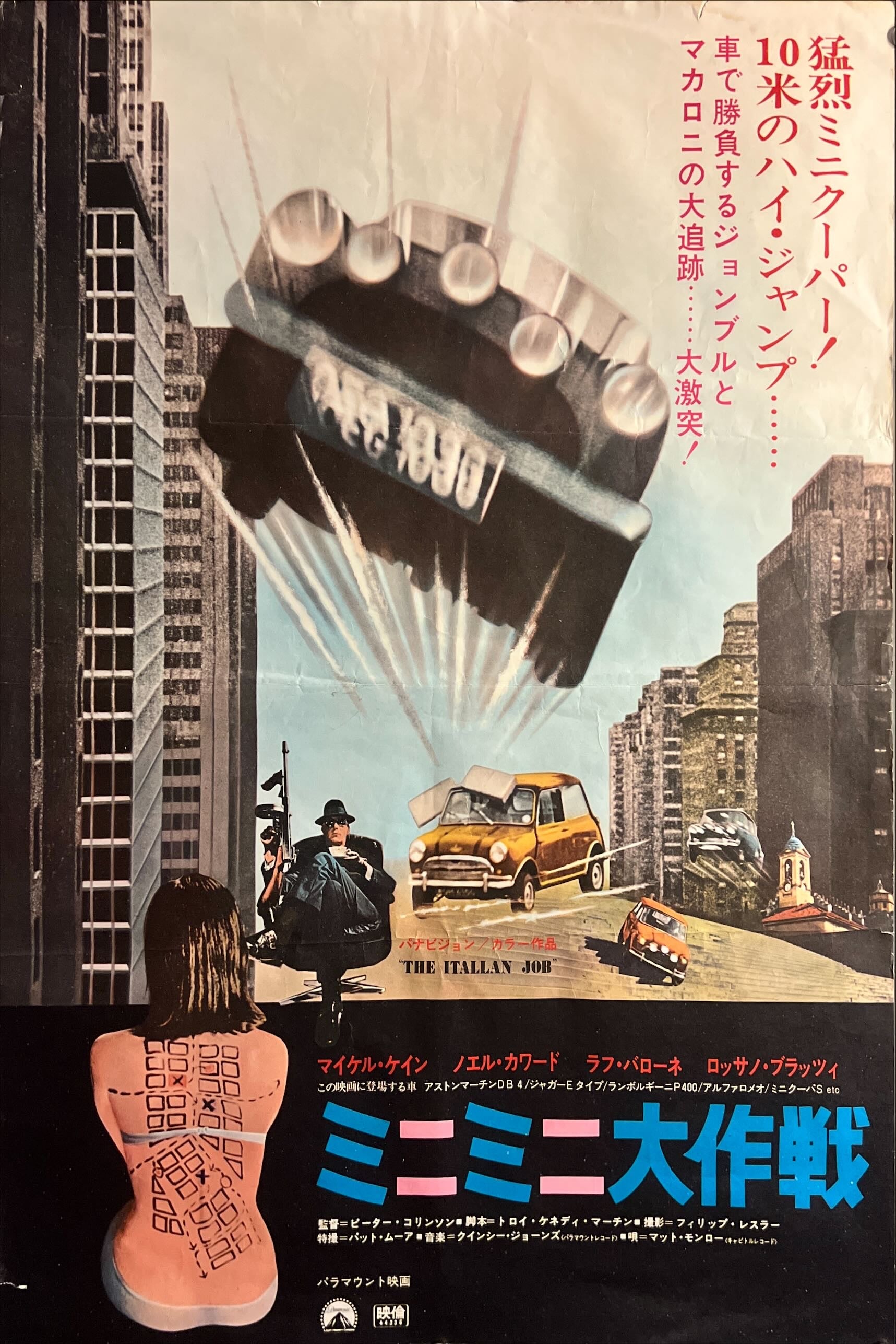 A kinetic, collage-style design that captures pure motion: a Mini launches off a ramp toward the viewer, tire tracks streaking across a stylized city canyon while other Minis slalom below. At lower left, the cheeky motif of a tattooed “map back” nods to the gang’s intricate plan; a seated gunman and Croker’s mod silhouette add underworld cool. The bold title 「ミニミニ大作戦」 pops in cyan and pink against a black band carrying the bilingual credit block (Paramount release, 映倫 seal), with “THE ITALIAN JOB” printed in English at center.