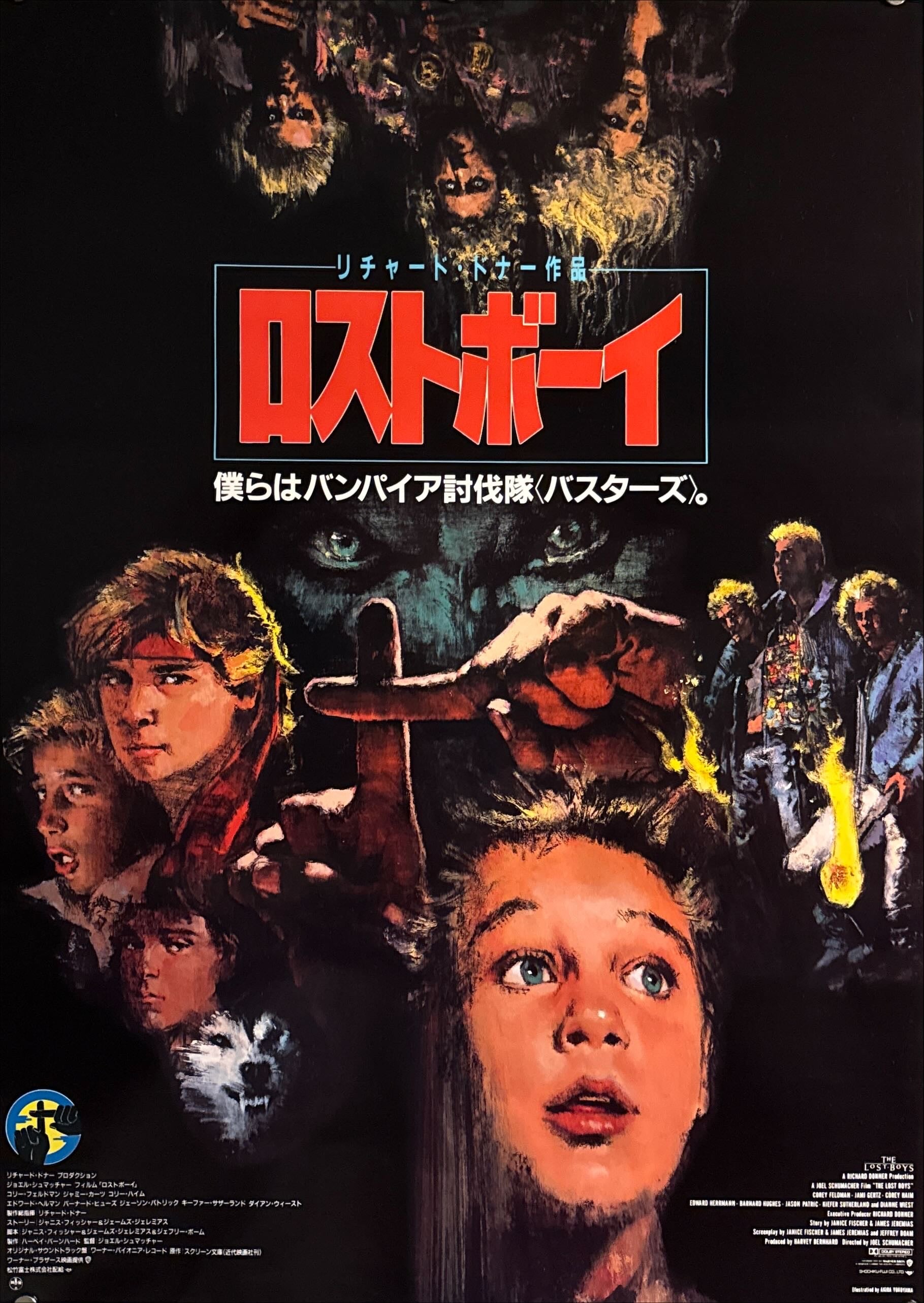 A superb, painterly Japanese composition that leans hard into gothic menace and teen-nightmare glamour. Against a deep black field, the title 「ロストボーイ」 hits in bold red, framed by eerie portrait clusters: a looming, shadowy “vampire gaze” in the centre, the Frog Brothers and the teen leads rendered in dramatic highlights, and a cruciform stake/weapon silhouette cutting through the darkness. The right side stages the vampire gang in a cold, spectral procession, while the overall palette—inky blacks, electric reds, and sickly nocturnal tones—captures the film’s exact mood: boardwalk neon, bloodlust, and adolescent danger. It’s one of those Japanese one-sheets that reads like an artwork first and a poster second—exceptionally displayable and instantly iconic on the wall.