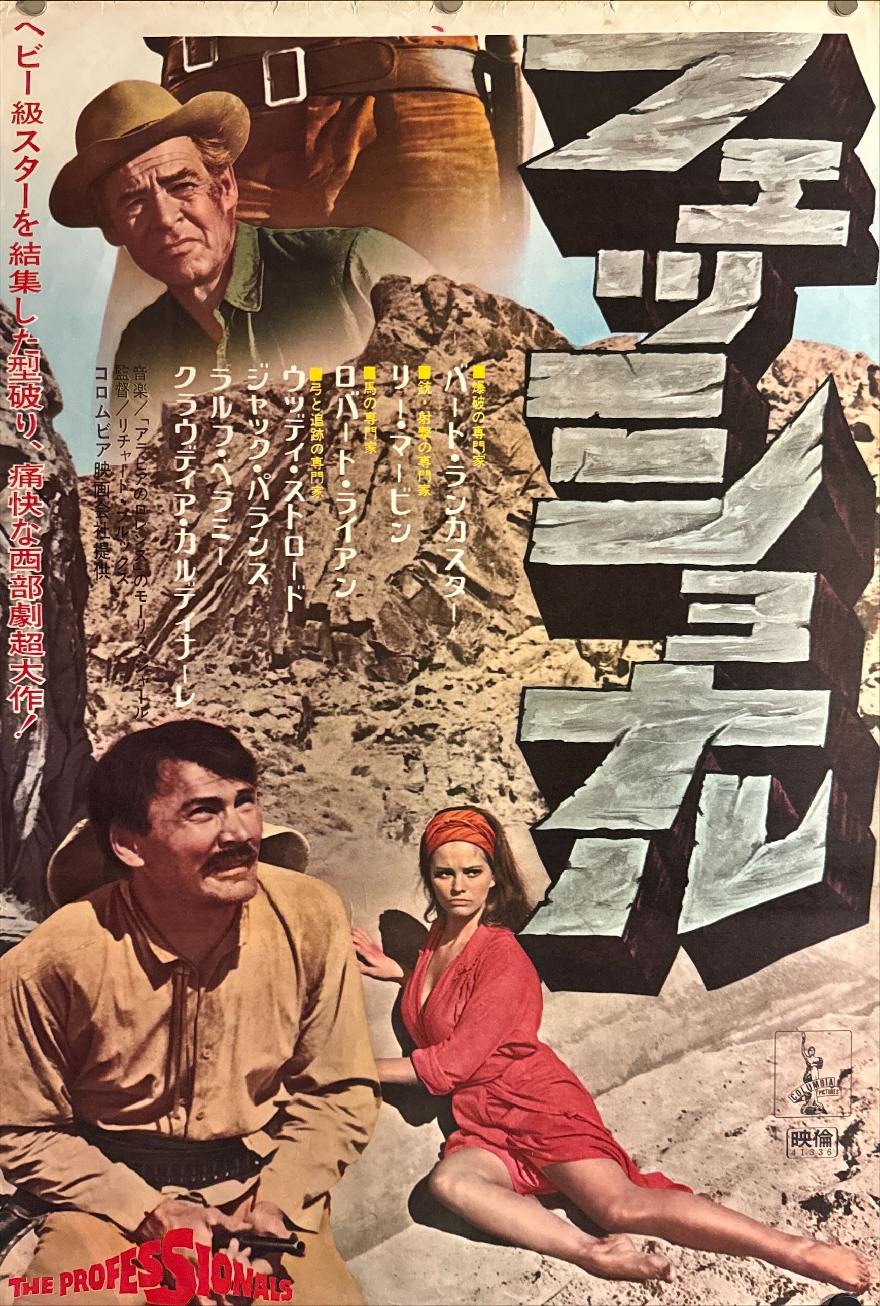 This is an original Japanese STB printed in 1966 for the first Japanese release of Richard Brooks’ The Professionals, distributed by Columbia (コロムビア). Japan opened the film on 1966‑12‑17; the sheet carries the Eirin seal consistent with first‑issue material.