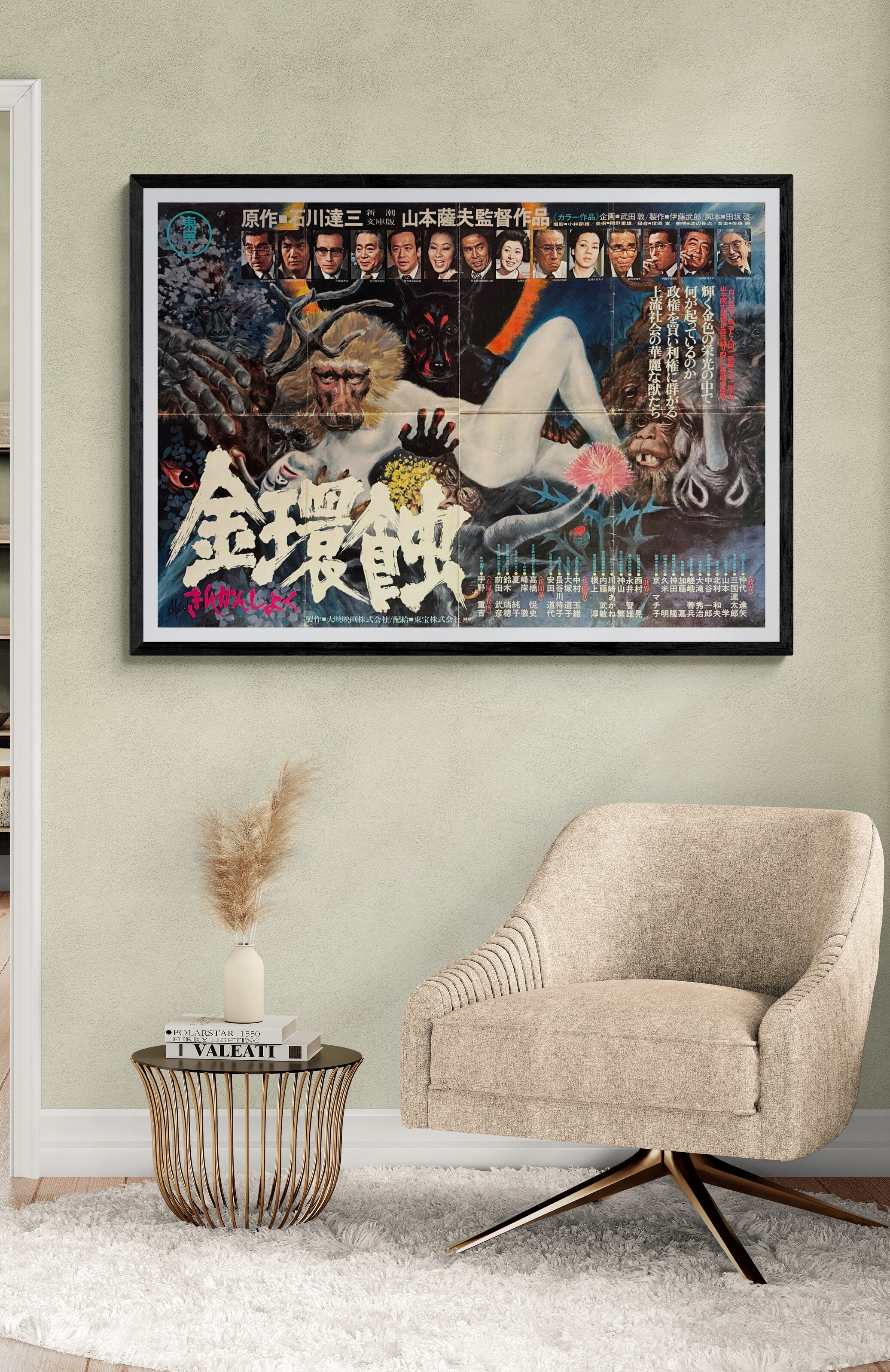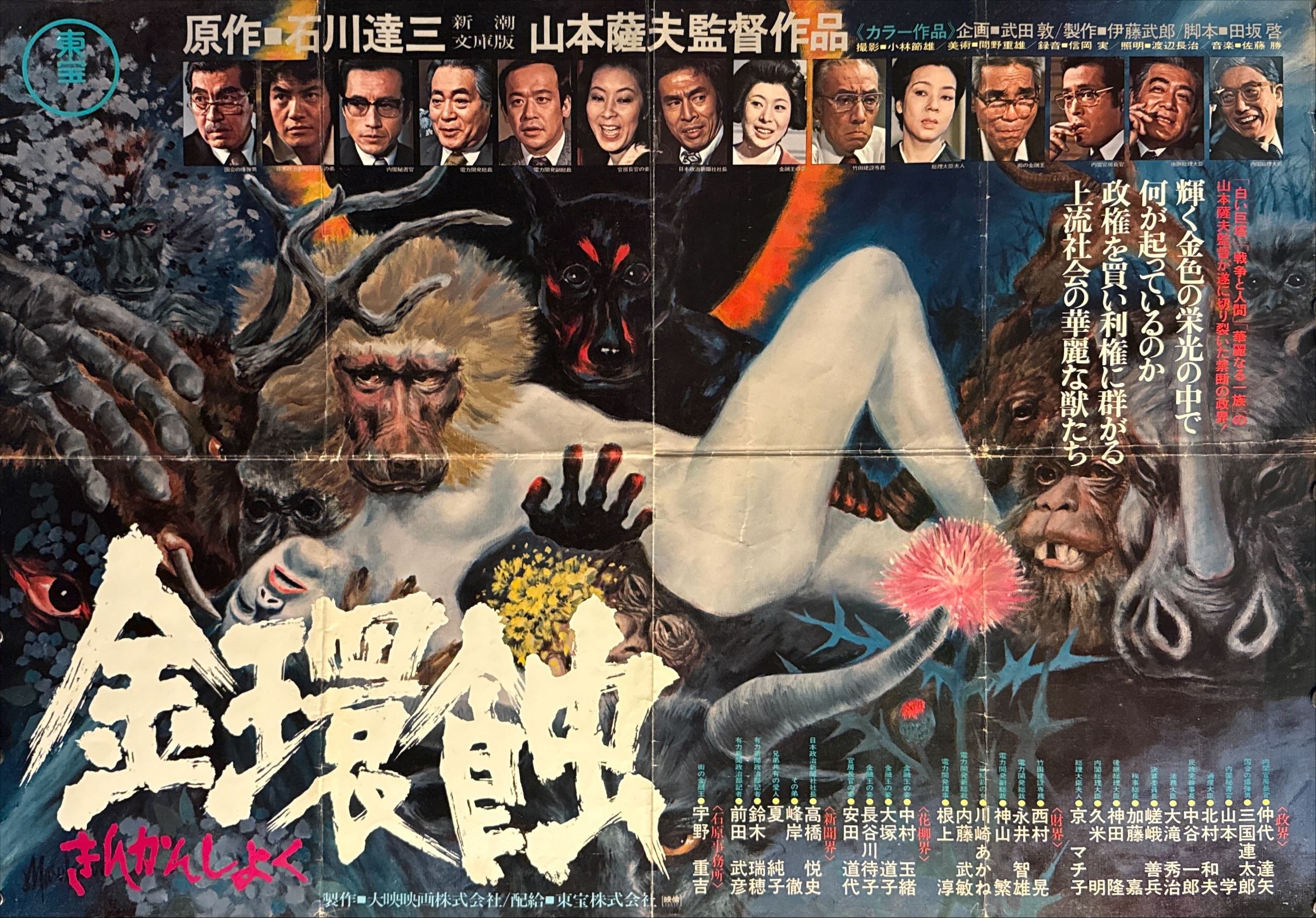 Original Japanese B1 poster (c.71 × 103 cm) for Satsuo Yamamoto’s political thriller Kinkanshoku (金環蝕, 1975)—also known as Solar Eclipse—based on Tatsuzō Ishikawa’s novel. Artwork and title lettering by Susumu Masukawa (益川進), whose bold, expressionist hand defined many prestige Japanese campaigns of the era. A ferocious tableau of apes and elites encircles a figure at the center—an unforgettable critique of power and corruption. First domestic release by Daiei (Toho distribution).