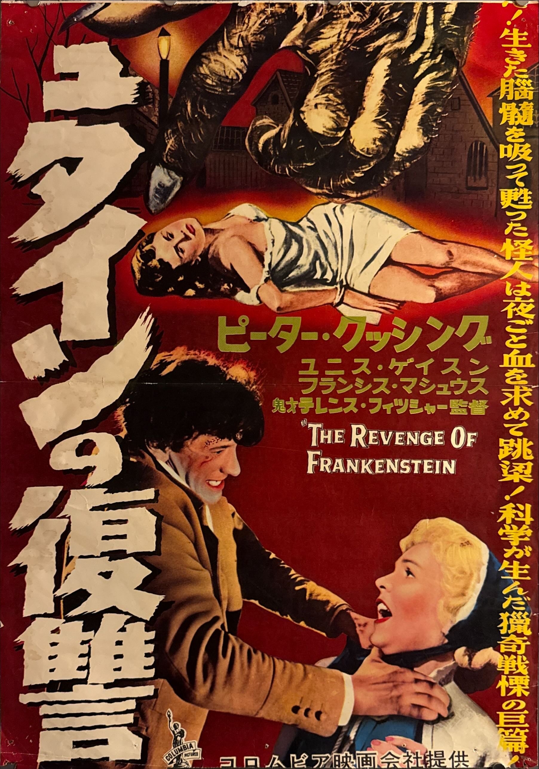 Bilingual billing block: Star names set in bright yellow katakana—ピーター・クッシング (Peter Cushing), ユニス・ゲイソン (Eunice Gayson), フランシス・マシューズ (Francis Matthews)—with the English title THE REVENGE OF FRANKENSTEIN dropped in‑frame.