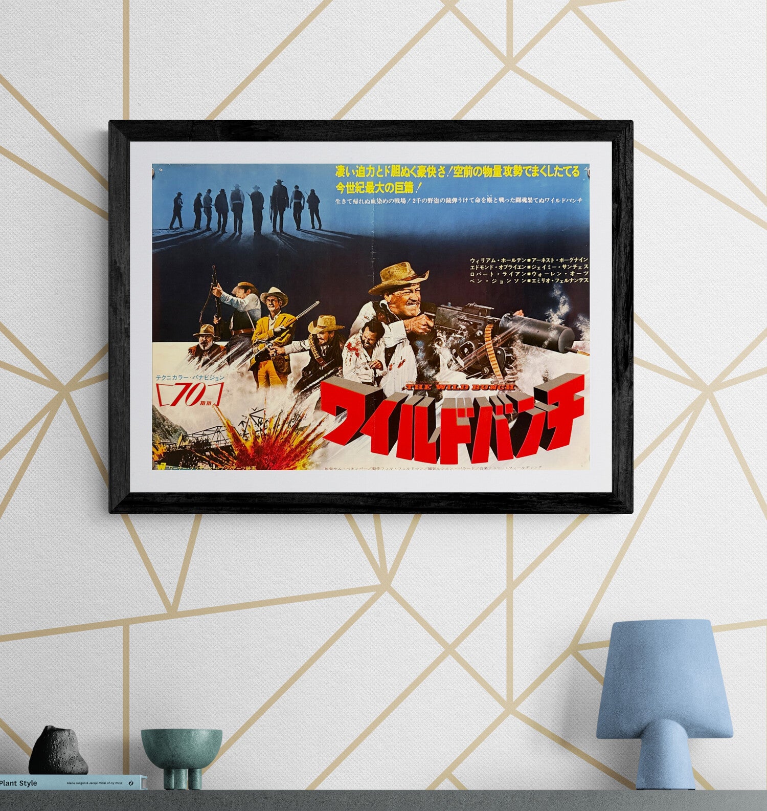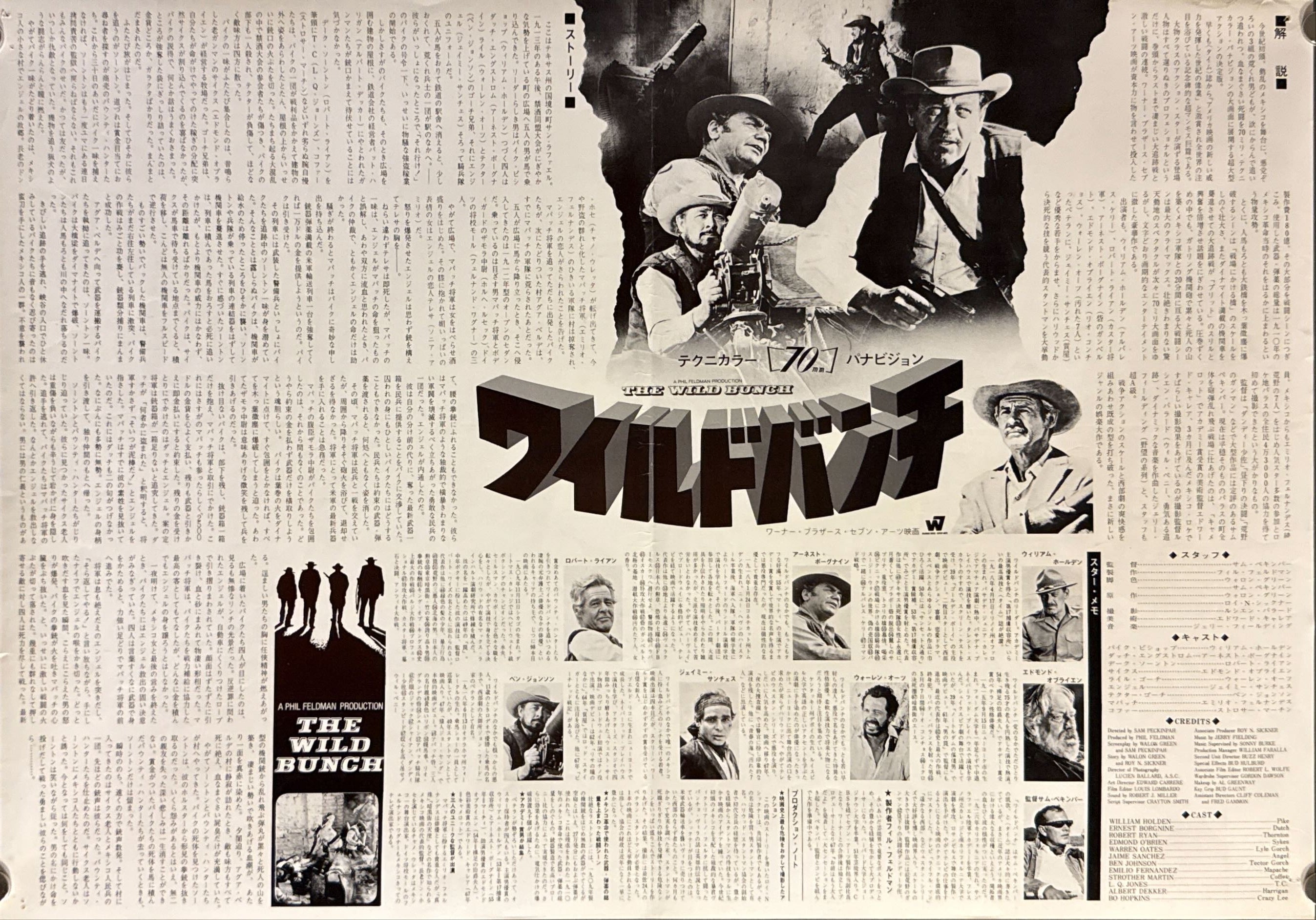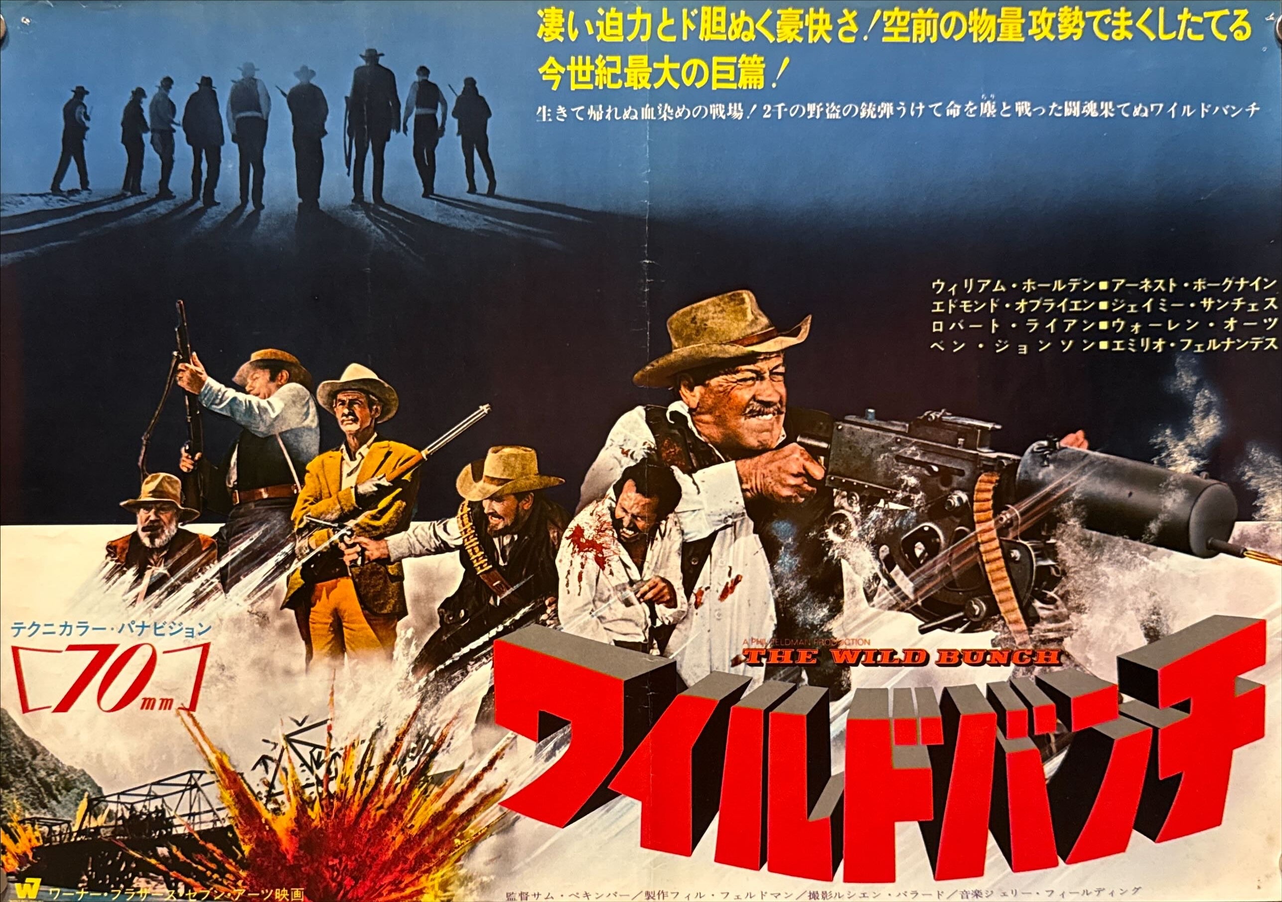 This is an original Japanese B3 poster printed in 1969 for Sam Peckinpah’s groundbreaking western The Wild Bunch—shot in Technicolor / Panavision (70mm prints) and starring William Holden, Ernest Borgnine, Robert Ryan, Edmond O’Brien, Warren Oates, Ben Johnson, and Jaime Sánchez. A watershed of modern screen violence and revisionist Western myth, it remains one of the most influential films of the era.