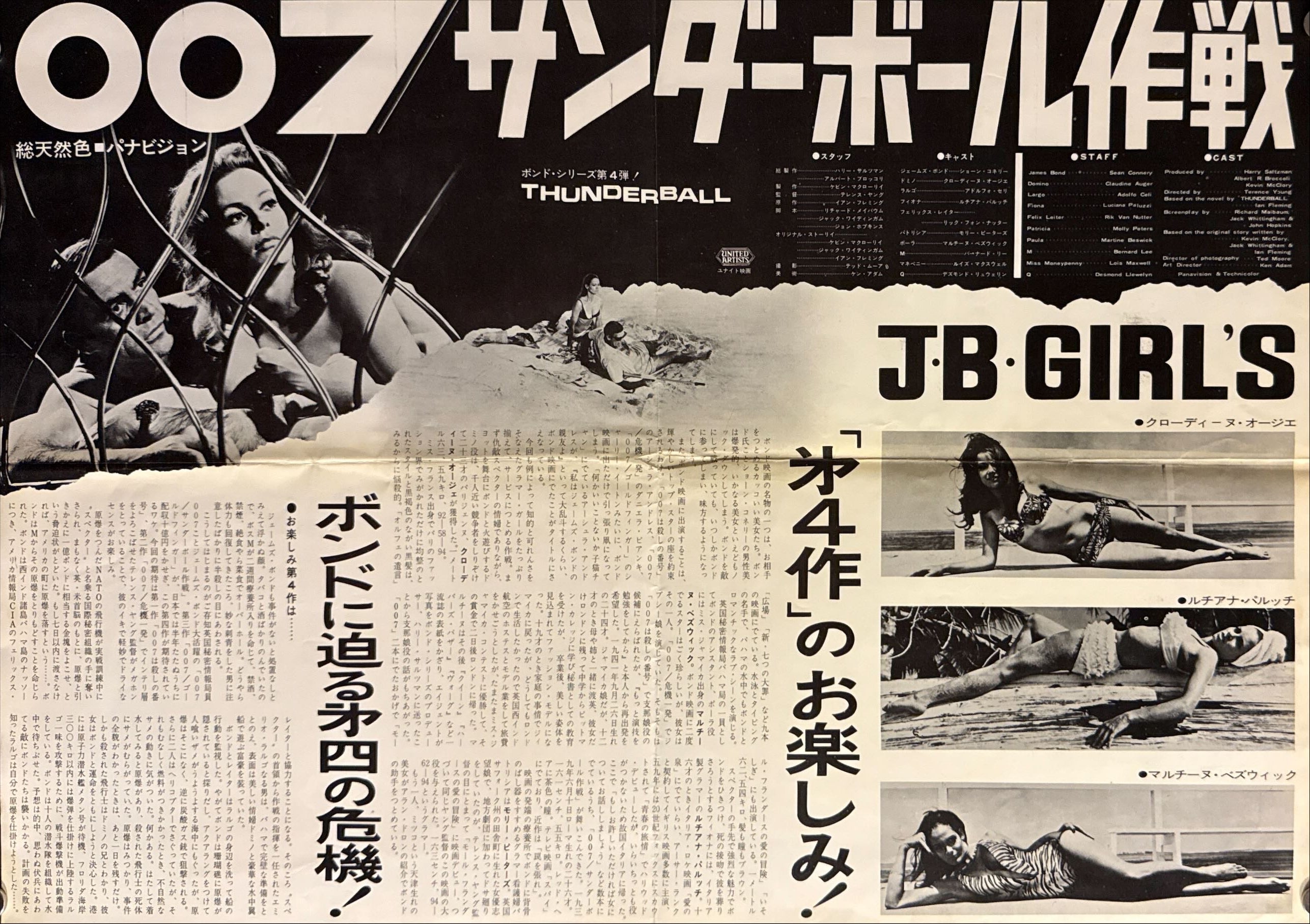 A striking monochrome tech-montage built around the bold “007” logotype and the Japanese title 「サンダーボール作戦」. Panels highlight the Aston Martin DB5, Connery’s jetpack escape, spear-gun divers, SPECTRE’s submersibles, and Q-Branch diagrams—pure mid-’60s Bond futurism with a reportage feel.