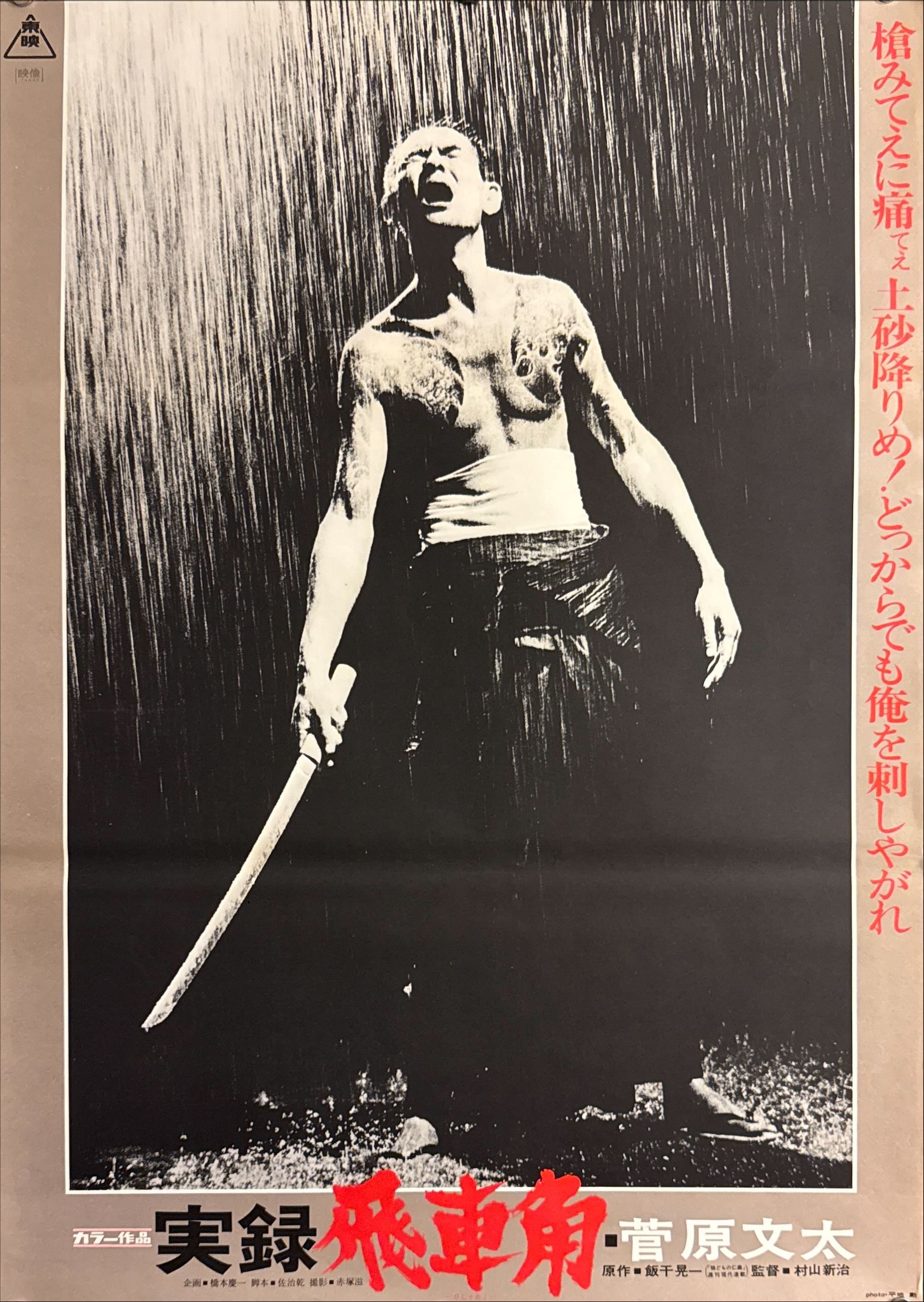 The B2 design is stark and powerful. A nearly monochrome photograph shows Sugawara’s Hishakaku standing bare‑chested in driving rain, sword at his side, head thrown back in a raw shout. The image is framed by a muted taupe border, with vertical red copy down the right edge and the film’s title “実録飛車角” slashed across the bottom in vivid red brushstrokes. The simplicity of the layout focuses all attention on the central figure’s fury and desperation.