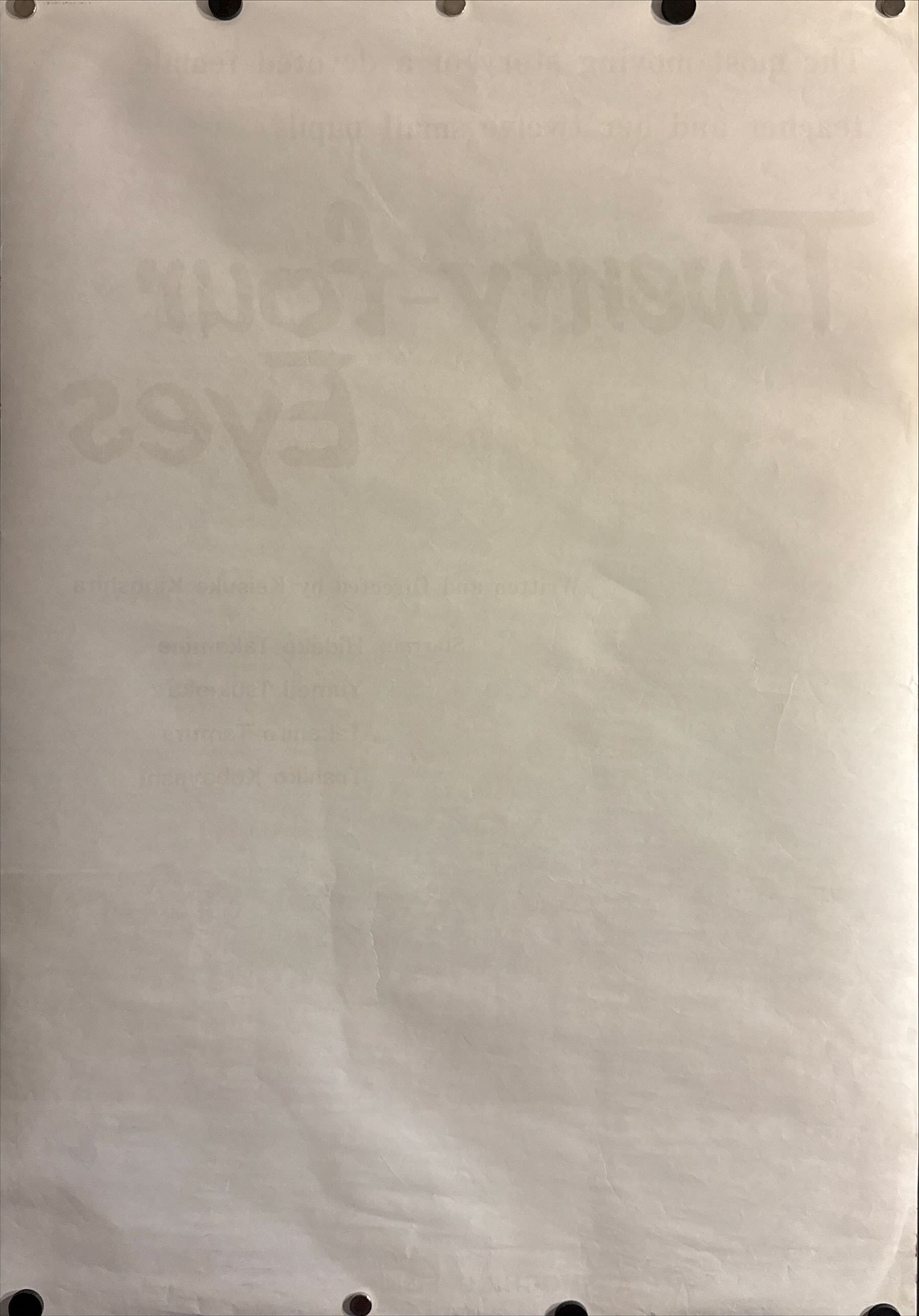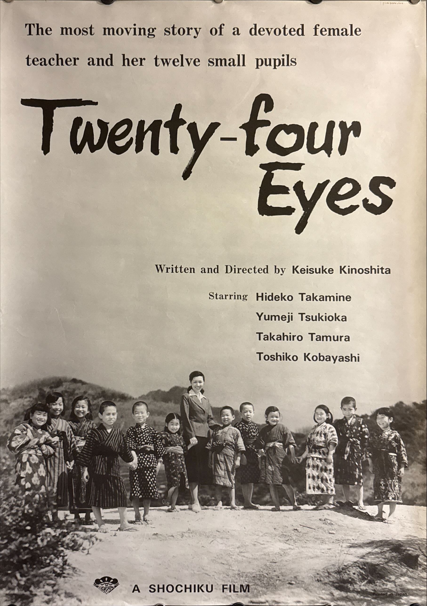 A rare and highly evocative English-language roadshow design—minimal, elegant, and deeply cinematic. The sheet is dominated by expressive brush-style typography reading TWENTY-FOUR EYES, paired with the poignant English tagline at the top: “The most moving story of a devoted female teacher and her twelve small pupils.” The lower half features a beautiful black-and-white photographic image of Takamine standing with the children against a coastal landscape—simple, documentary-like, and emotionally direct. With “A SHOCHIKU FILM” at the bottom and “Printed in Japan” noted, this is a scarce international-facing Japanese issue that presents the film with understated prestige—exceptionally frame-friendly in a modern or gallery setting.