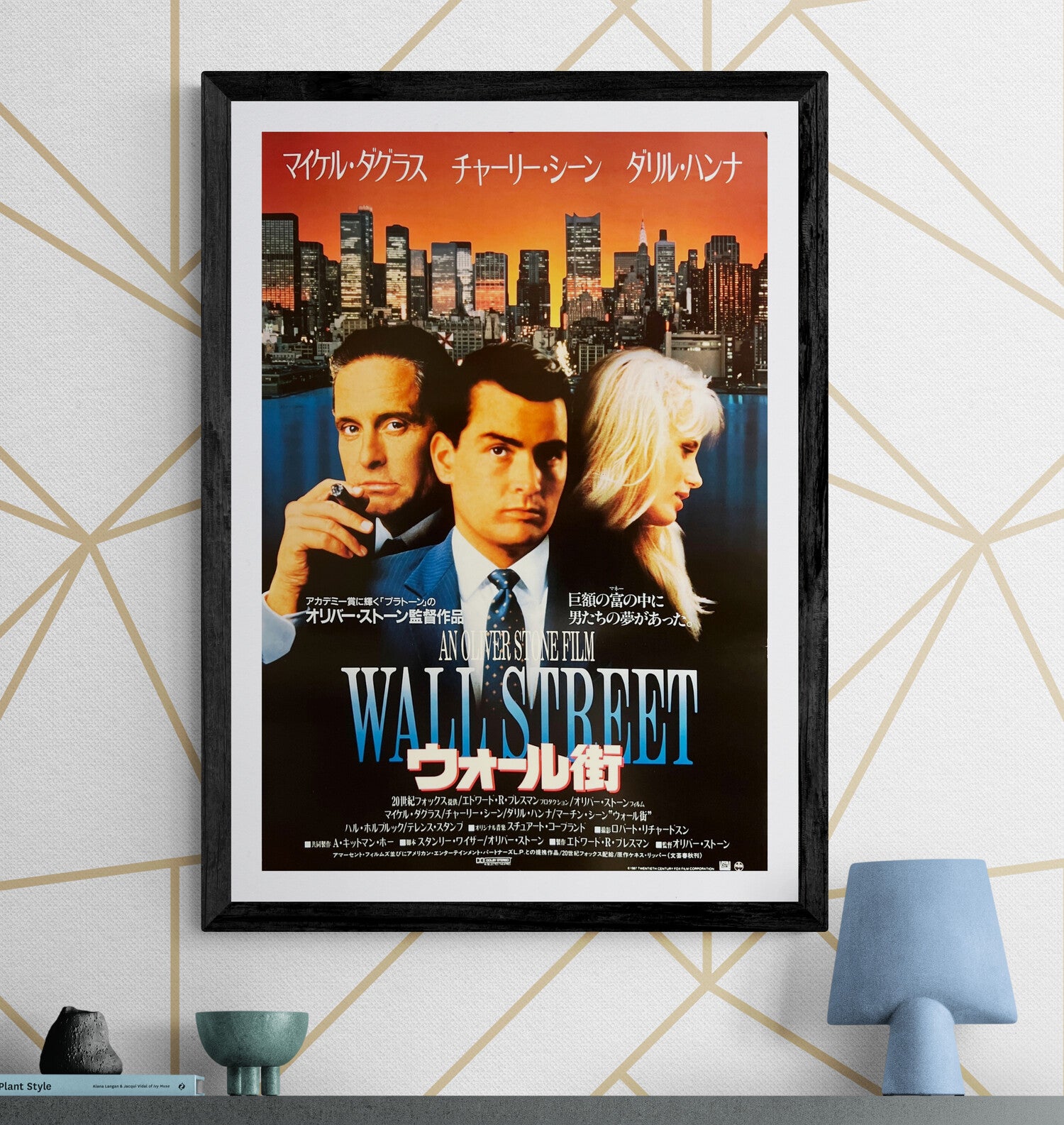 This is an original Japanese B2 theatrical poster for Wall Street, Oliver Stone’s 1987 drama about ambition, insider trading and 1980s excess. The film stars Michael Douglas as corporate raider Gordon Gekko and Charlie Sheen as hungry young broker Bud Fox, with Daryl Hannah and Martin Sheen in key supporting roles.