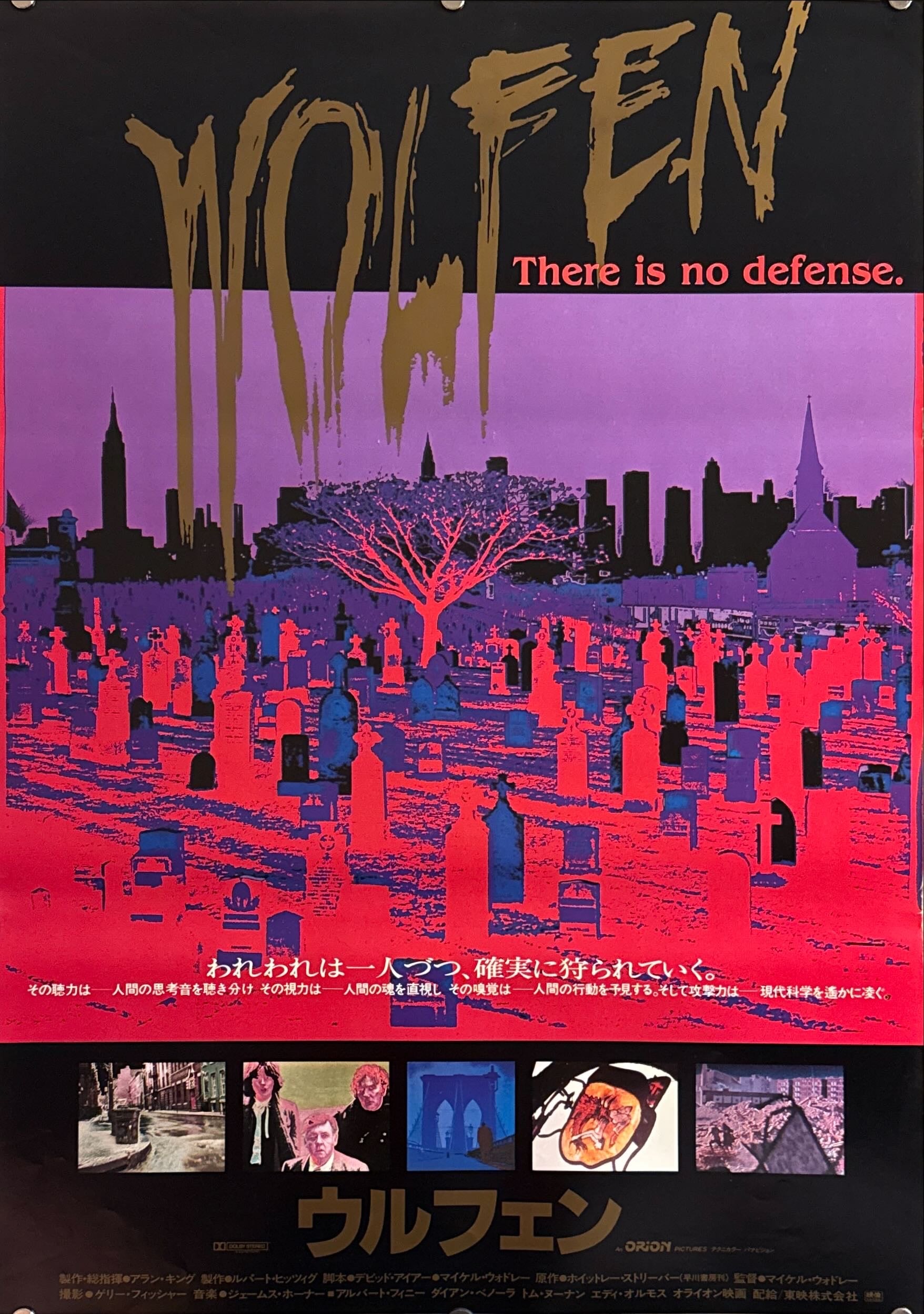 A superb, design-forward Japanese campaign built around graphic colour violence and stark typographic force. The sheet is dominated by a shocking, high-contrast cemetery panorama—headstones rendered in electric reds and blues beneath a purple sky—set against a black skyline silhouette that reads unmistakably as New York. A single tree burns in neon red at the centre like a warning flare. Above, the title WOLFEN slashes across the top in dripping, claw-like gold lettering, paired with the English tagline “There is no defense.”—a perfect minimalist threat. Along the bottom margin, a strip of small film stills functions like a storyboard of dread (urban streets, faces, the Brooklyn Bridge, the creature POV imagery), while the Japanese title 「ウルフェン」 anchors the base in bold type. The overall effect is strikingly contemporary—part poster, part modern art print—making this one of the most displayable Japanese horror B2s of the period.
